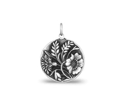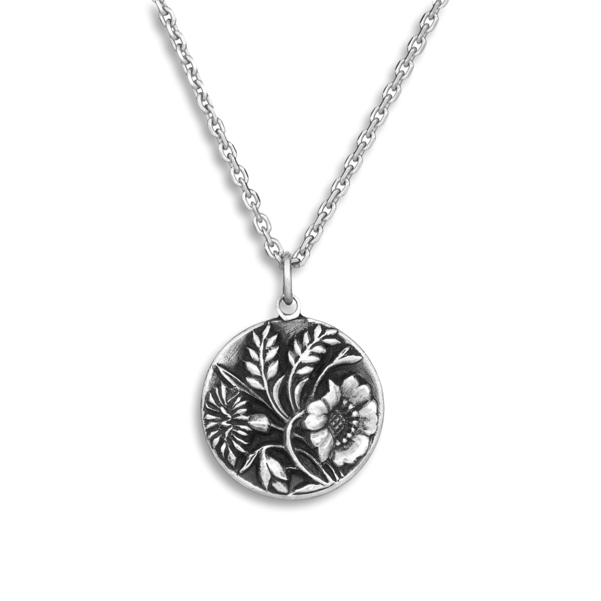 This beautiful round pendant features hand-carved anemone flowers and wheat, which signify anticipation and life. Due to their wild nature, anemones are a reminder to be in the moment and take a chance when presented with one.