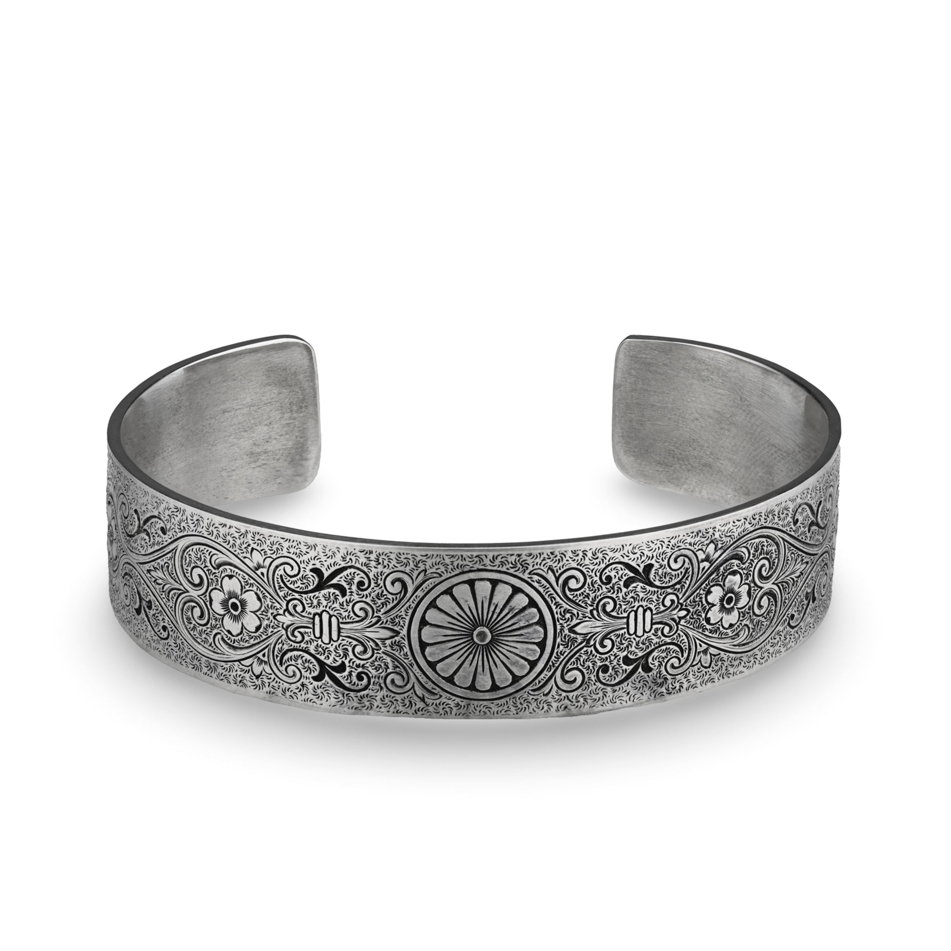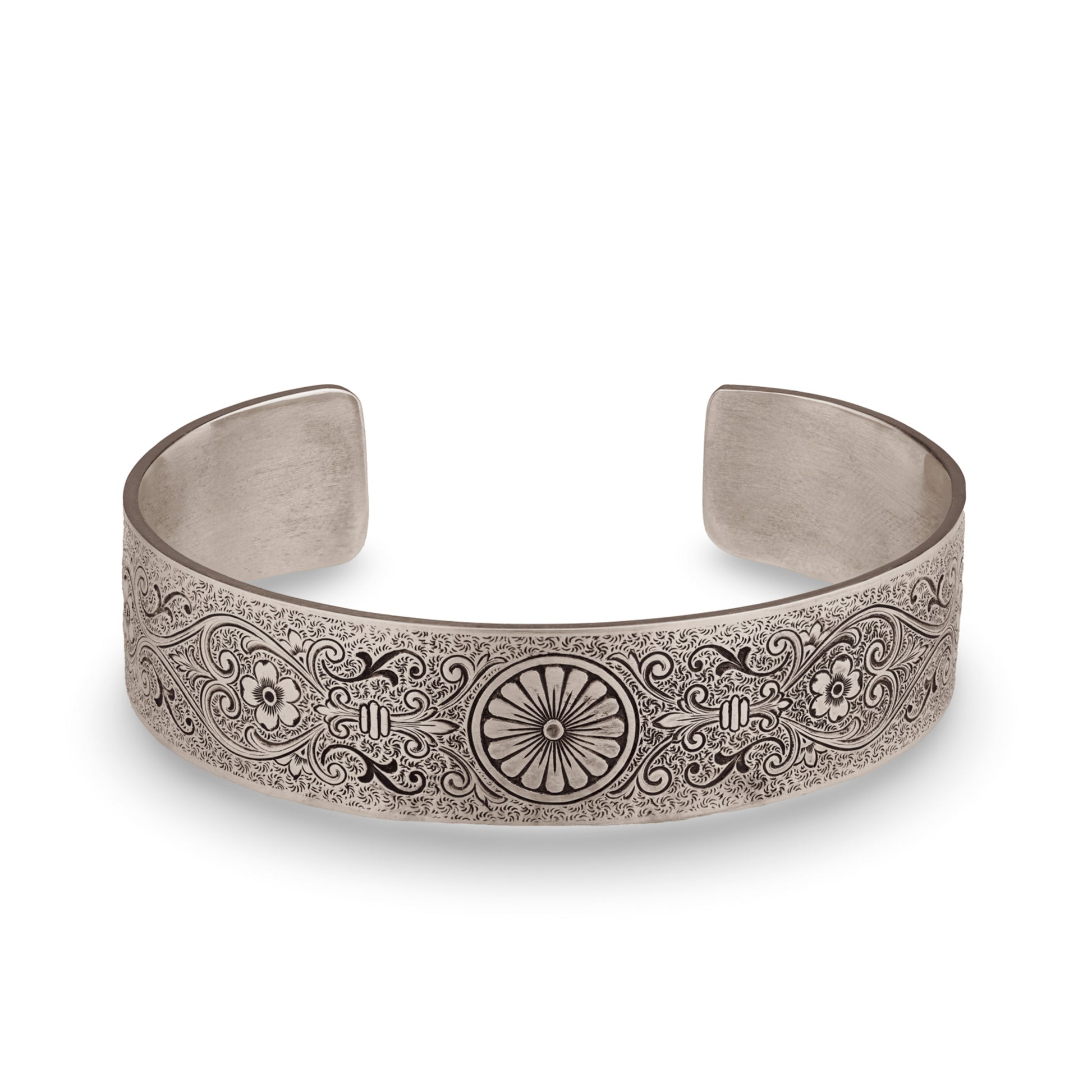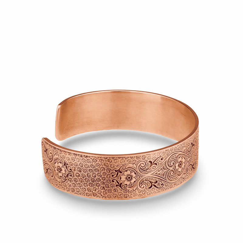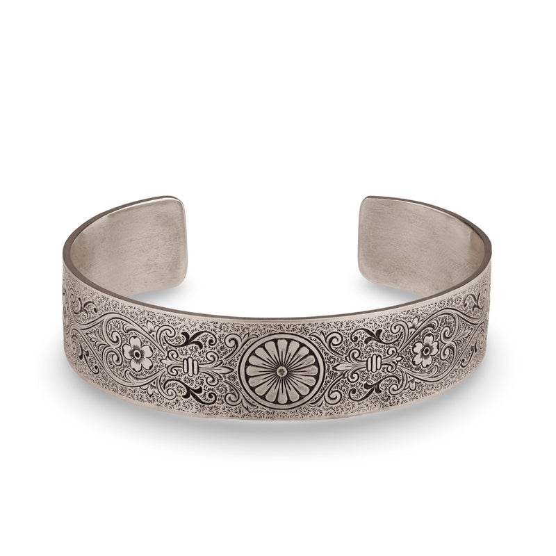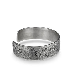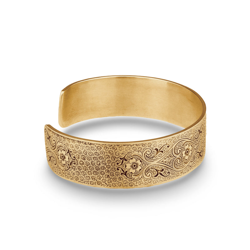 The Chrysanthemum Daisy engraved on this Victorian, wide, engraved, rolled cuff bracelet symbolizes innocence, cheer and all things blissful. Fleur-de-lis, Anemone Flowers, Scrolling Hearts, and Acanthus Leaves add messages of honor, truth, protection, and eternal love. The ends of the bracelet are rolled and set with four, 4.5mm gemstones.