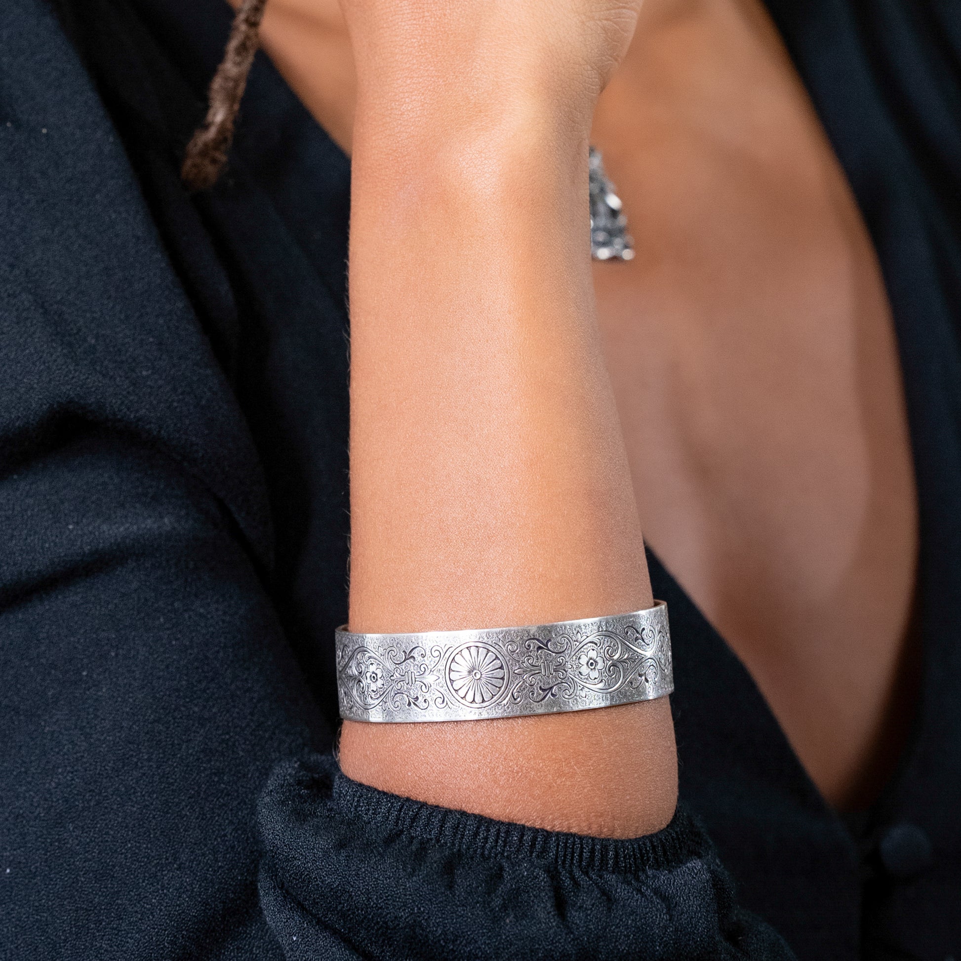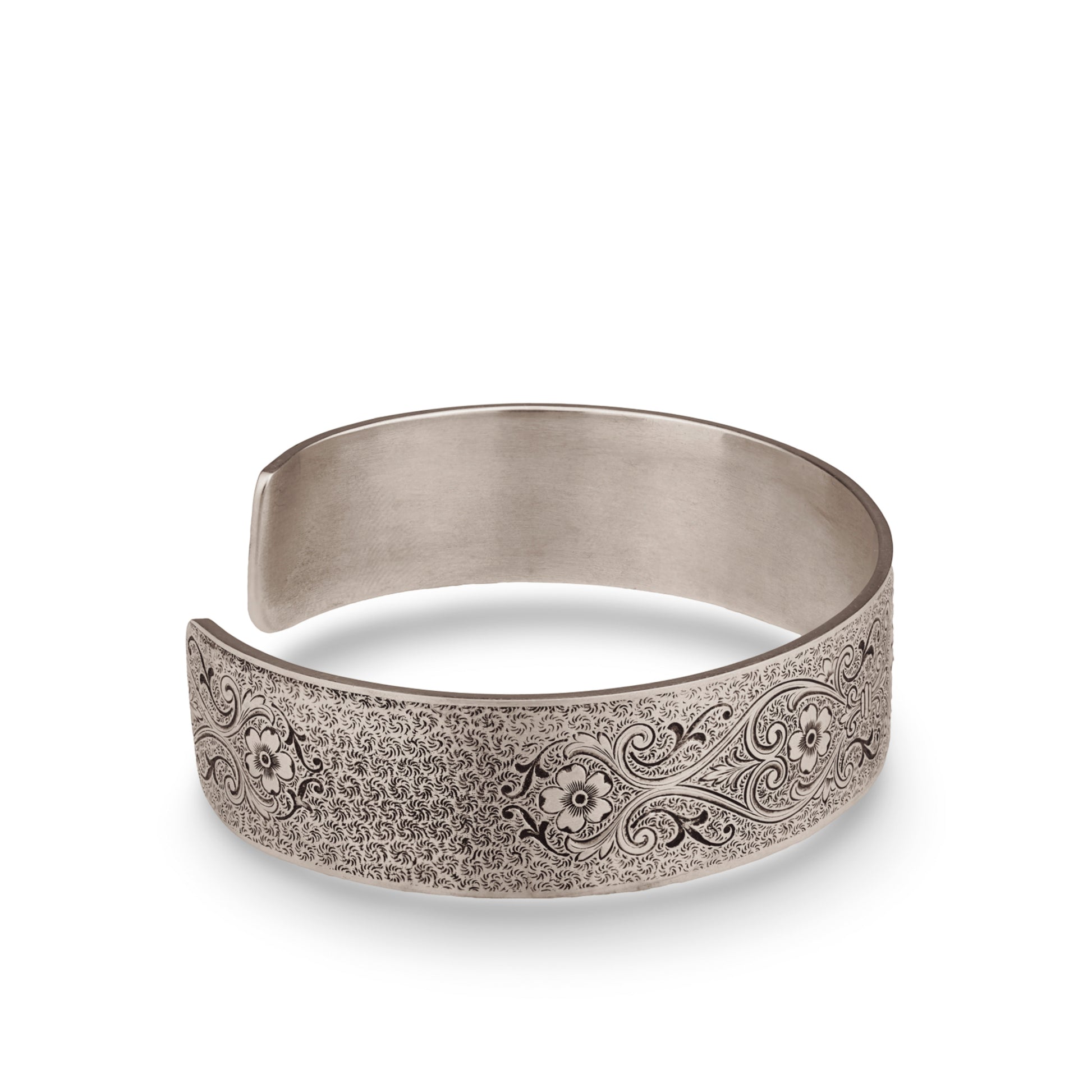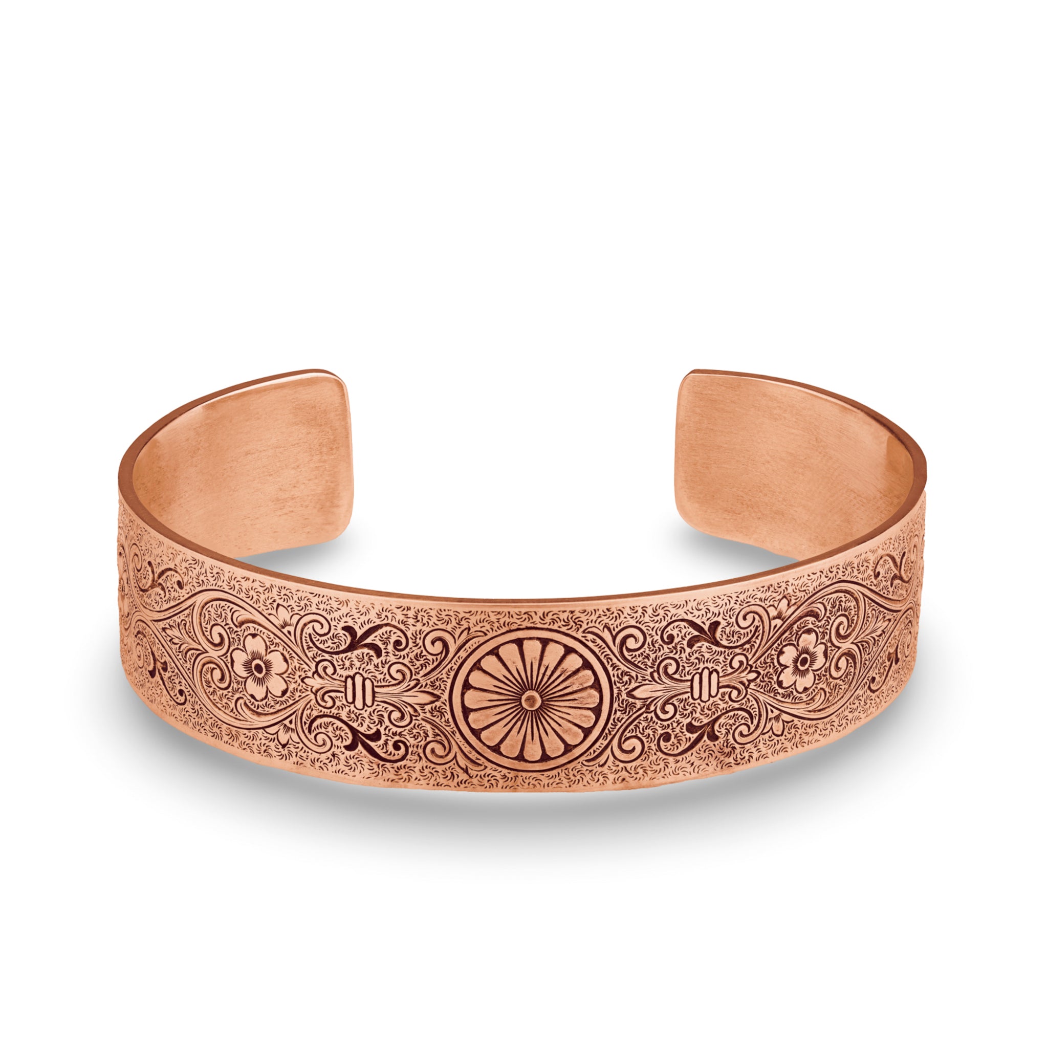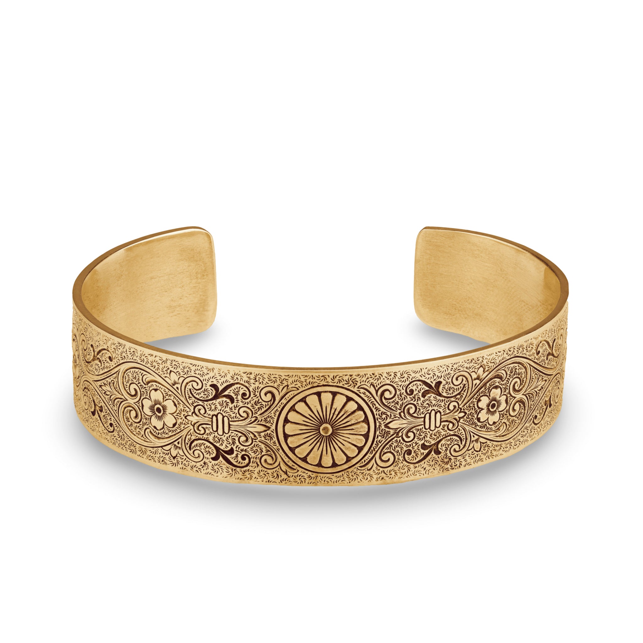 The Chrysanthemum Daisy engraved on this Victorian, wide, engraved, rolled cuff bracelet symbolizes innocence, cheer and all things blissful. Fleur-de-lis, Anemone Flowers, Scrolling Hearts, and Acanthus Leaves add messages of honor, truth, protection, and eternal love. The ends of the bracelet are rolled and set with four, 4.5mm gemstones.