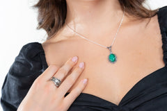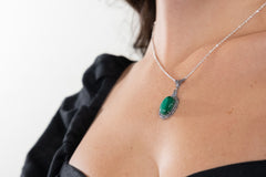 Embellished with a beautiful forget-me-not, Constancy's pendant exudes true love and respect. The malachite, symbolizing fortune and abundance, completes the piece. This stunning combination evokes a sense of luxury and lasting sentimentality.