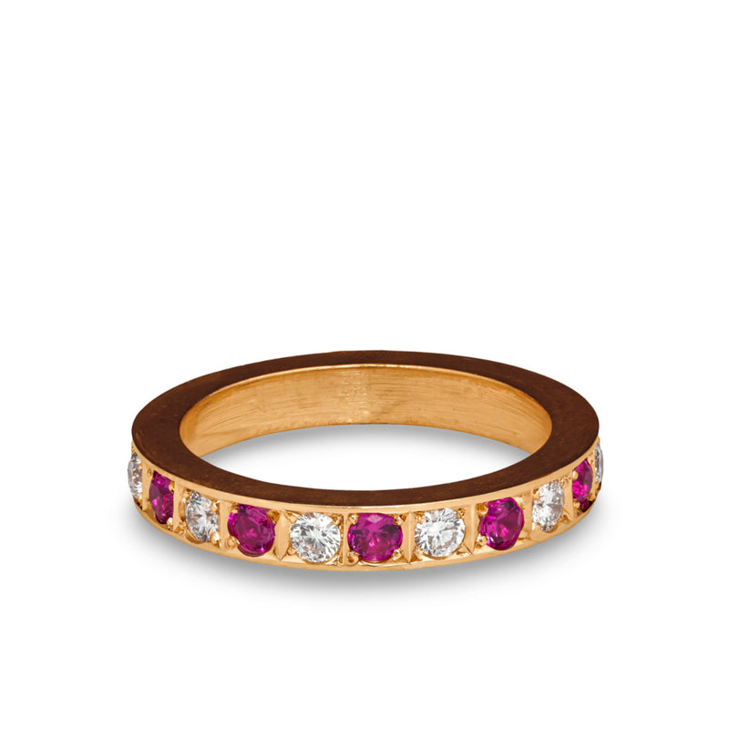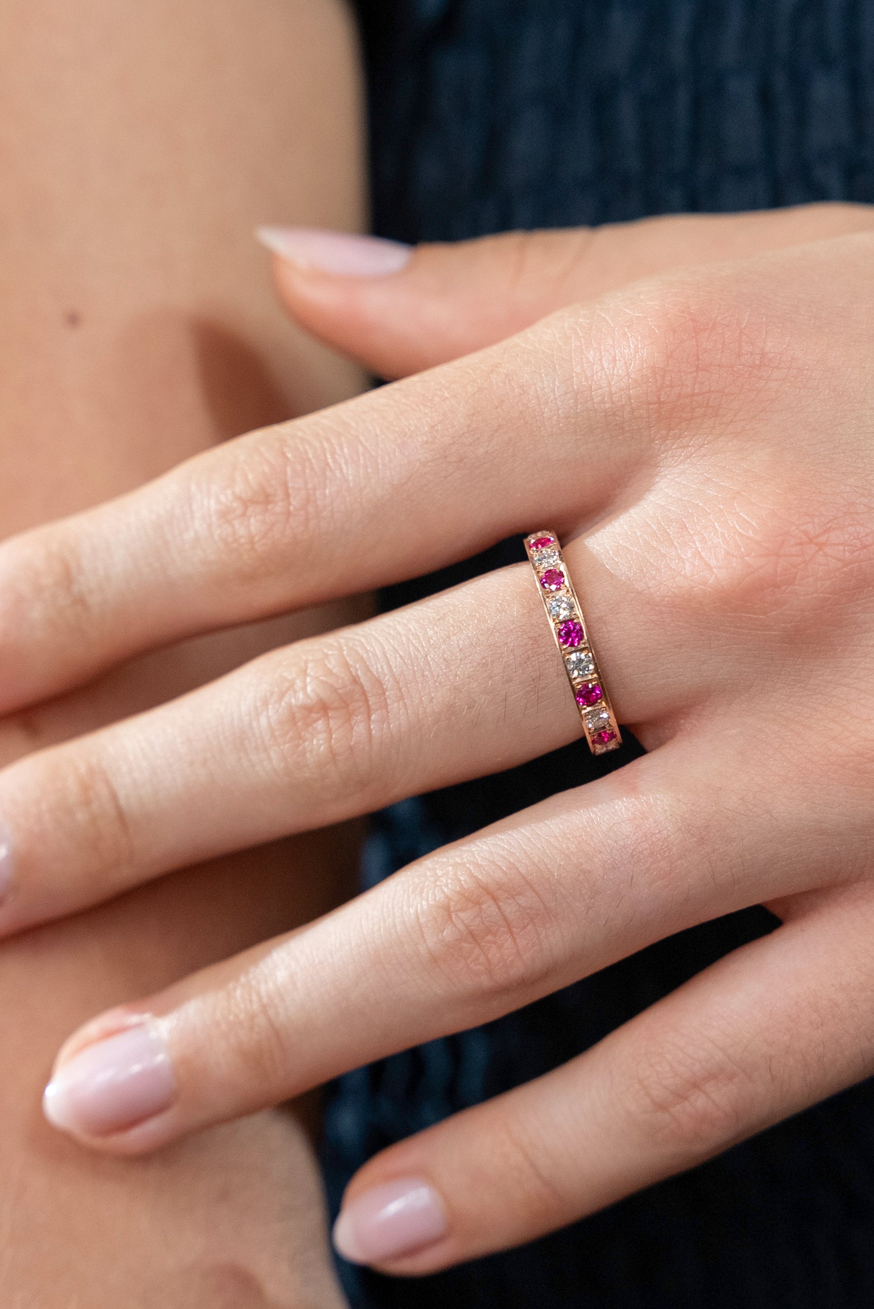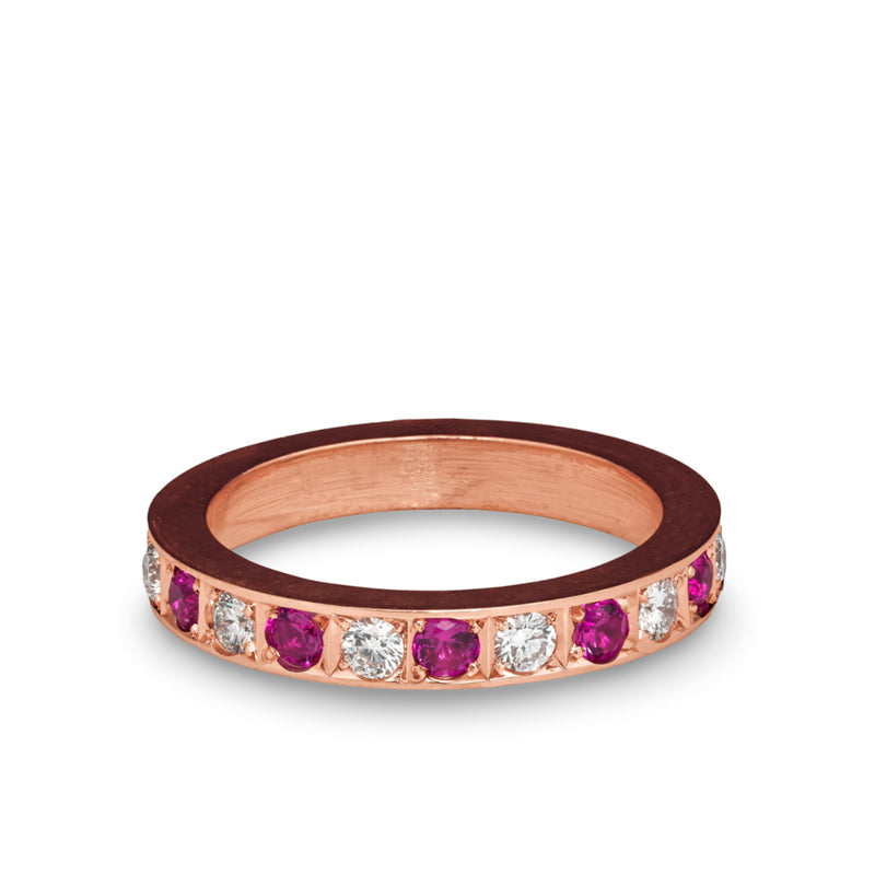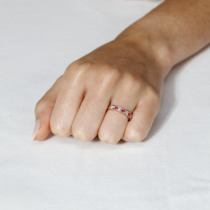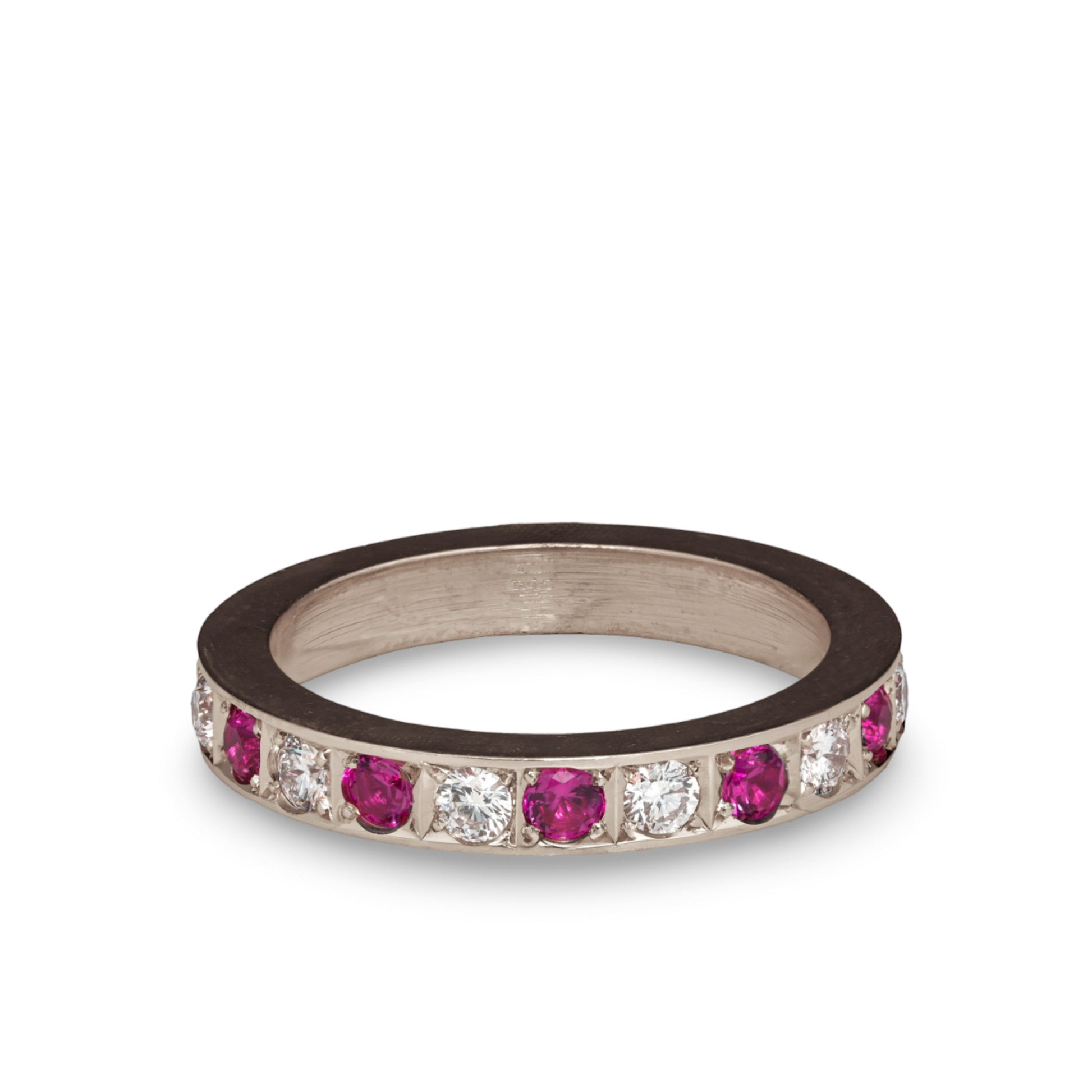 Infinity bands are a symbol of love having no beginning and no end, representing eternal love between a couple. This half-channel band is set with 7 2.5mm rubies and 6 2.5mm diamonds.