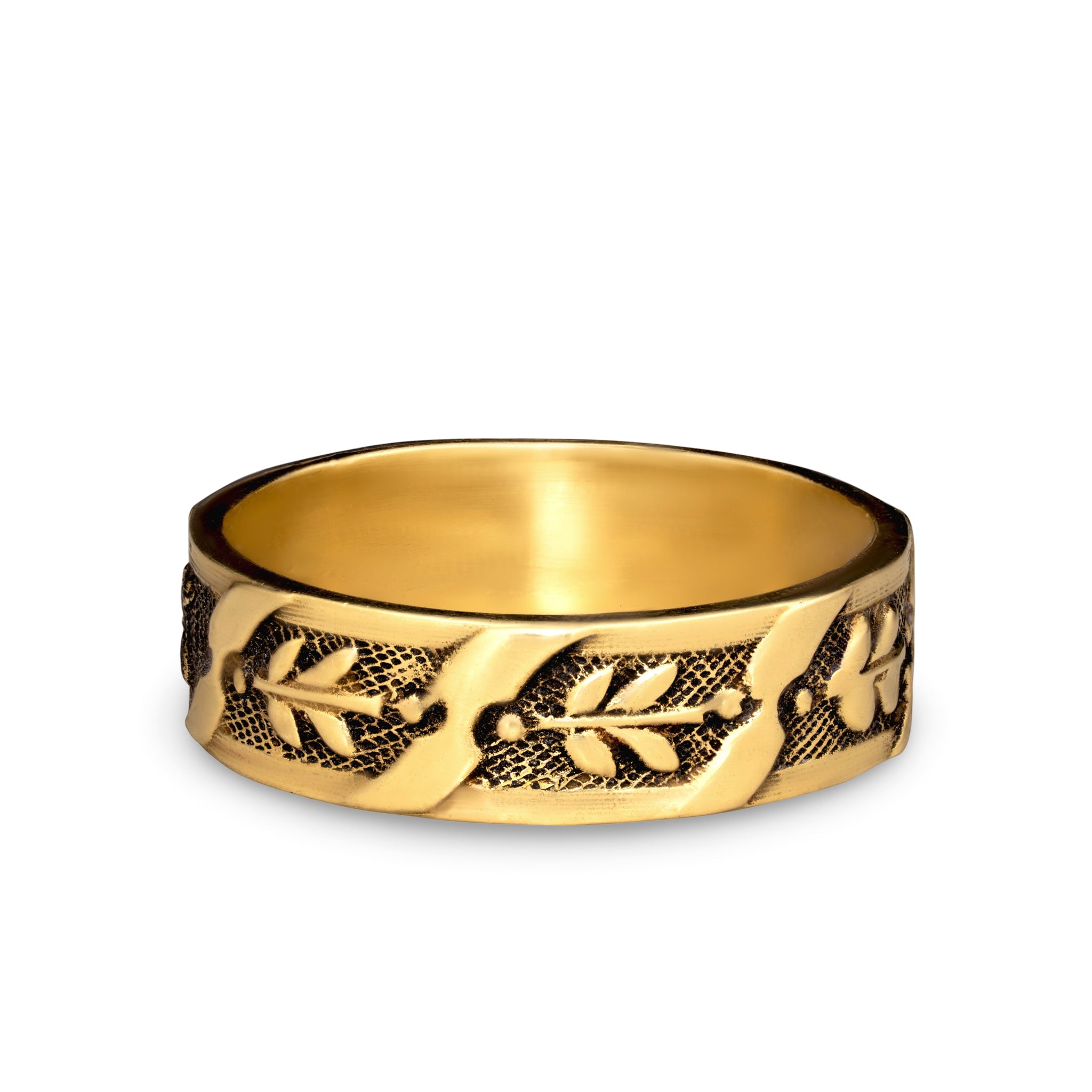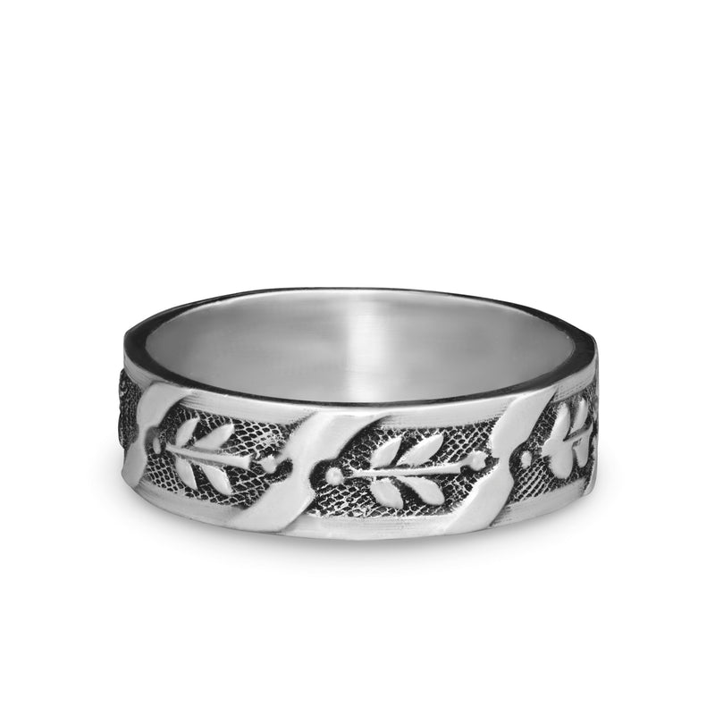 This die-struck men's band features an engraved design of dragonflies. When a dragonfly lands on someone, it is thought to be a sign of good luck and happiness. This band allows you to carry those qualities with you wherever you go.