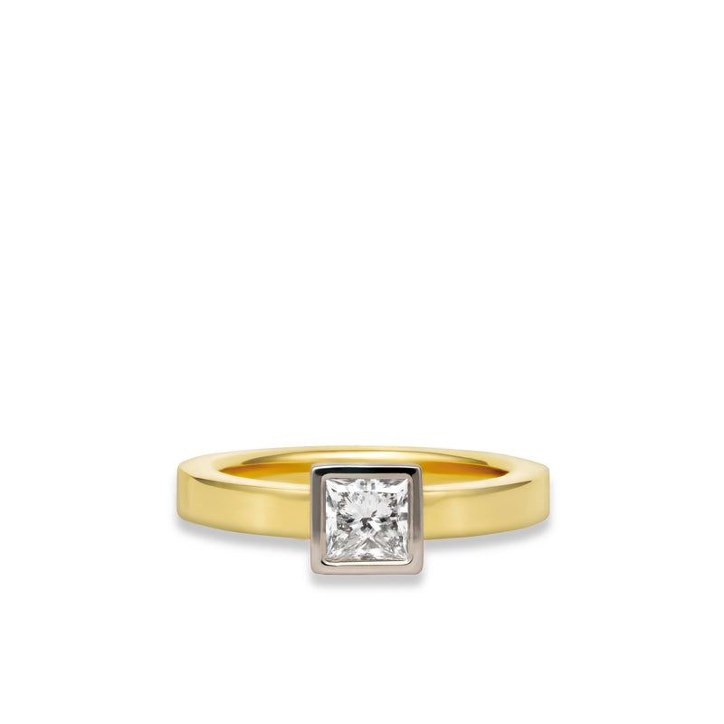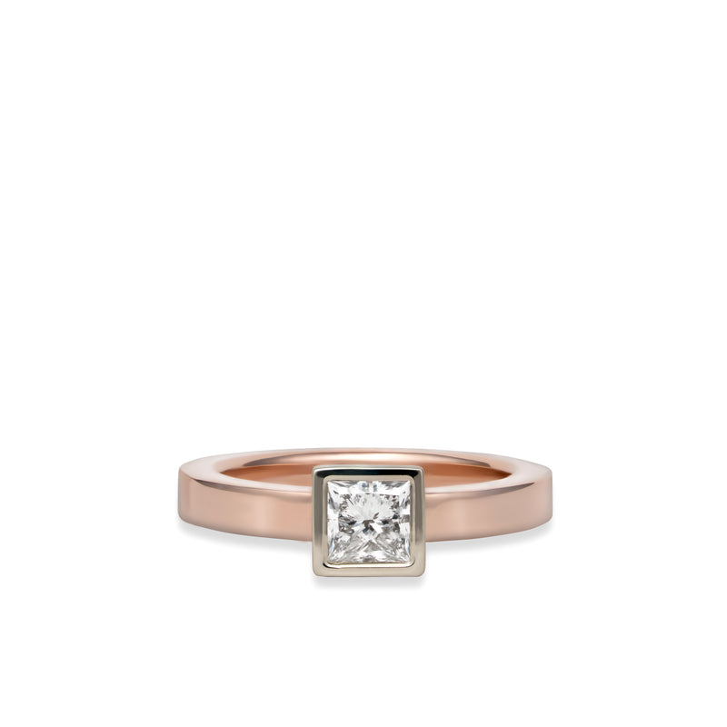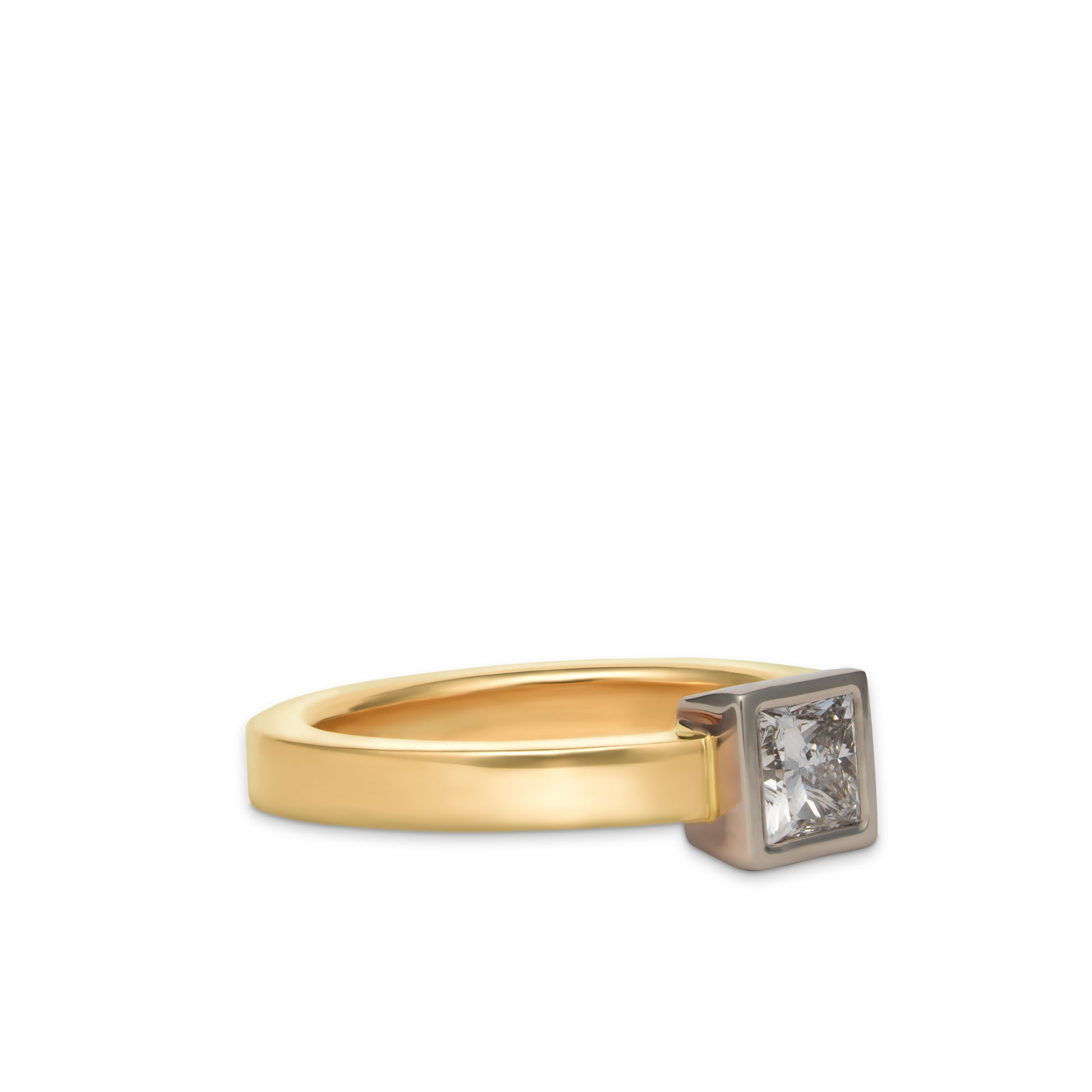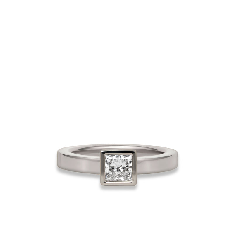 This modern ring features a 5x5mm square diamond set in a 14K white gold bezel. The smooth, rounded band—available in 14K white, yellow, or rose gold—offers a clean and minimalist design. A refined take on a classic silhouette, this piece highlights the bold simplicity of geometric form.