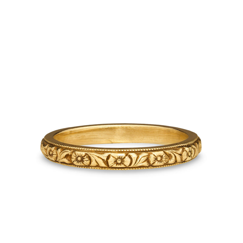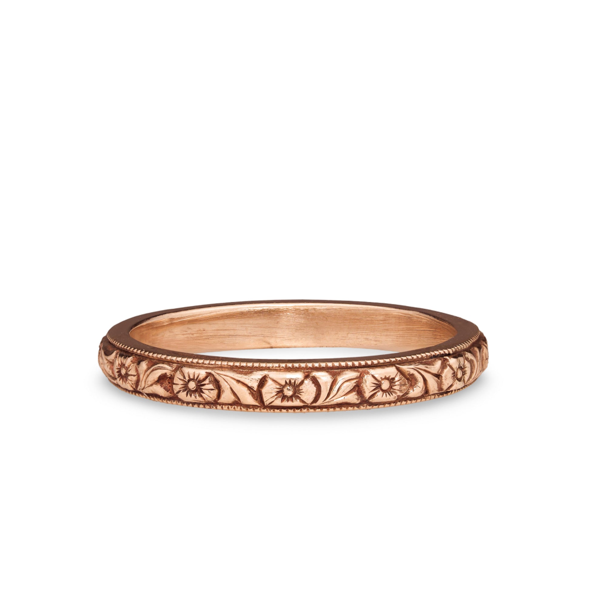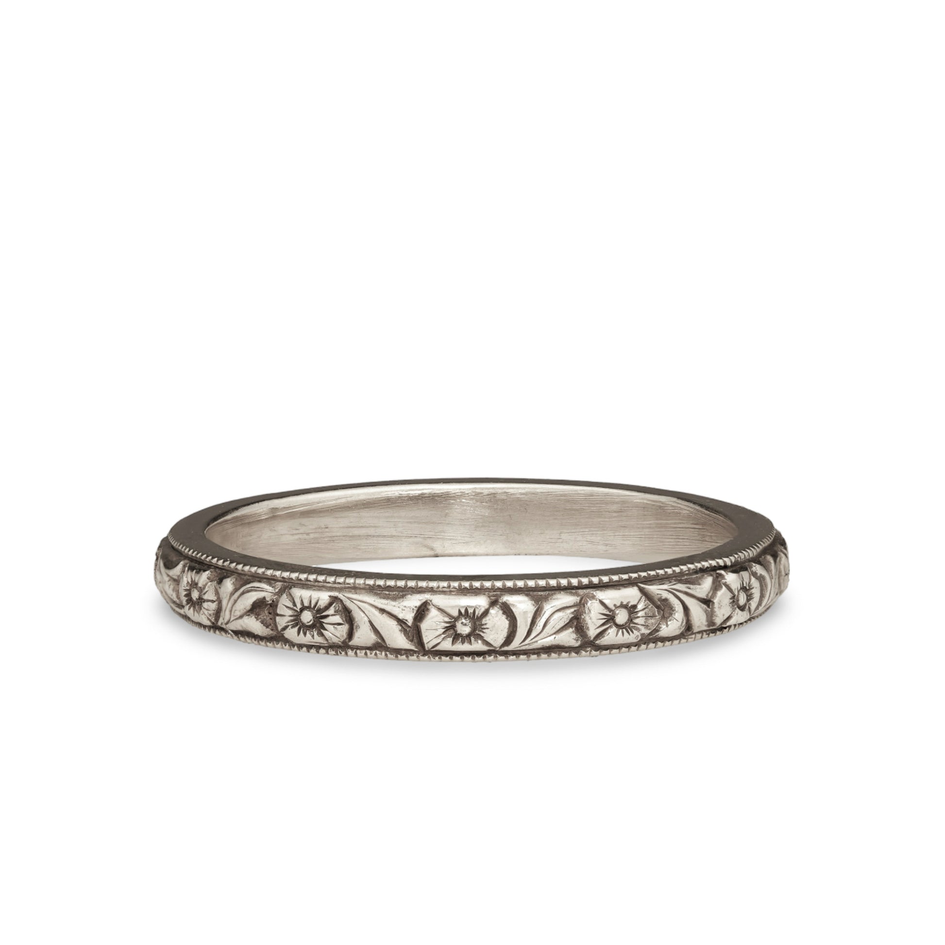 Dogwood blossoms represent strength and endurance. Fluid acanthus leaves symbolize wisdom, health, and eternity. Combined together they create a classic vintage, an engraved band of beauty and sentimentality.