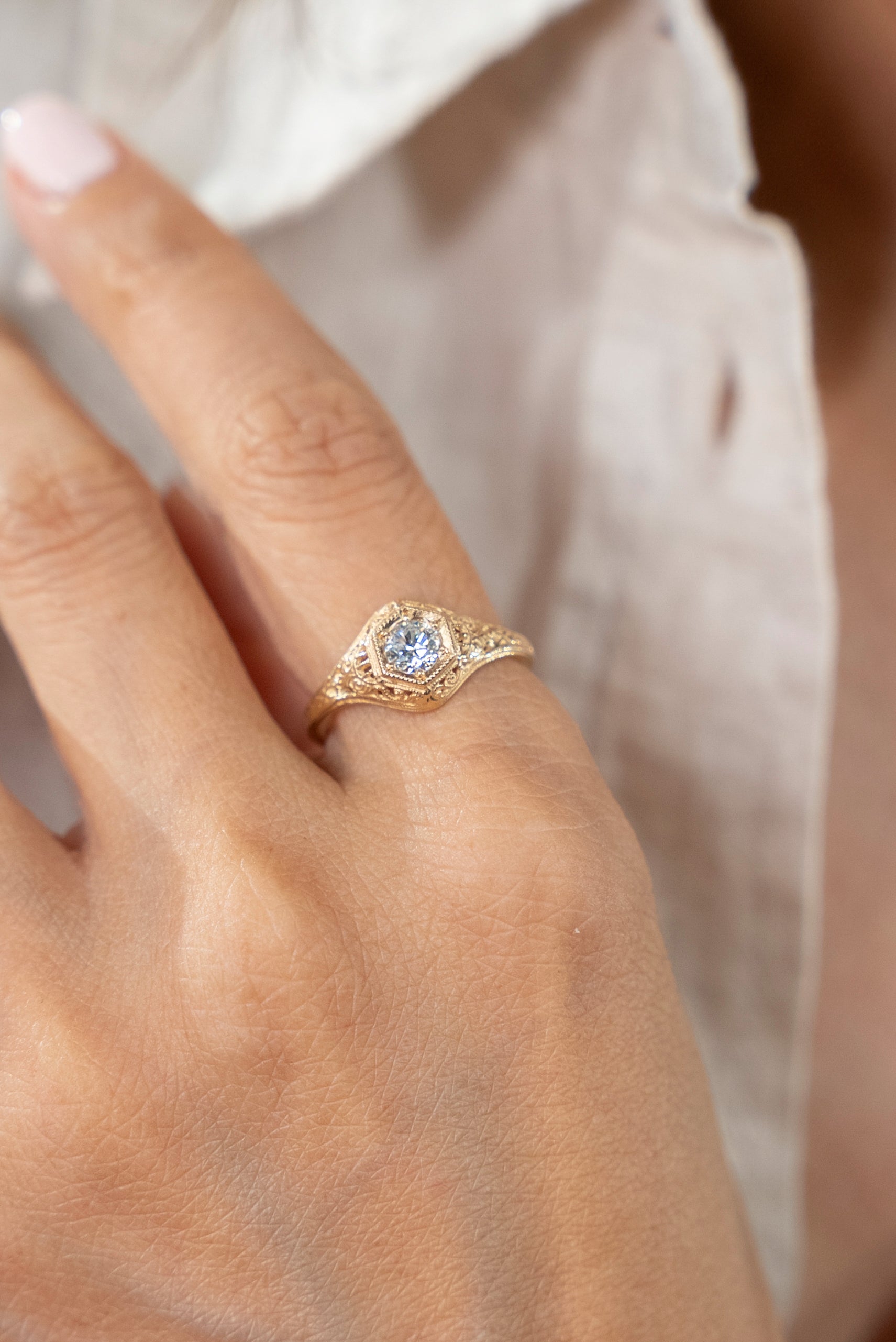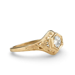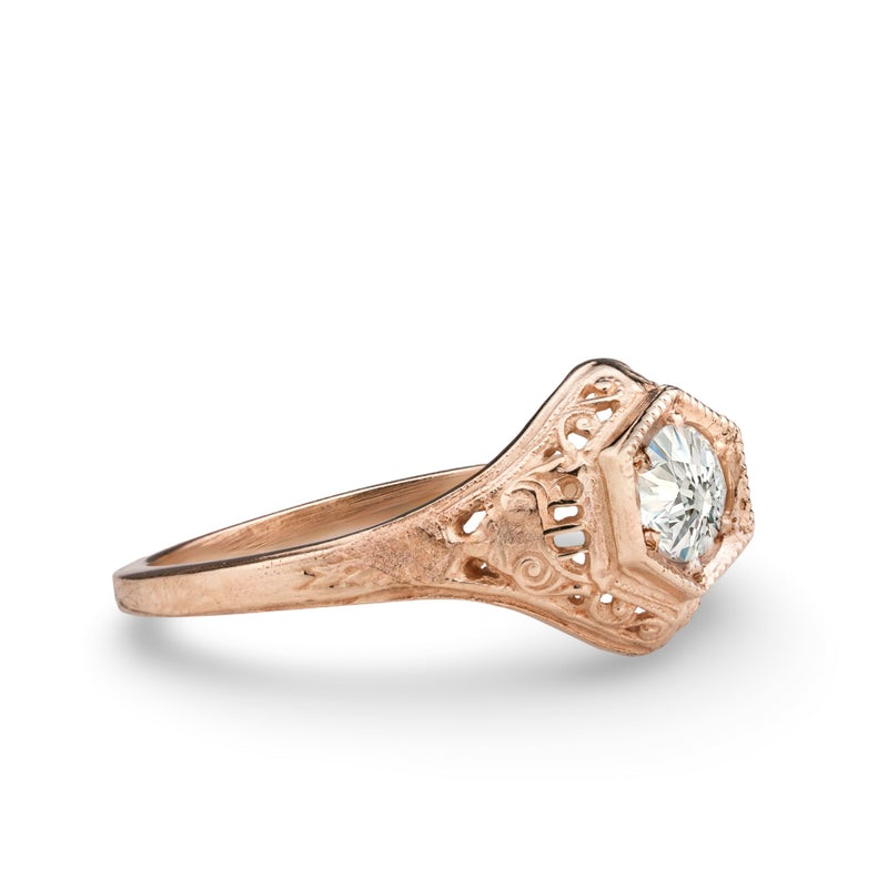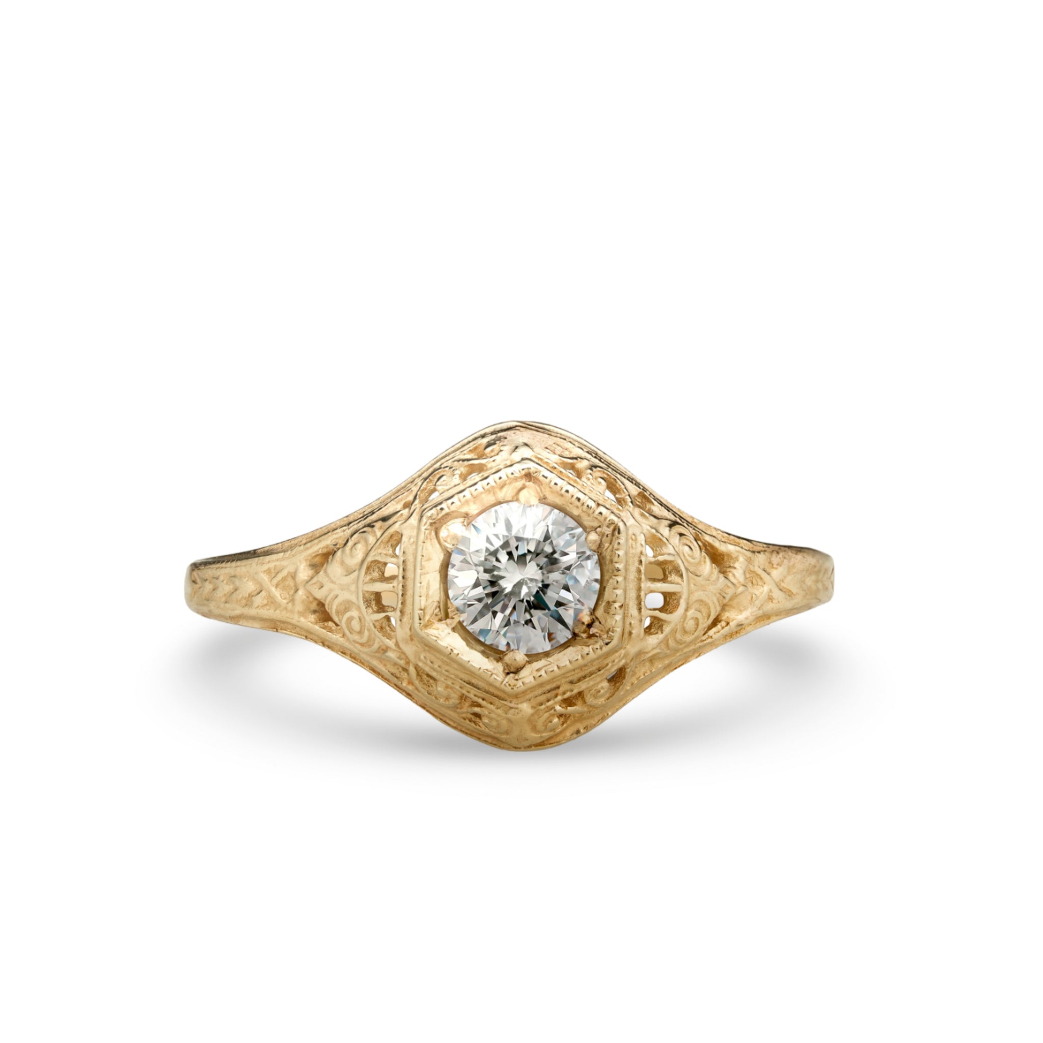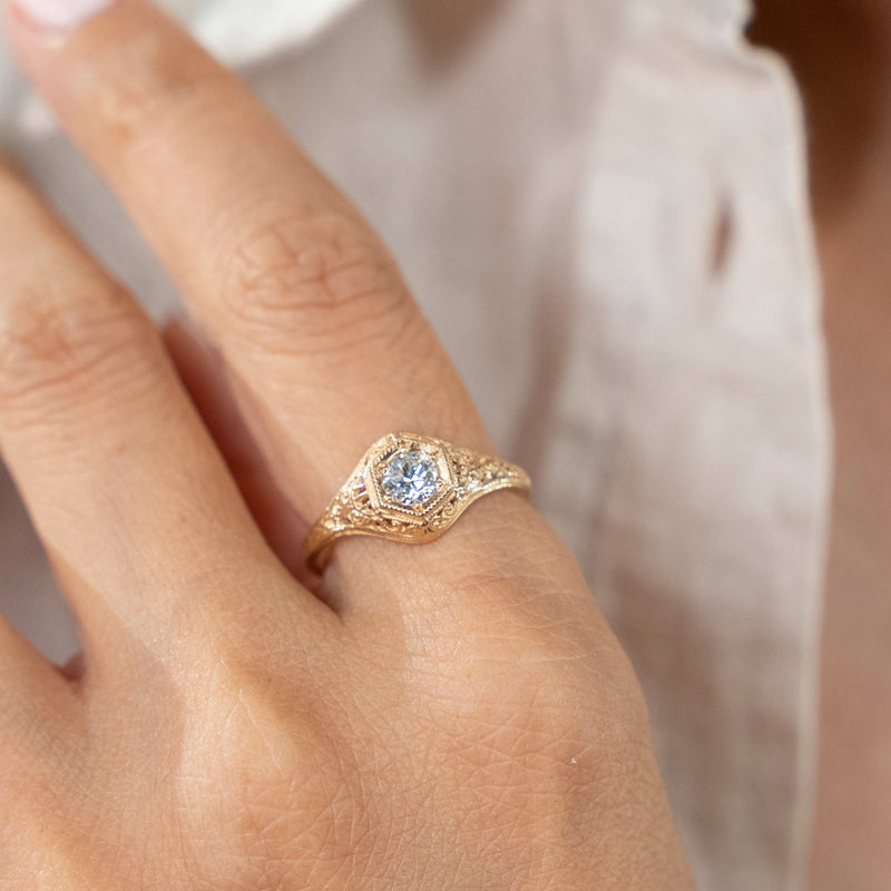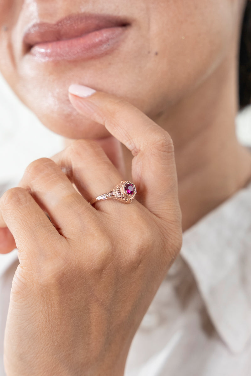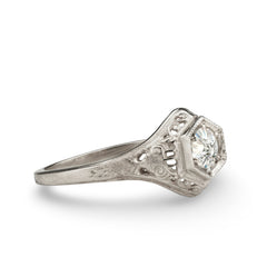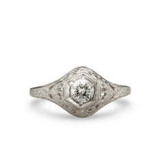 Wheat has long been a symbol of fertility and prosperity. Combined with the elegant swirls and hexagonal head, this 1920s era filigree ring is set with a 4.5mm gemstone.