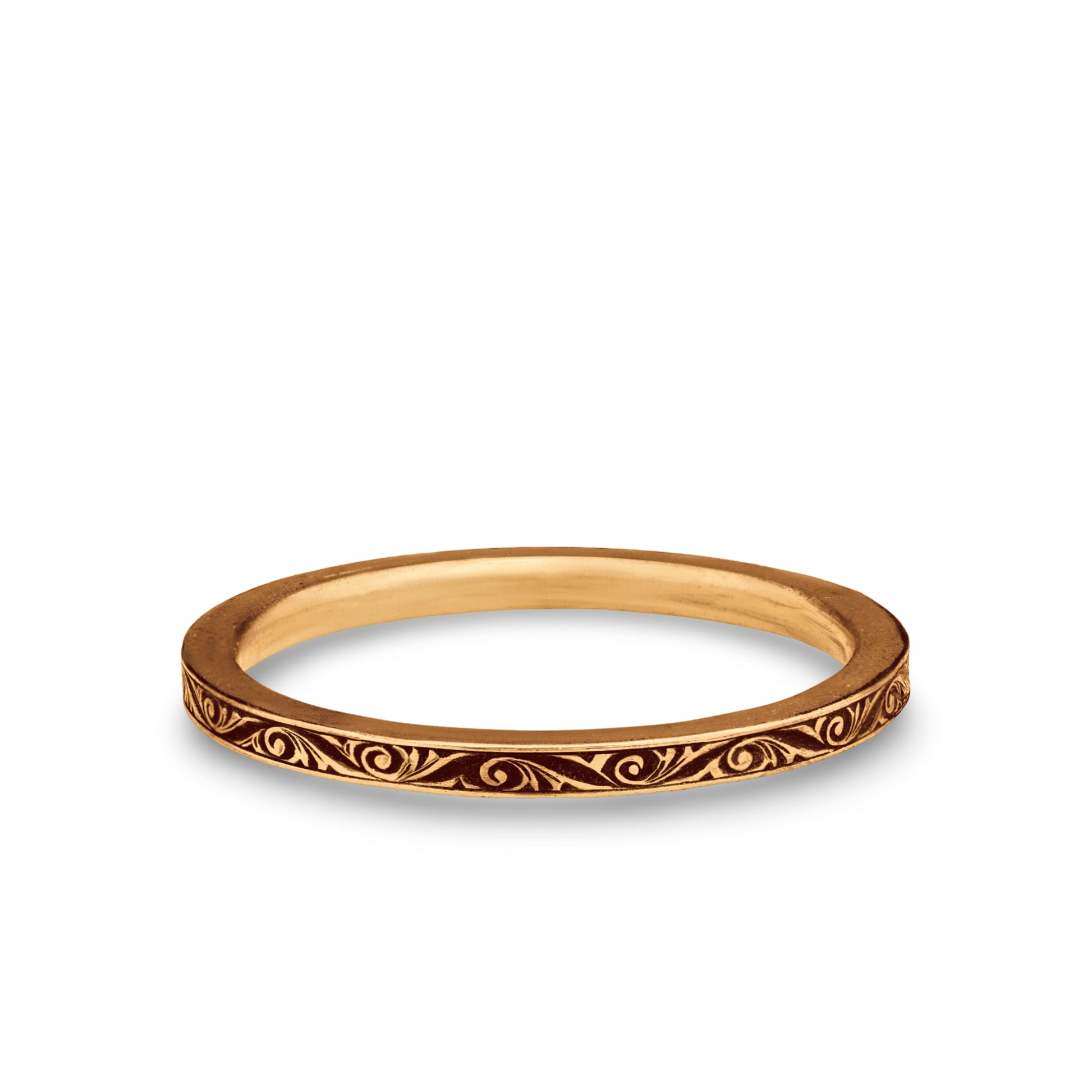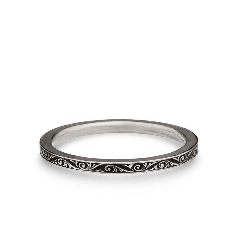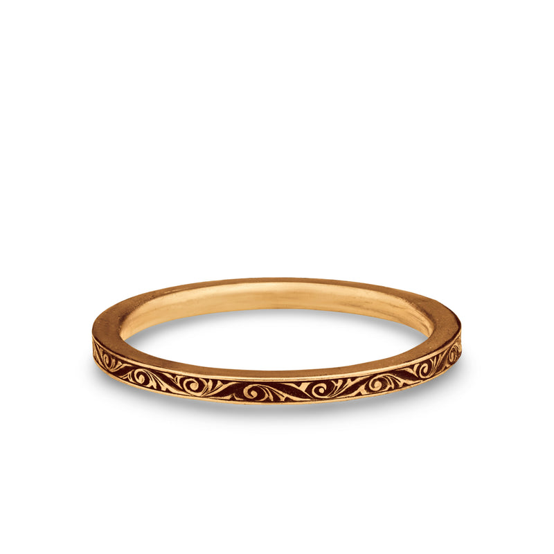 A stacking ring with no beginning and no end, the running scroll pattern signifies eternity. Scrolls are immune to gravitational forces, themselves a relentless power.