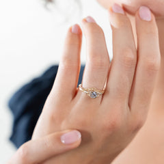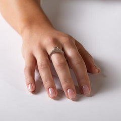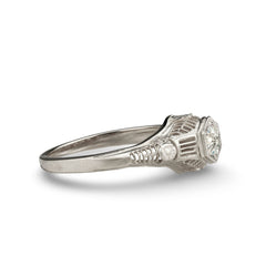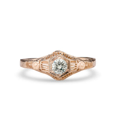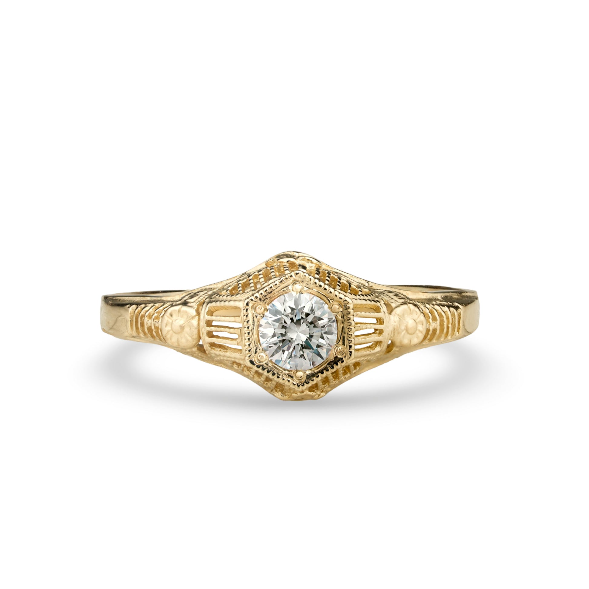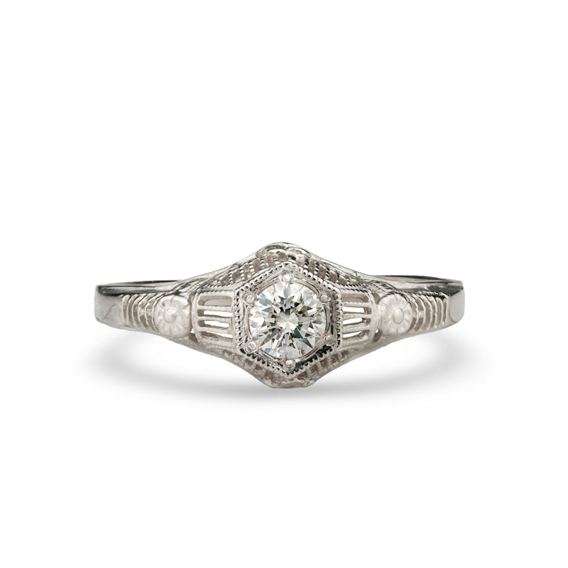 Buttercups have long been a symbol of felicity and cheer. Combined with a delicate rose detail and hexagonal head, this 1920's era filigree ring is set with a 4mm gemstone.