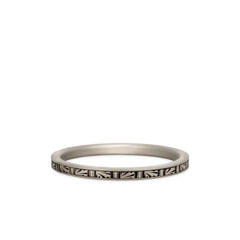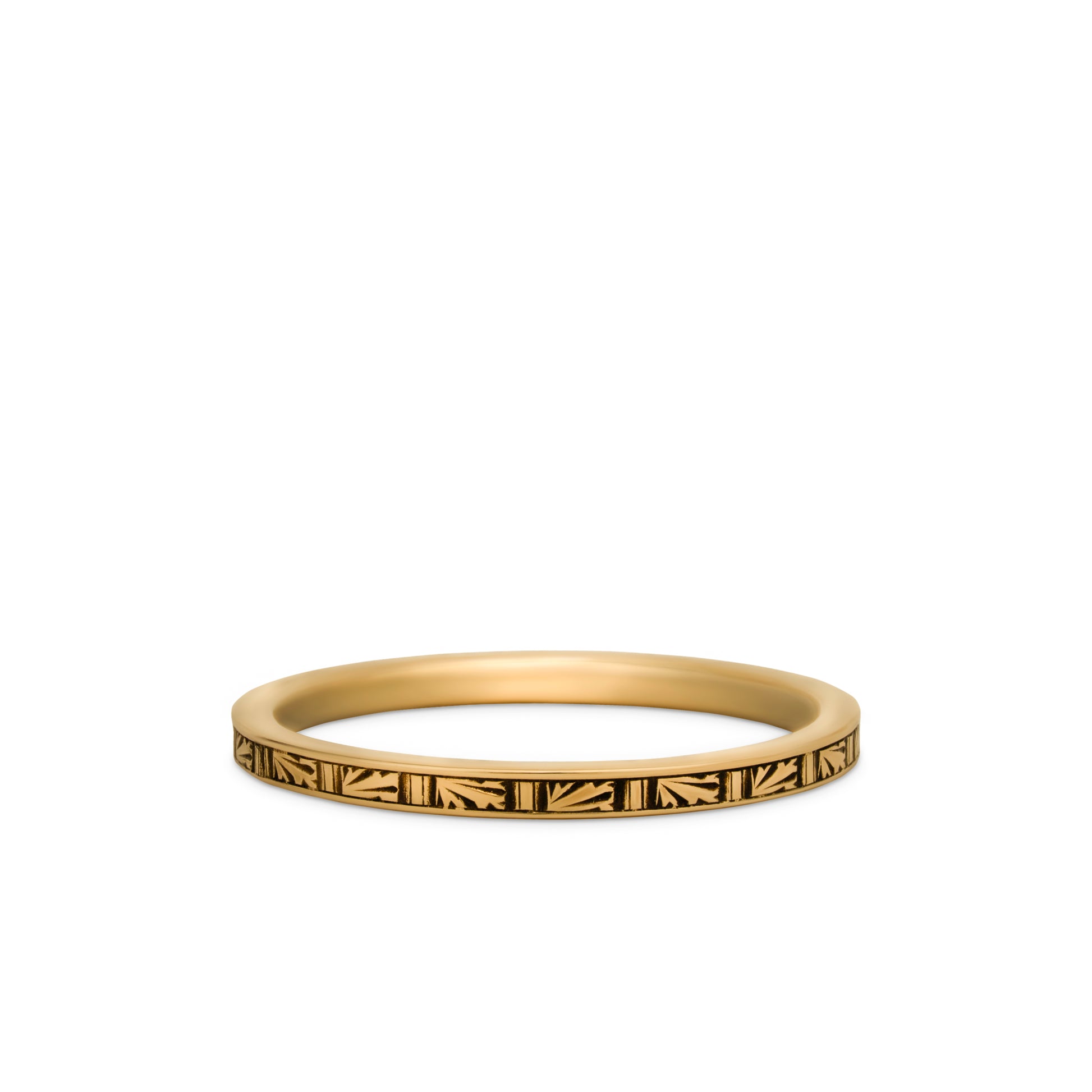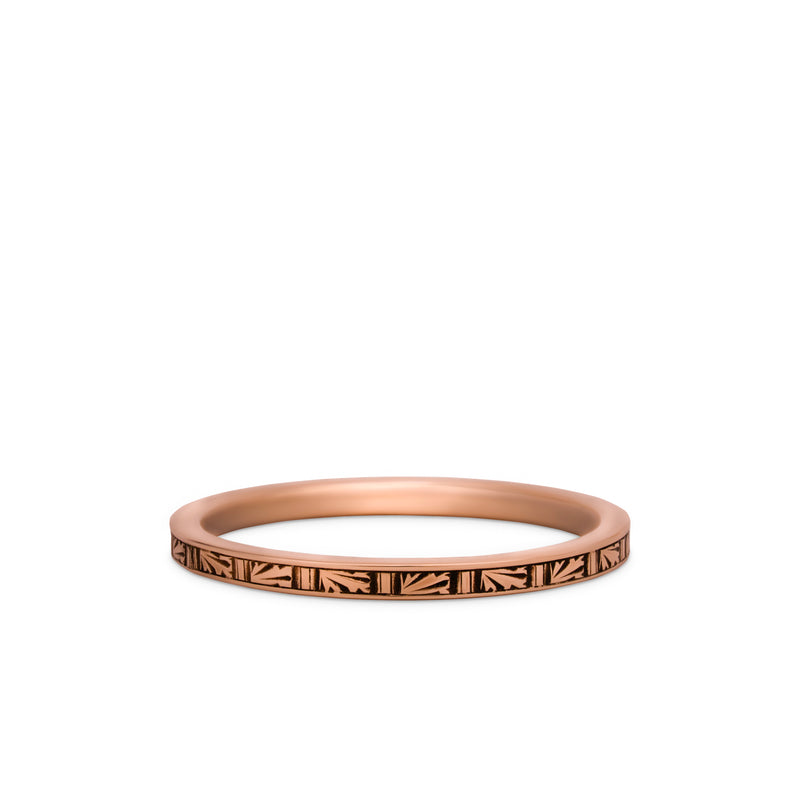 The Fernline Band features a repeating botanical motif reminiscent of pressed ferns and woodland carvings. Each tiny panel is die-rolled on our antique machinery, creating crisp texture in a slender, lightweight silhouette.
