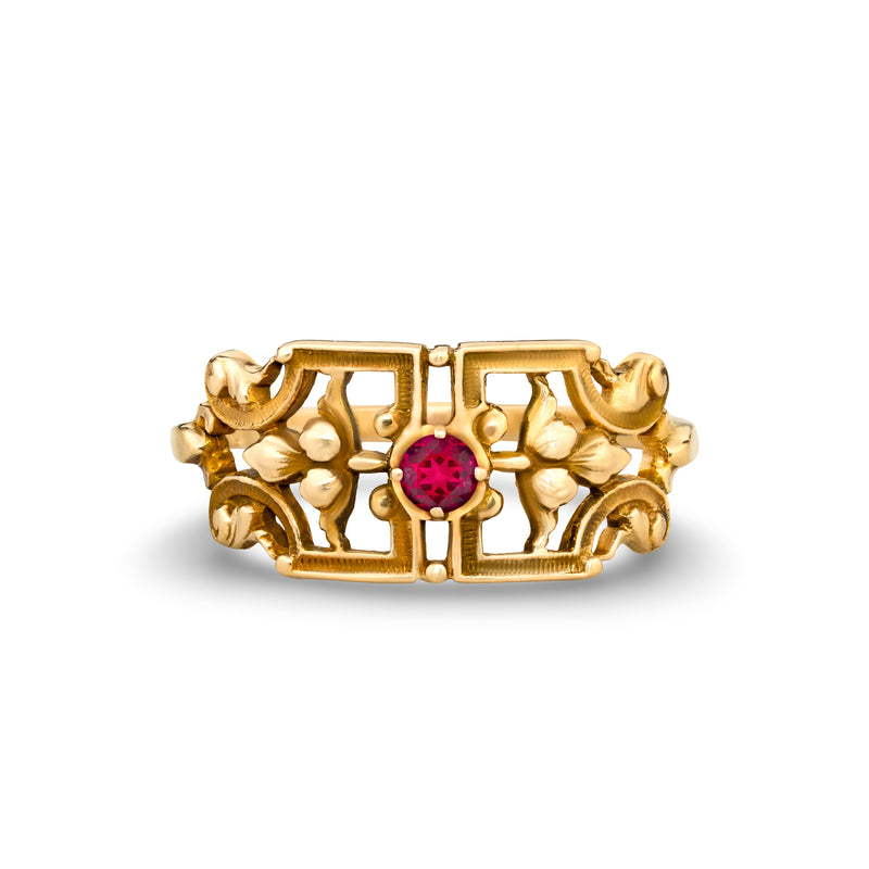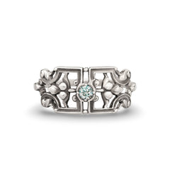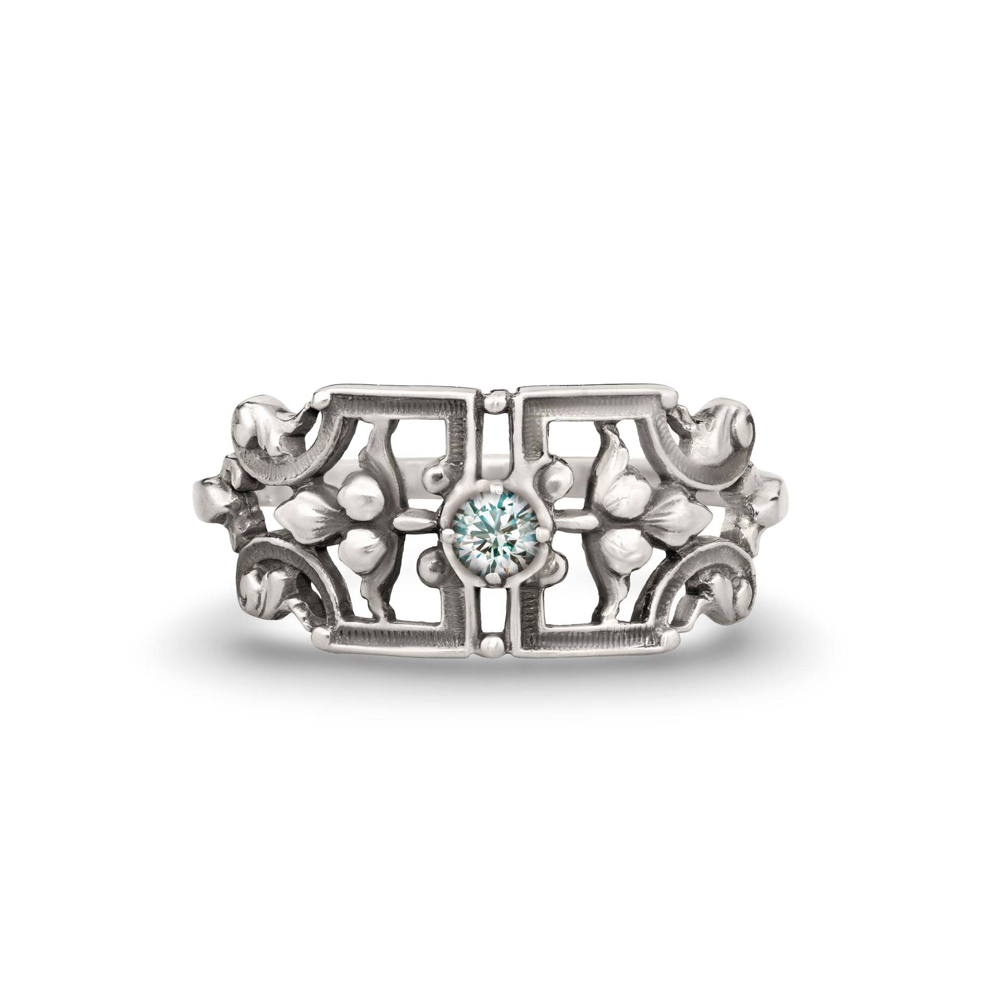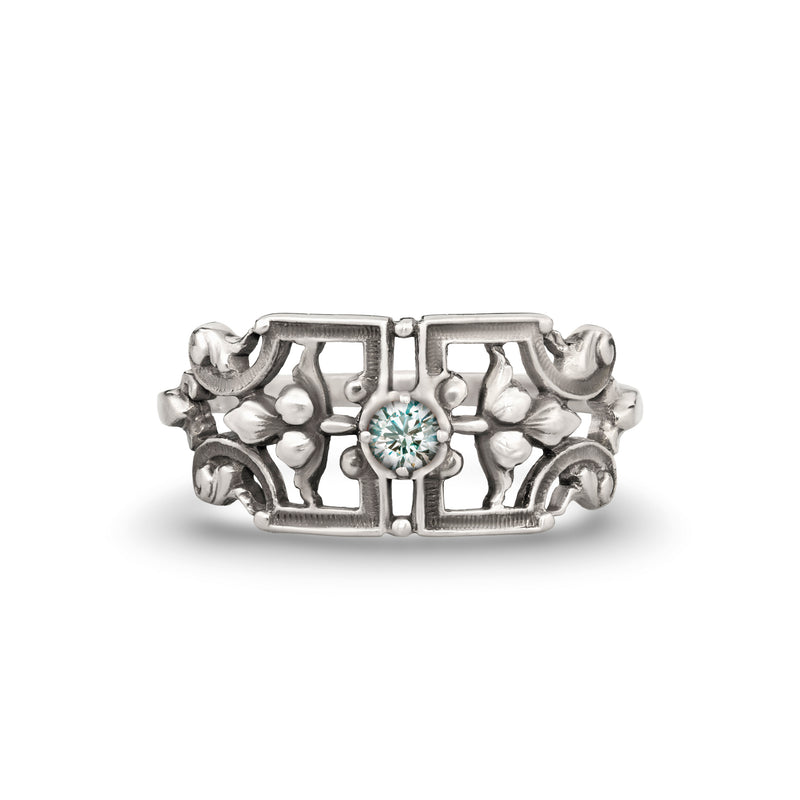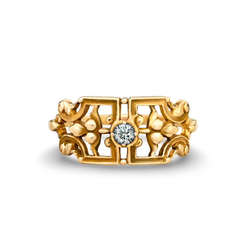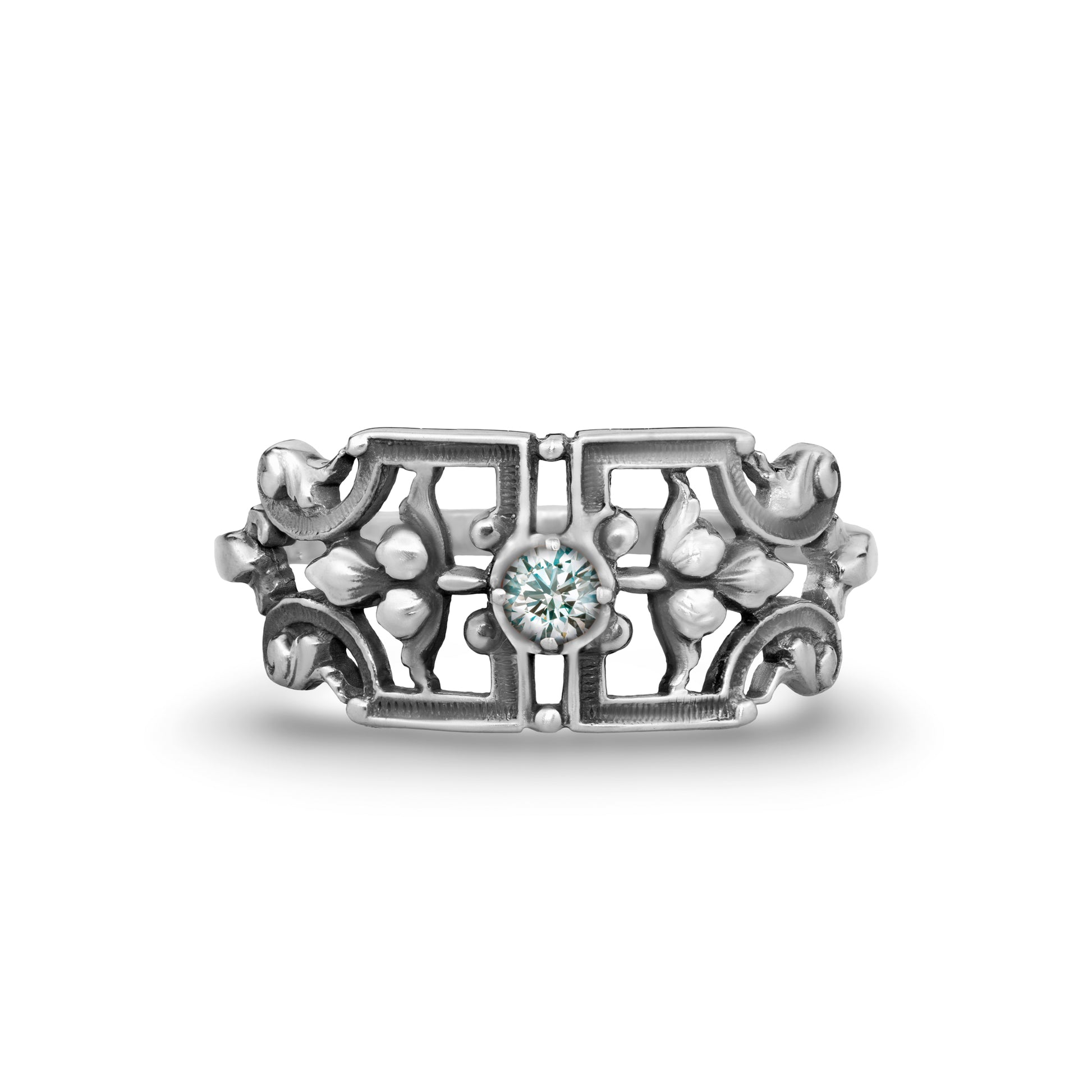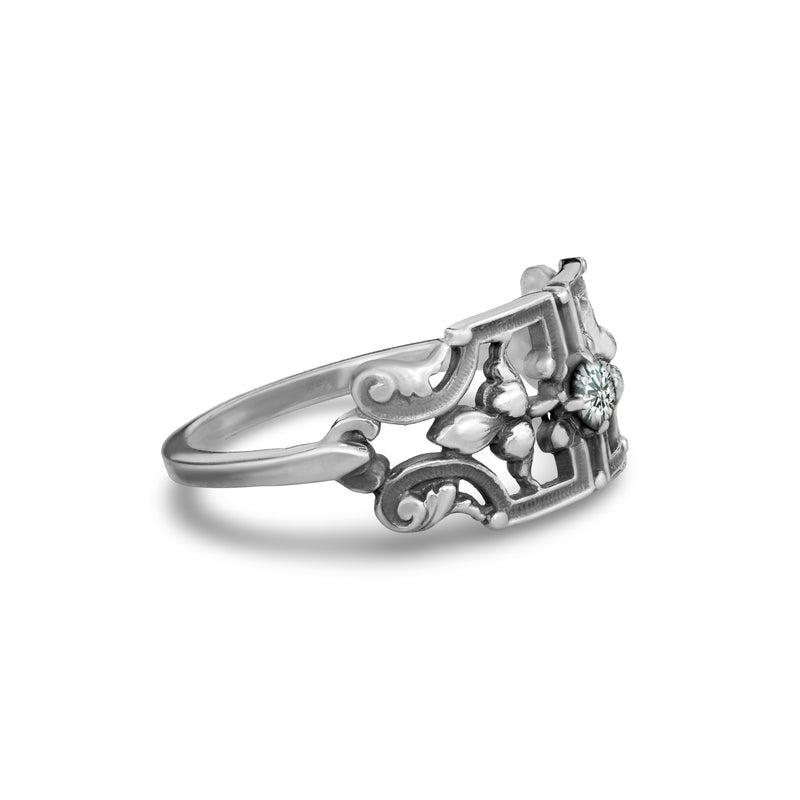 A central stone set dahlia blossom, adorns this fretwork and foliage vintage cigar band ring. The dahlia, a Victorian symbol of dignity, eloquence, and devotion, declares, "I am forever yours." The traversing ribbon and dogwood pattern band symbolizes commitment and strength.