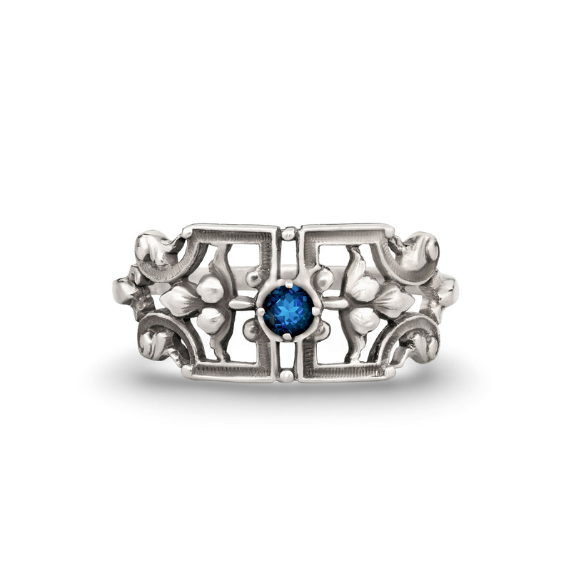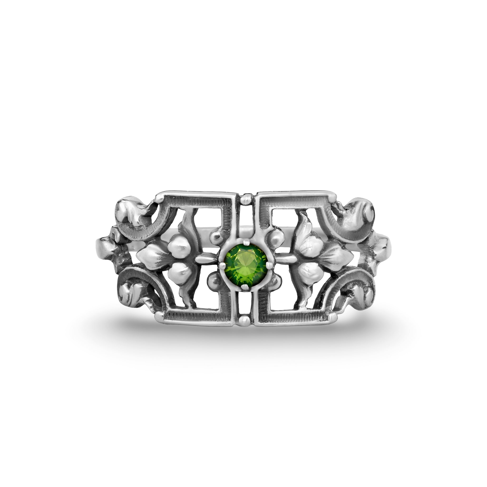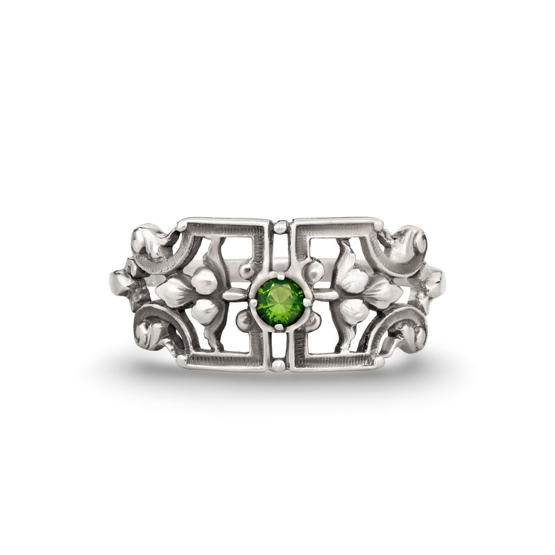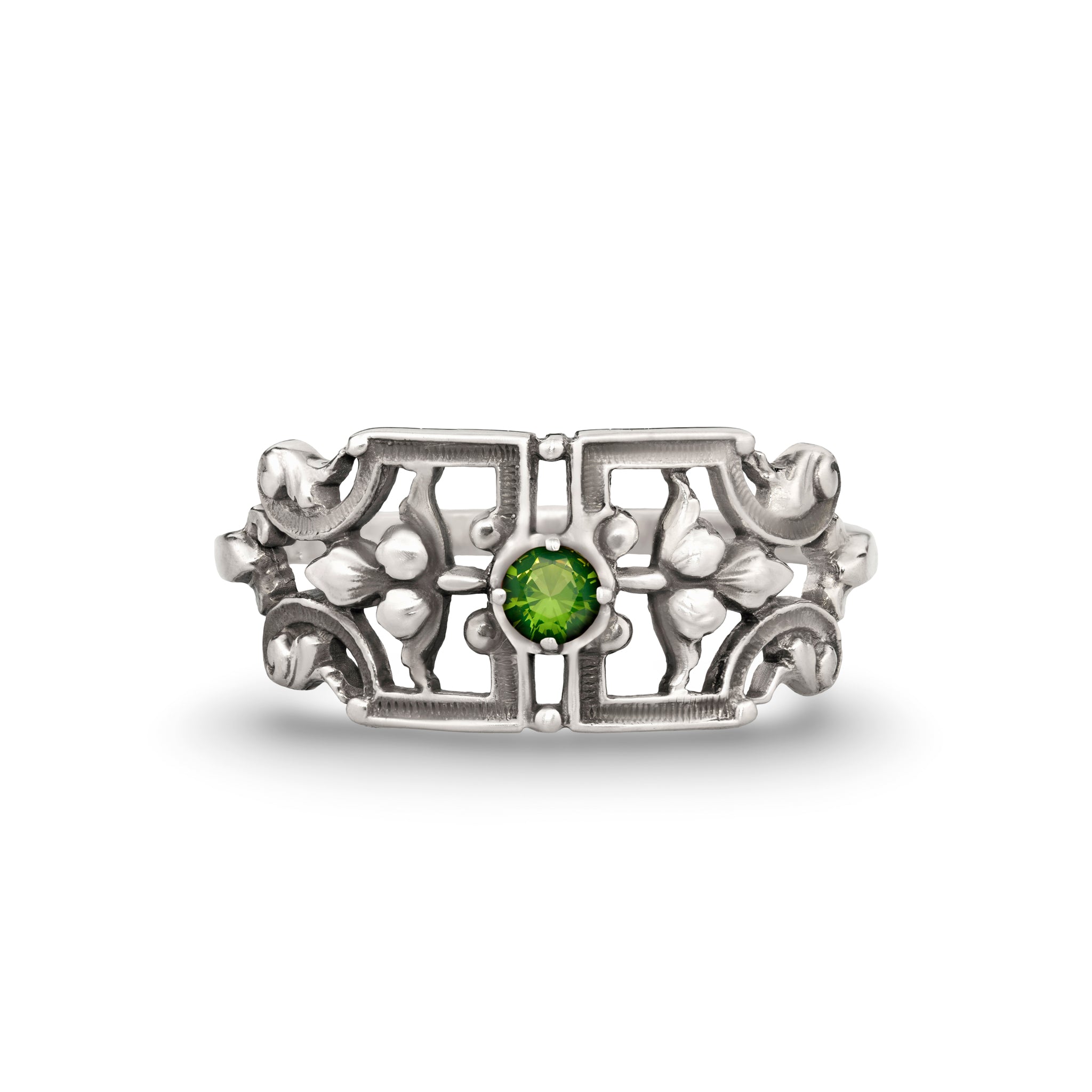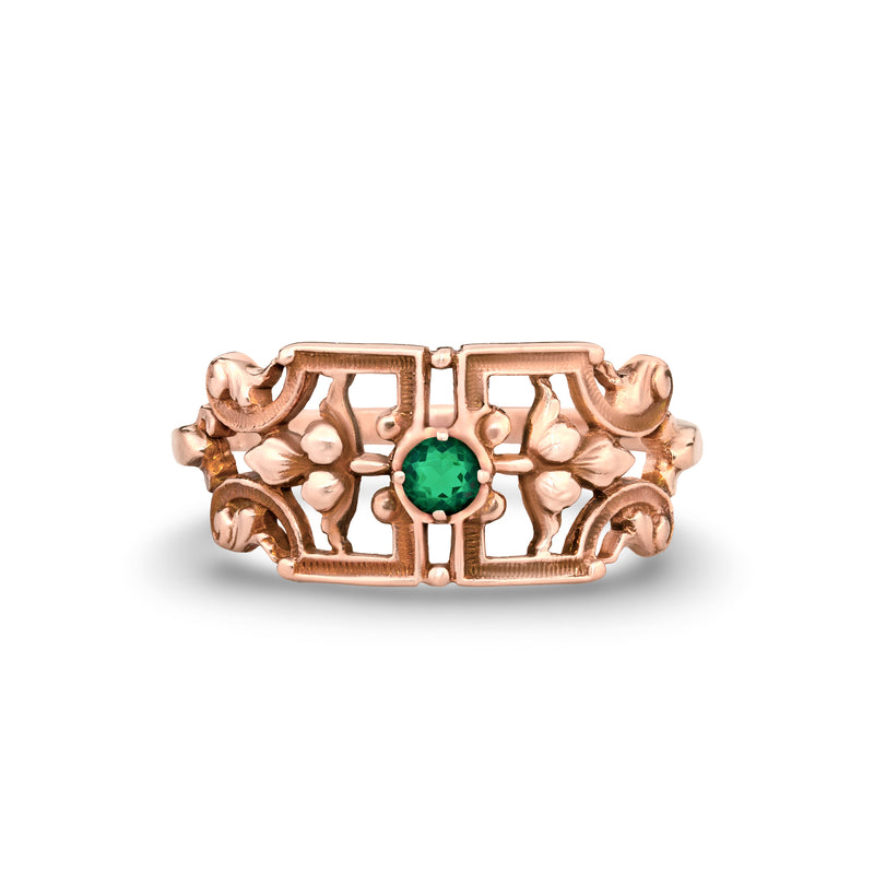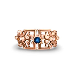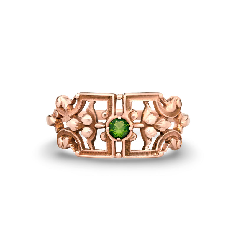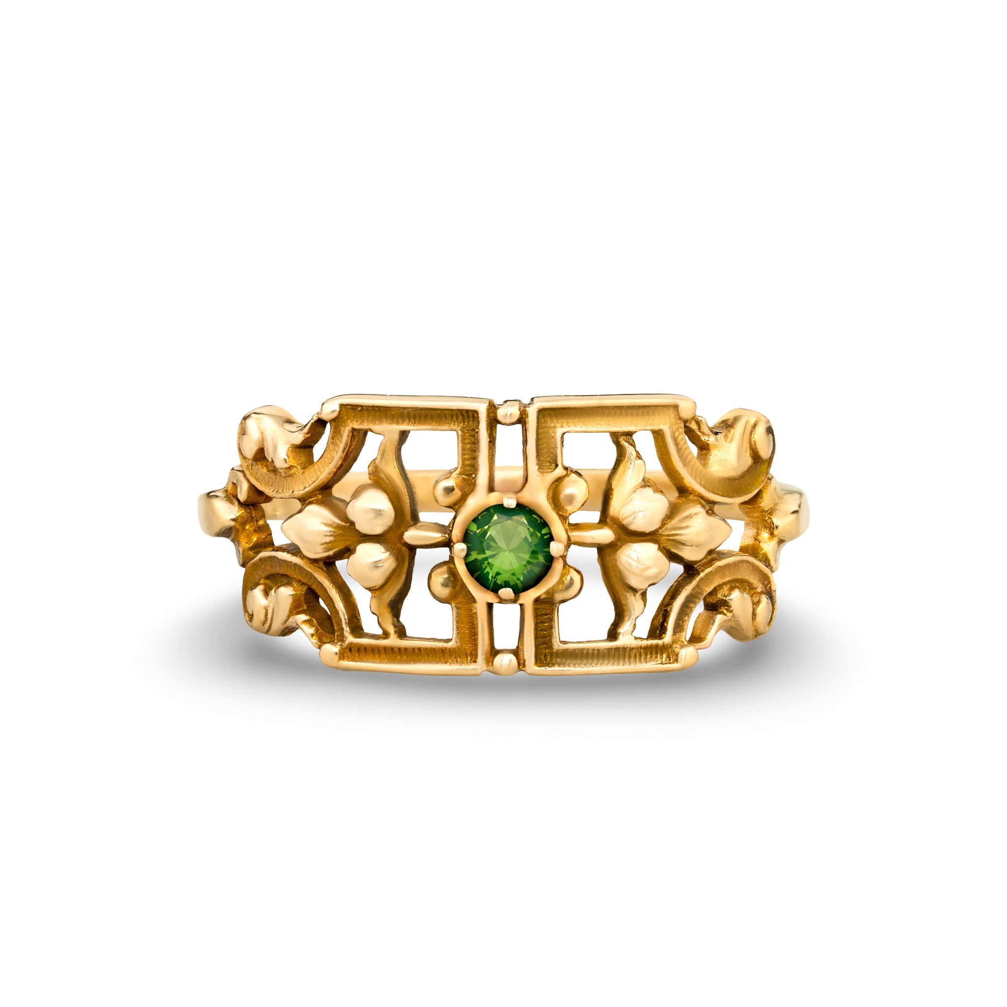 A central stone set dahlia blossom, adorns this fretwork and foliage vintage cigar band ring. The dahlia, a Victorian symbol of dignity, eloquence, and devotion, declares, "I am forever yours." The traversing ribbon and dogwood pattern band symbolizes commitment and strength.