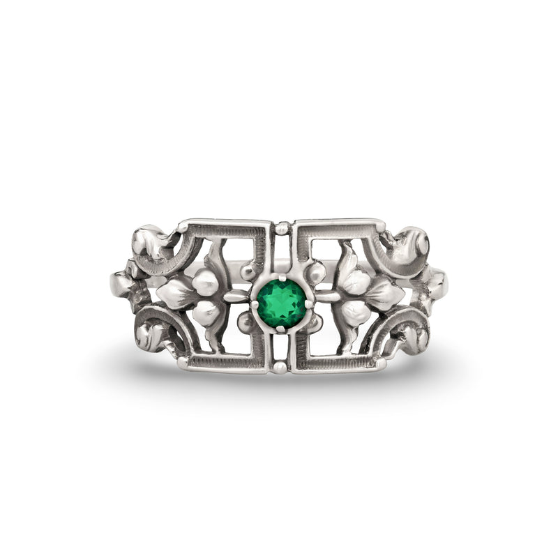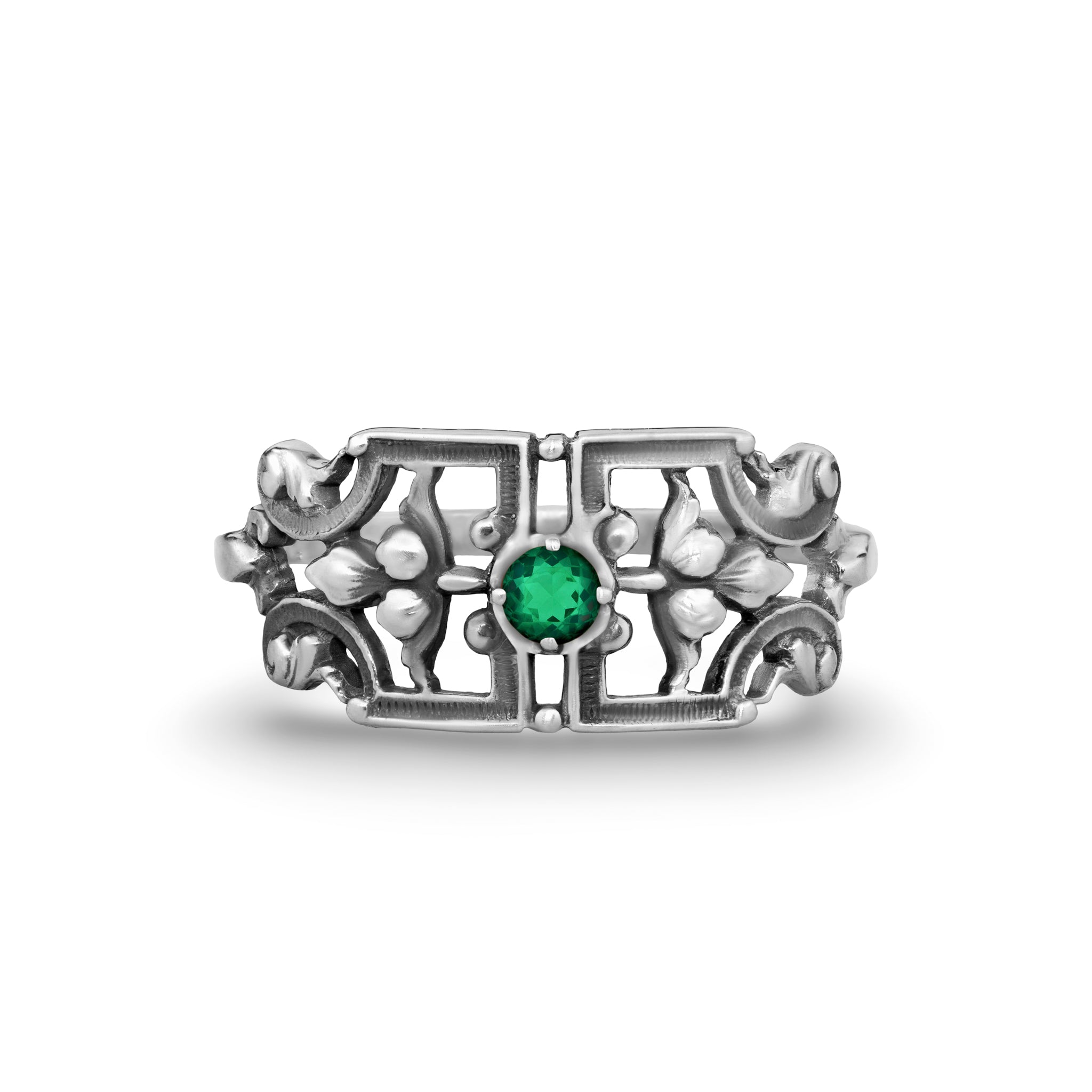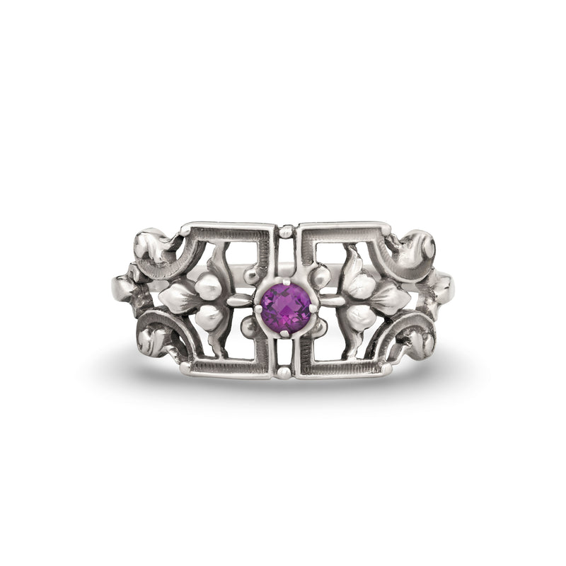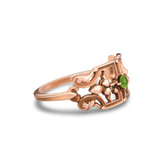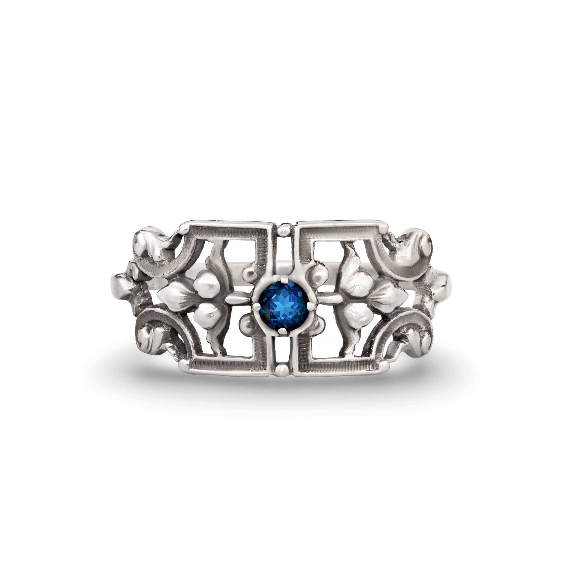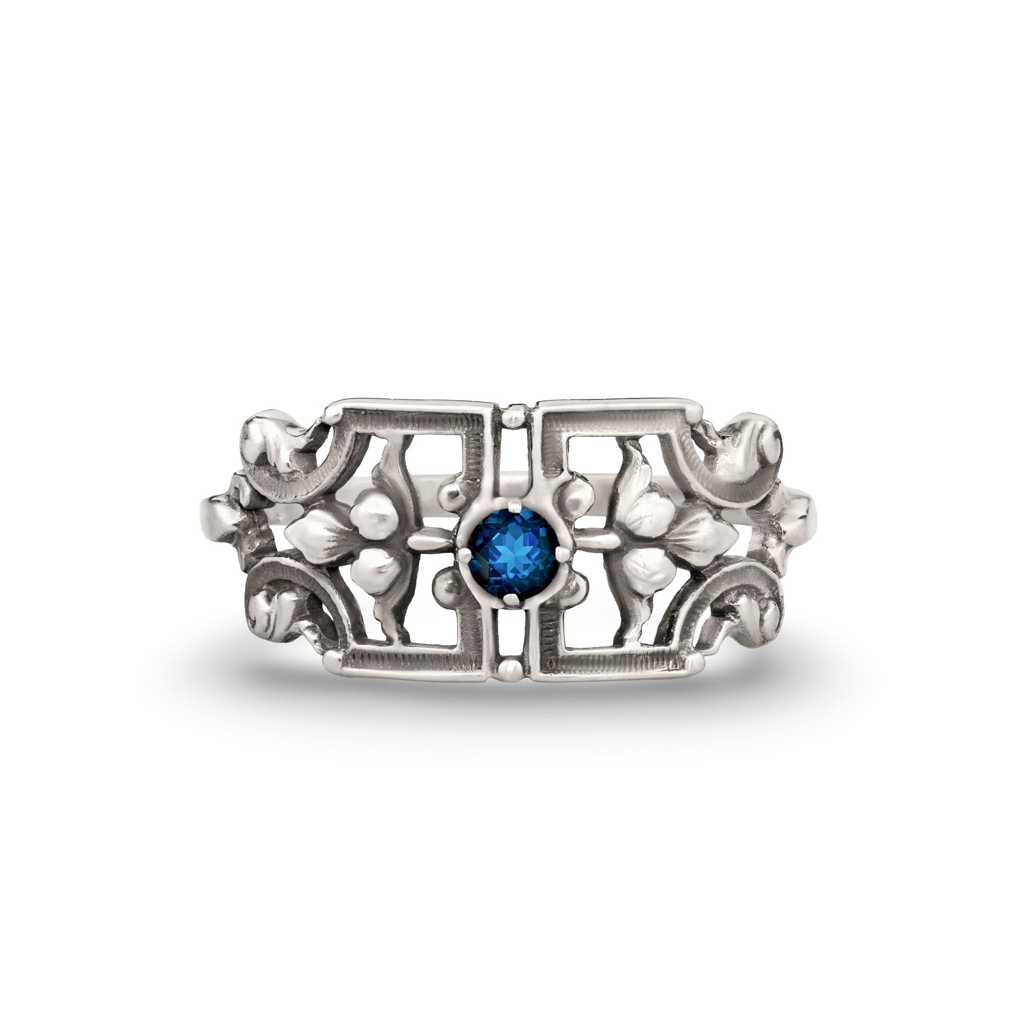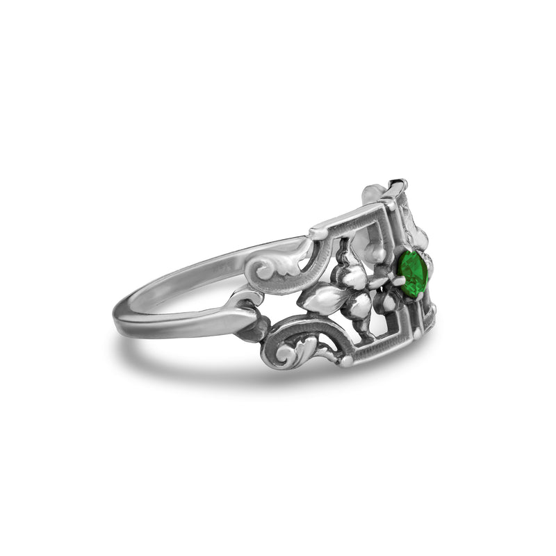 A central stone set dahlia blossom, adorns this fretwork and foliage vintage cigar band ring. The dahlia, a Victorian symbol of dignity, eloquence, and devotion, declares, "I am forever yours." The traversing ribbon and dogwood pattern band symbolizes commitment and strength.