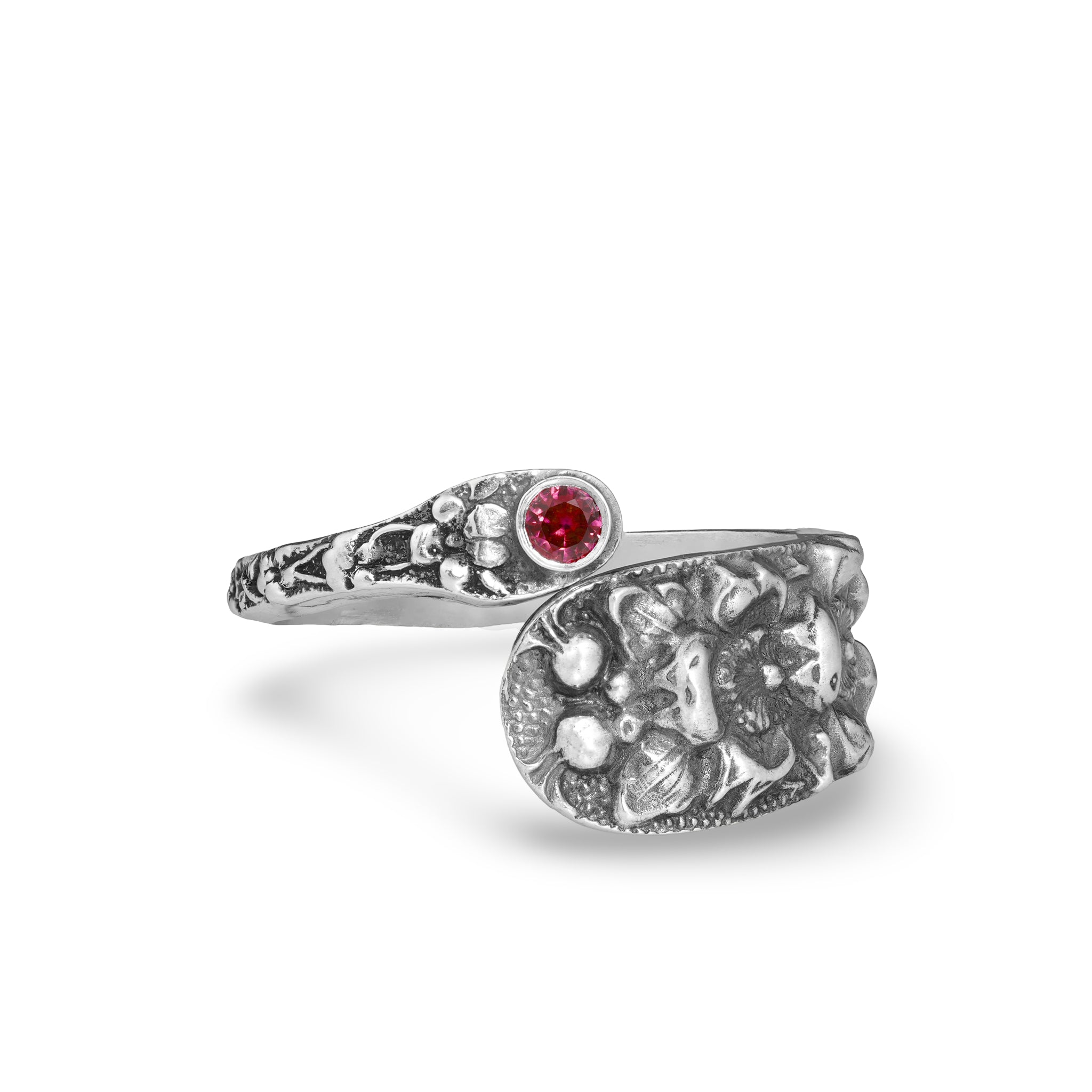 Tender Forget-Me-Not make an unforgettable statement on this charming vintage sterling silver Victorian spoon ring set with a 3mm ruby.
