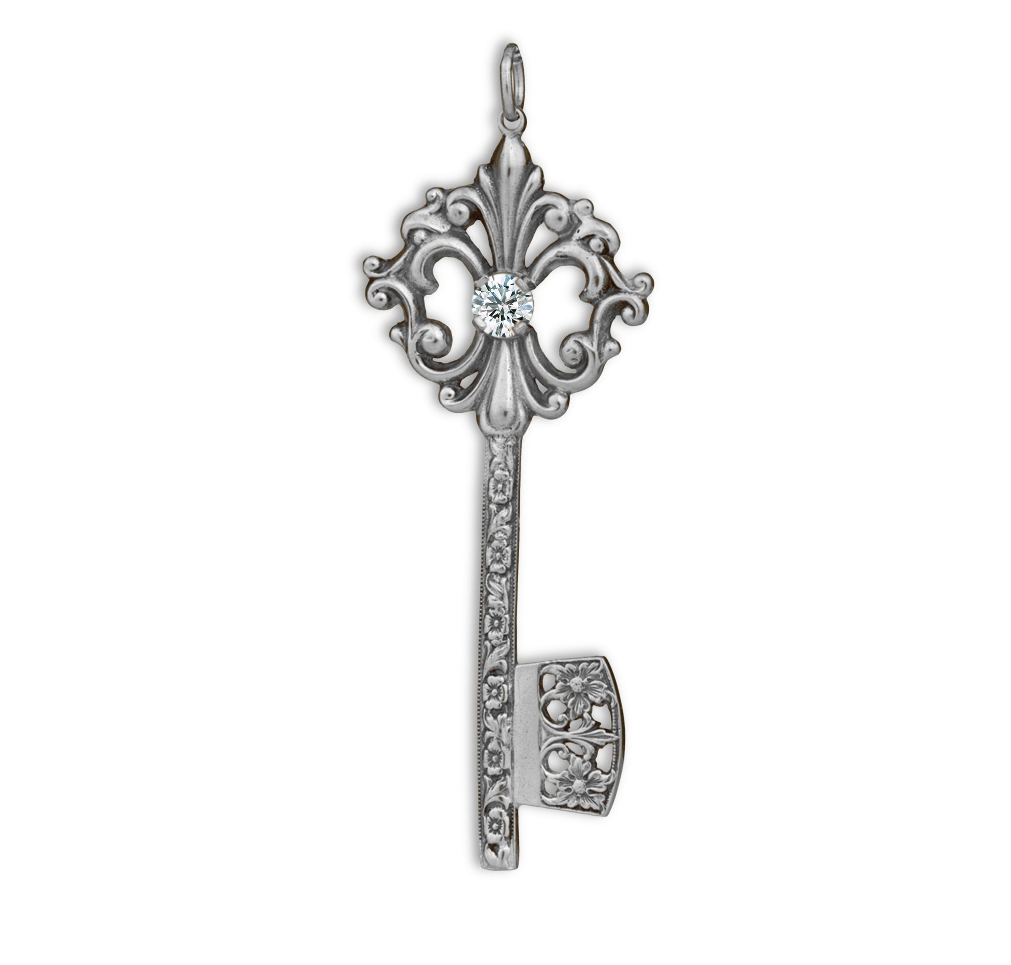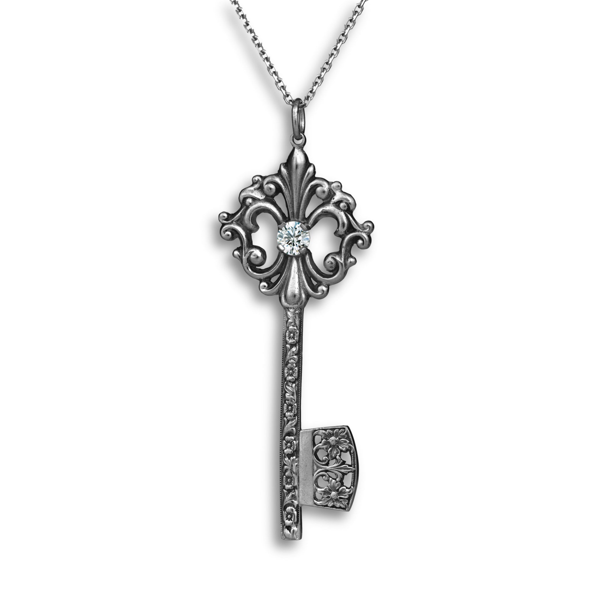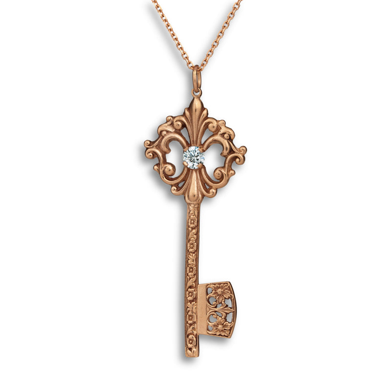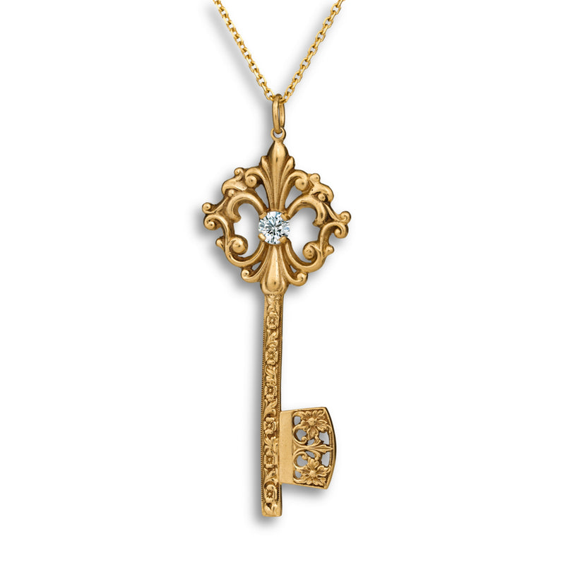 This elegant Grande Key Pendant symbolizes opportunity, new beginnings, and the power to unlock your future. Inspired by antique key designs, it features ornate vintage-style scrollwork and a brilliant 5mm center stone that catches the light beautifully. The detailed shaft and openwork bit add a classic, timeless character, making this pendant a meaningful piece that represents possibility, growth, and the doors waiting to be opened.
