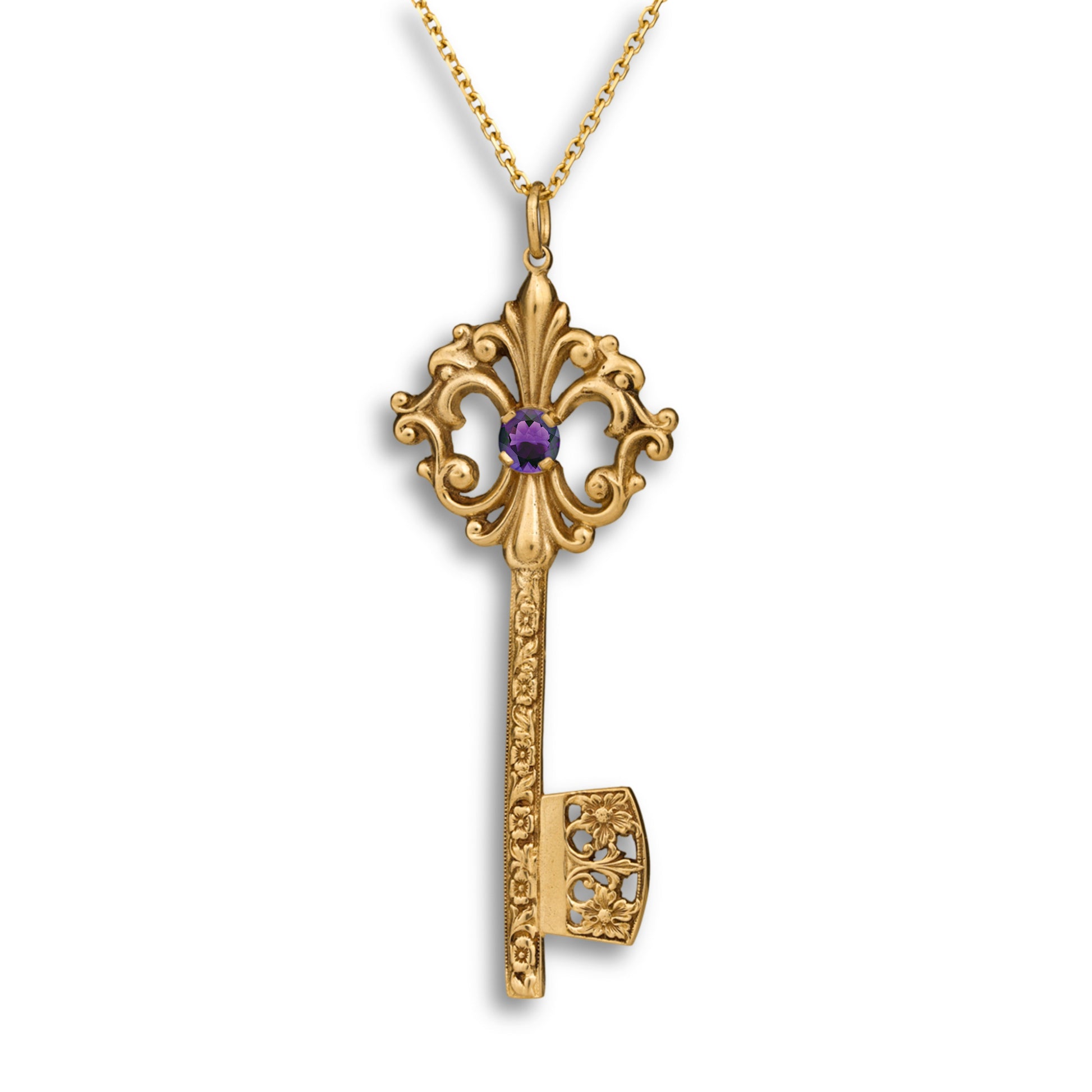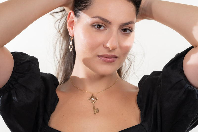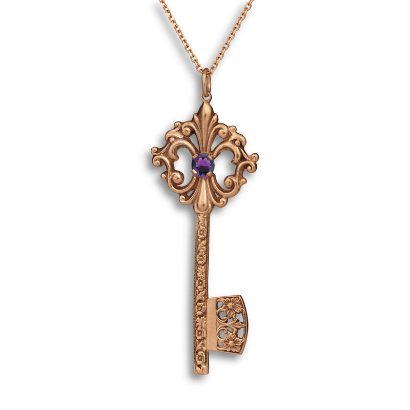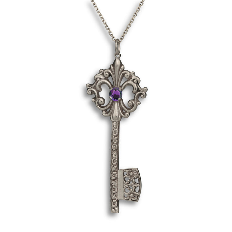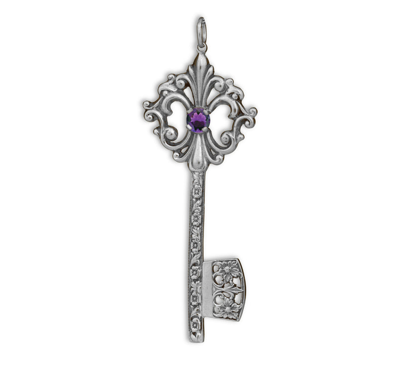 This elegant Grande Key Pendant symbolizes opportunity, new beginnings, and the power to unlock your future. Inspired by antique key designs, it features ornate vintage-style scrollwork and a brilliant 5mm center stone that catches the light beautifully. The detailed shaft and openwork bit add a classic, timeless character, making this pendant a meaningful piece that represents possibility, growth, and the doors waiting to be opened.