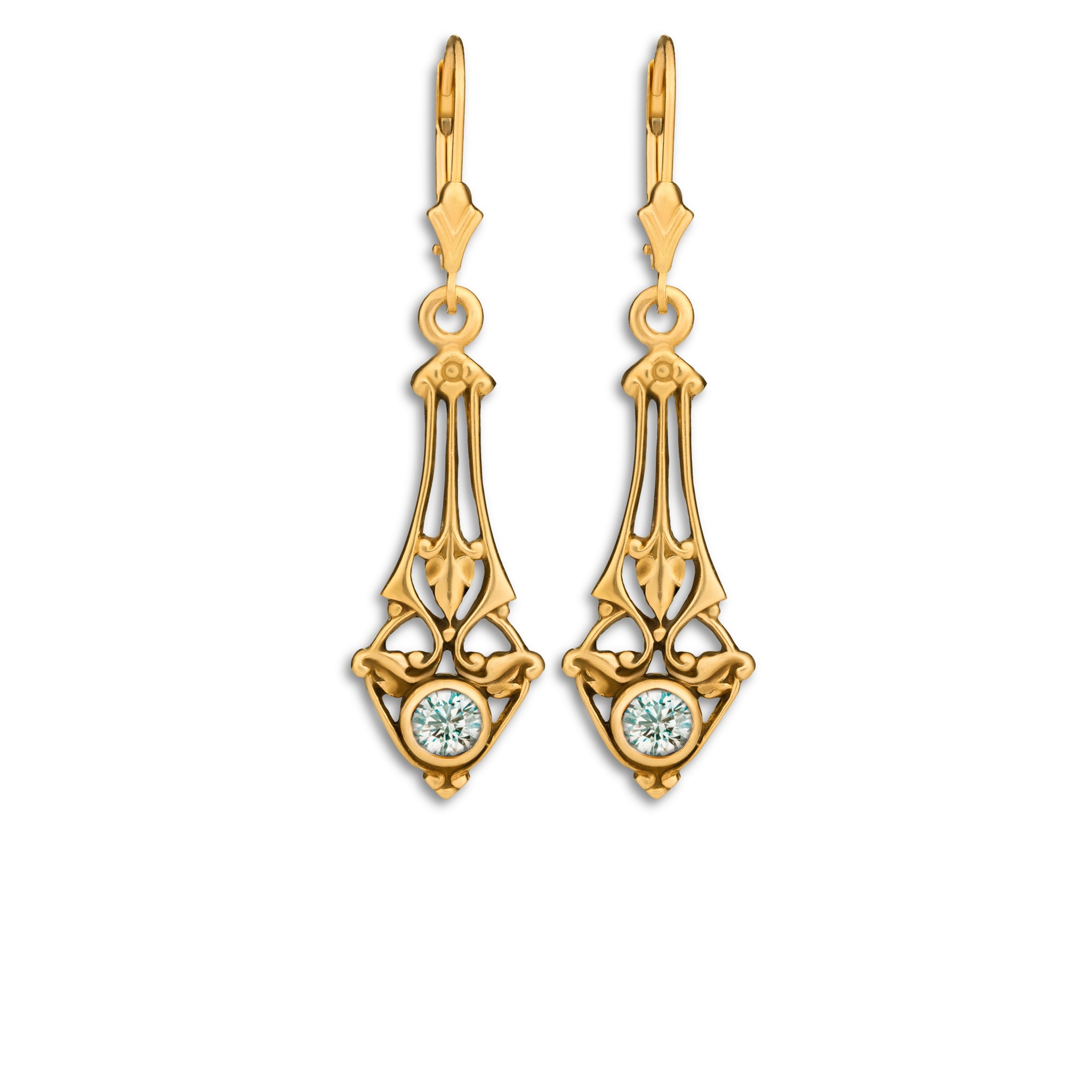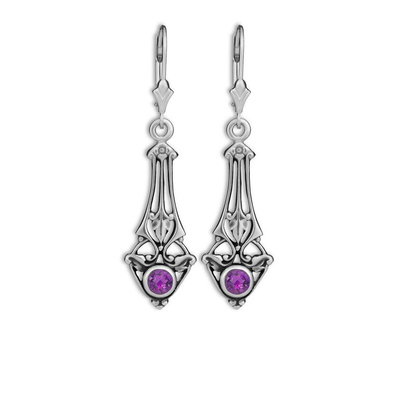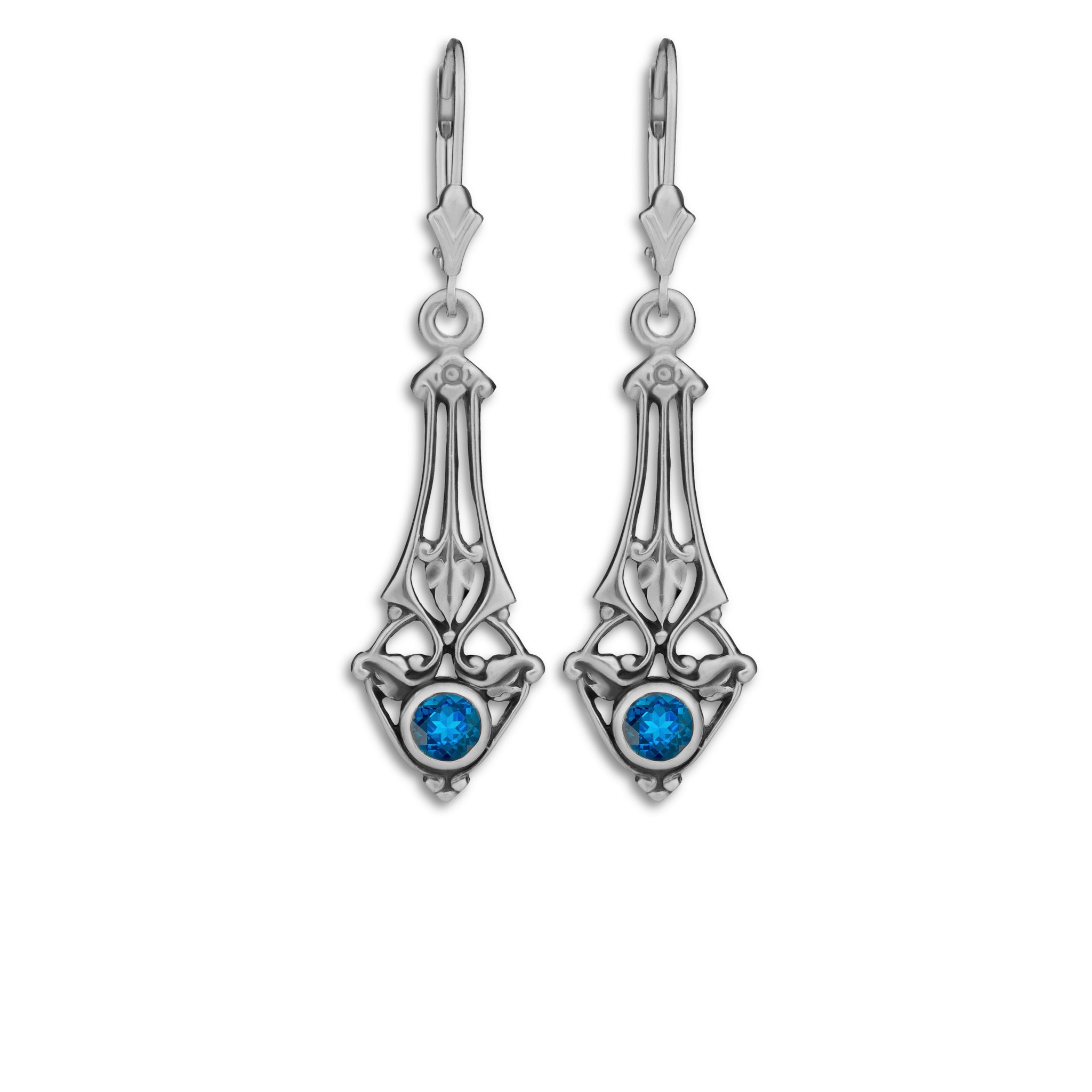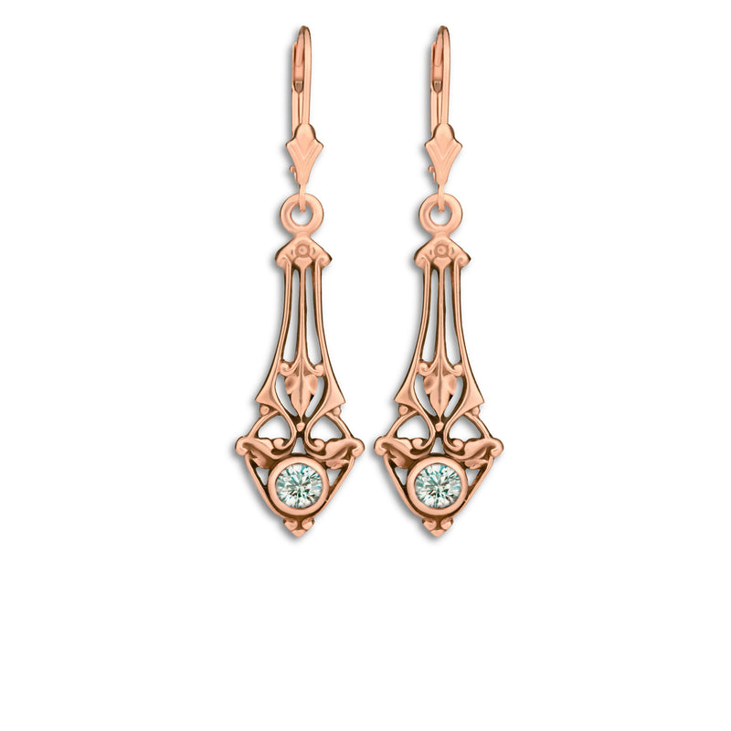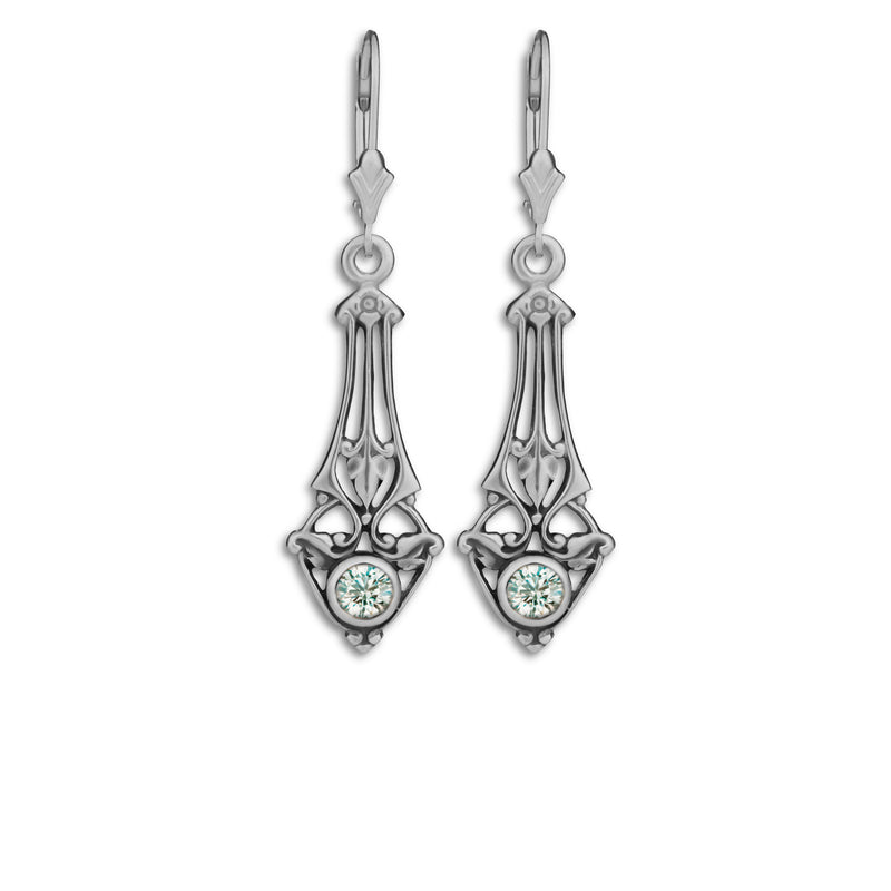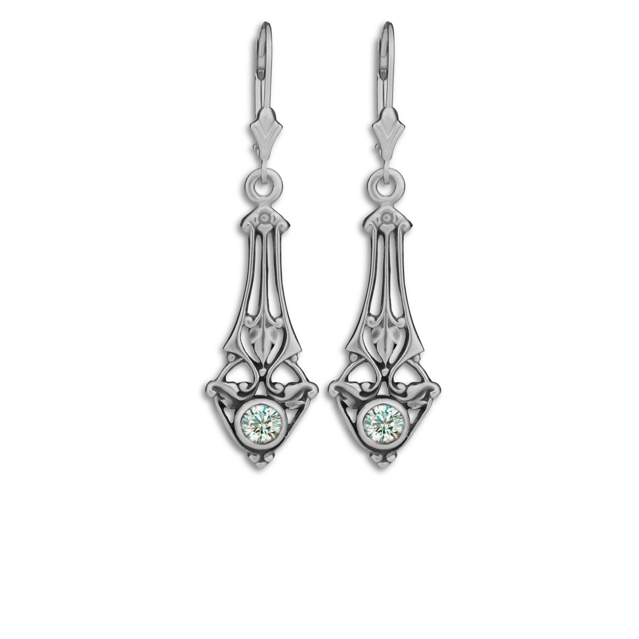 Designed with simple veronica blossoms, sinuous art nouveau lines and flowing leaves of ivy, these dangling earrings represent the never-ending bond and devotion of friendship and marriage. They are bezel set with your choice of a 4.5mm round diamond or gemstone.