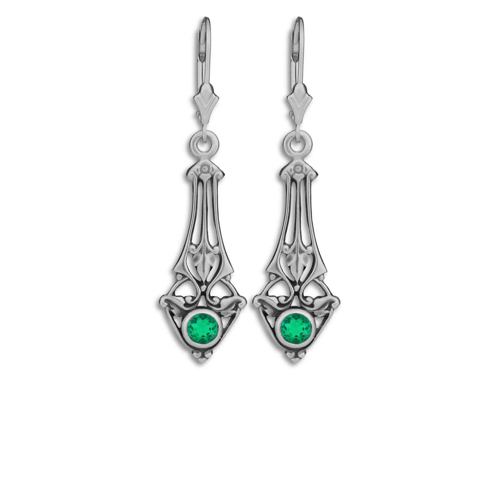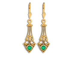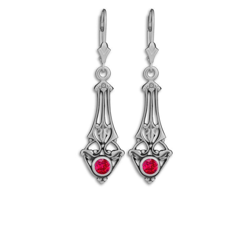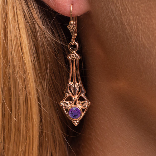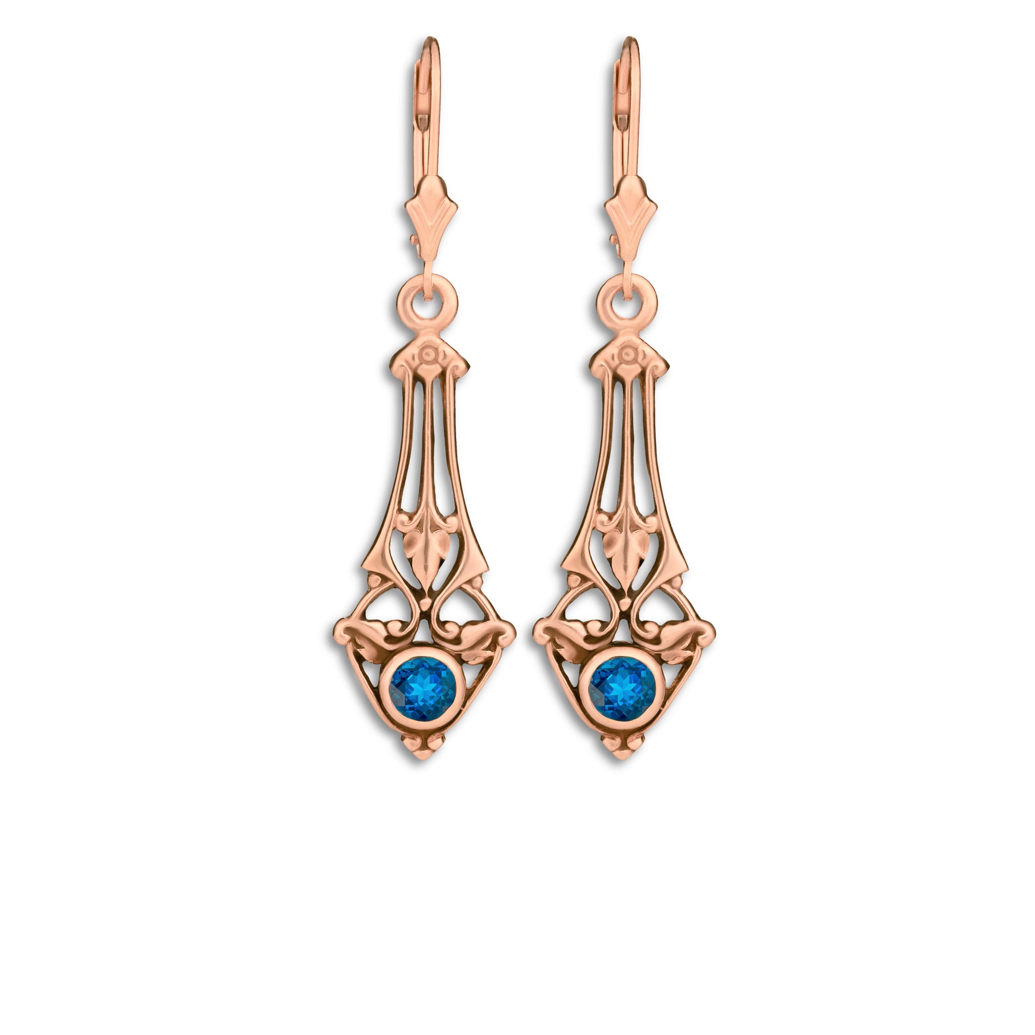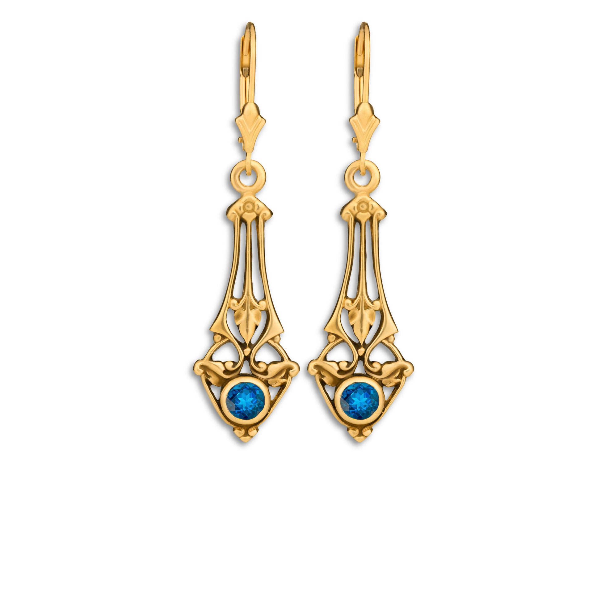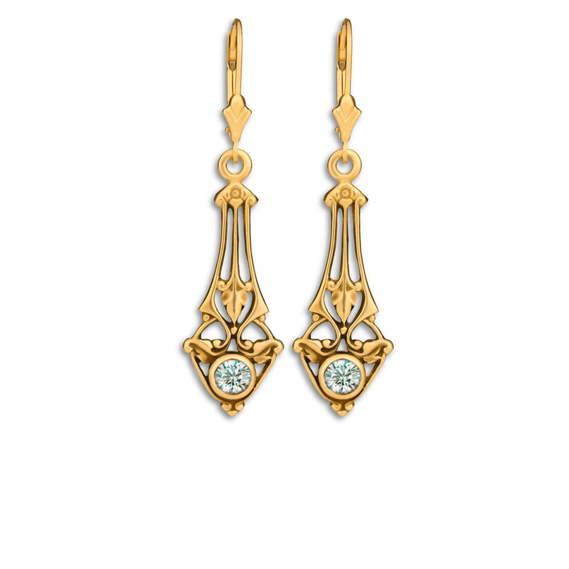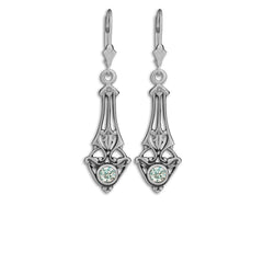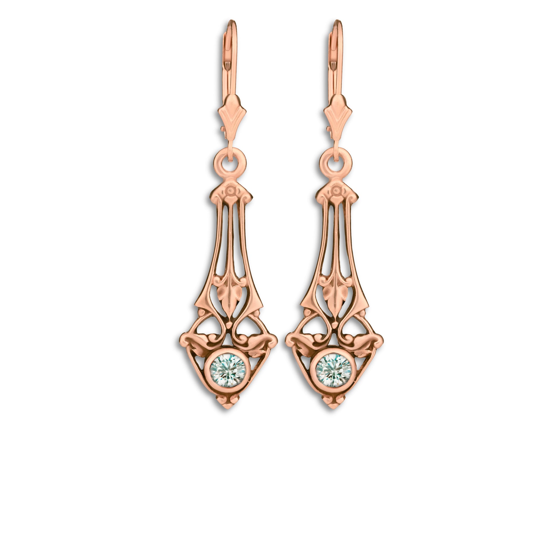Designed with simple veronica blossoms, sinuous art nouveau lines and flowing leaves of ivy, these dangling earrings represent the never-ending bond and devotion of friendship and marriage. They are bezel set with your choice of a 4.5mm round diamond or gemstone.