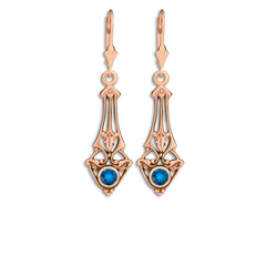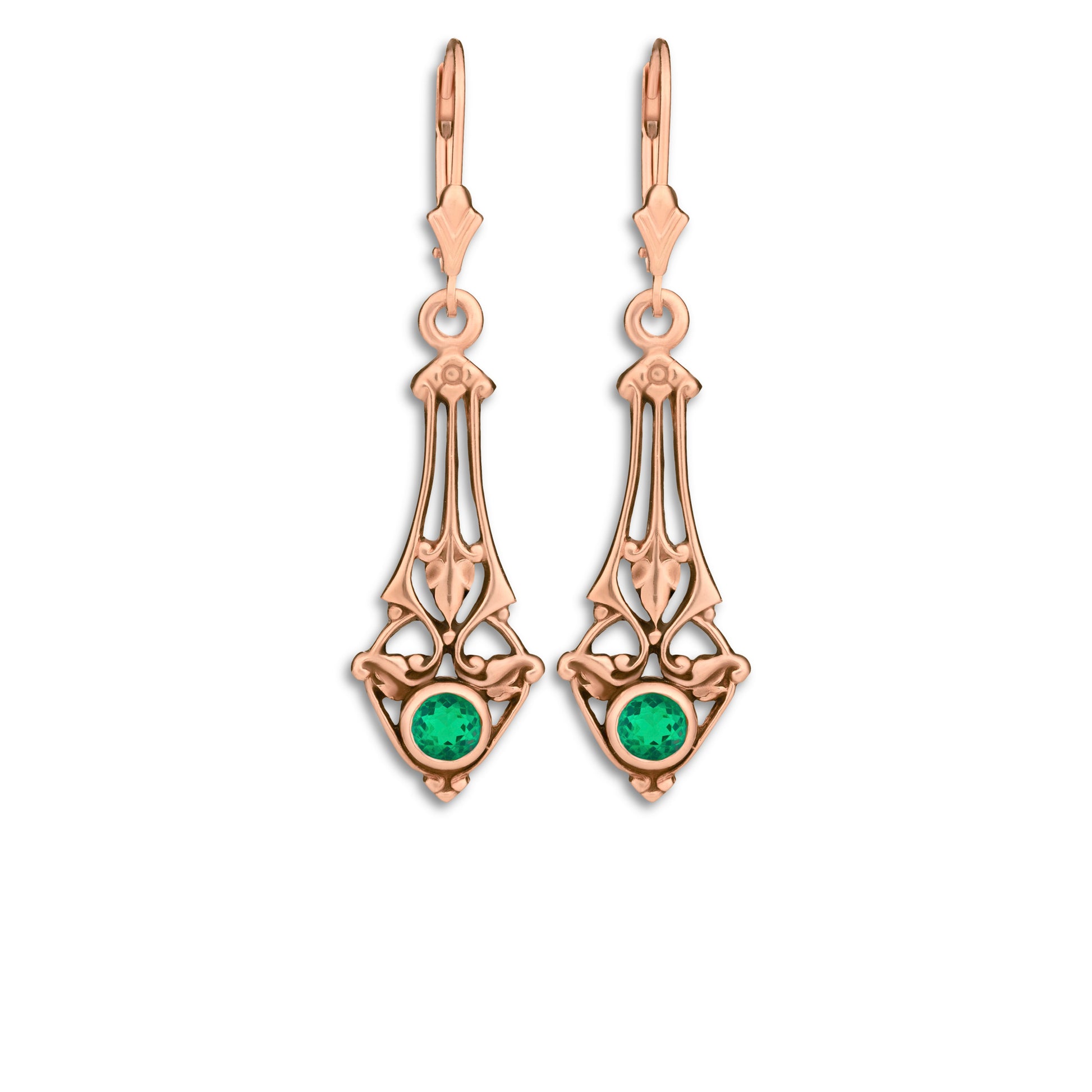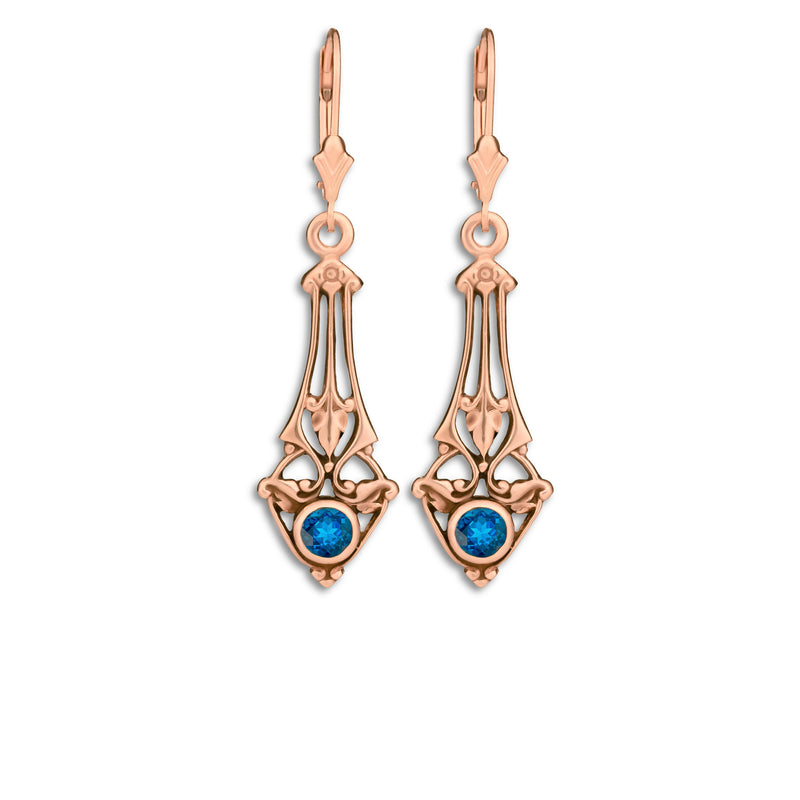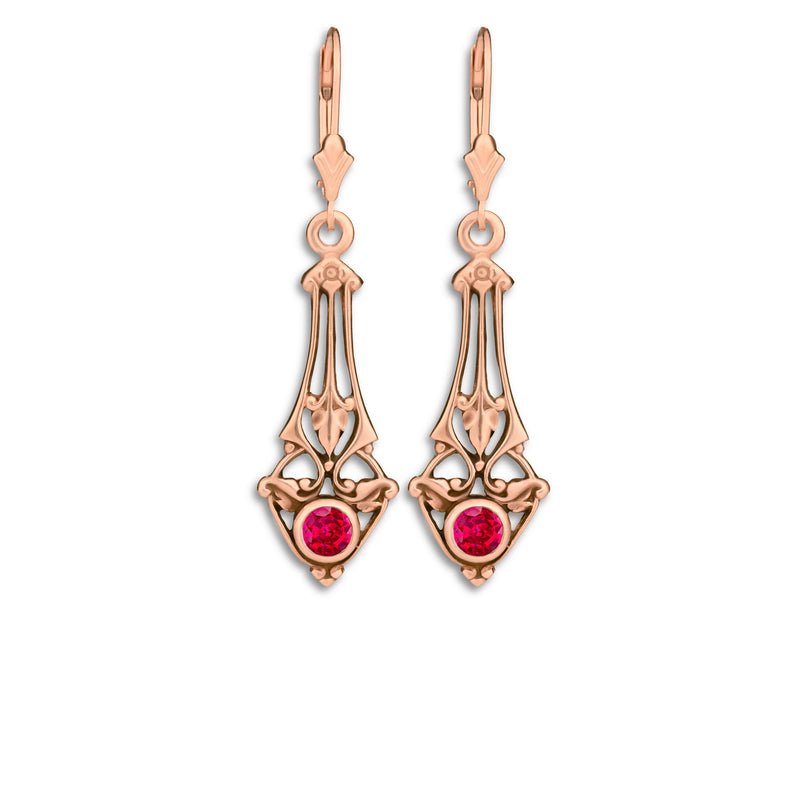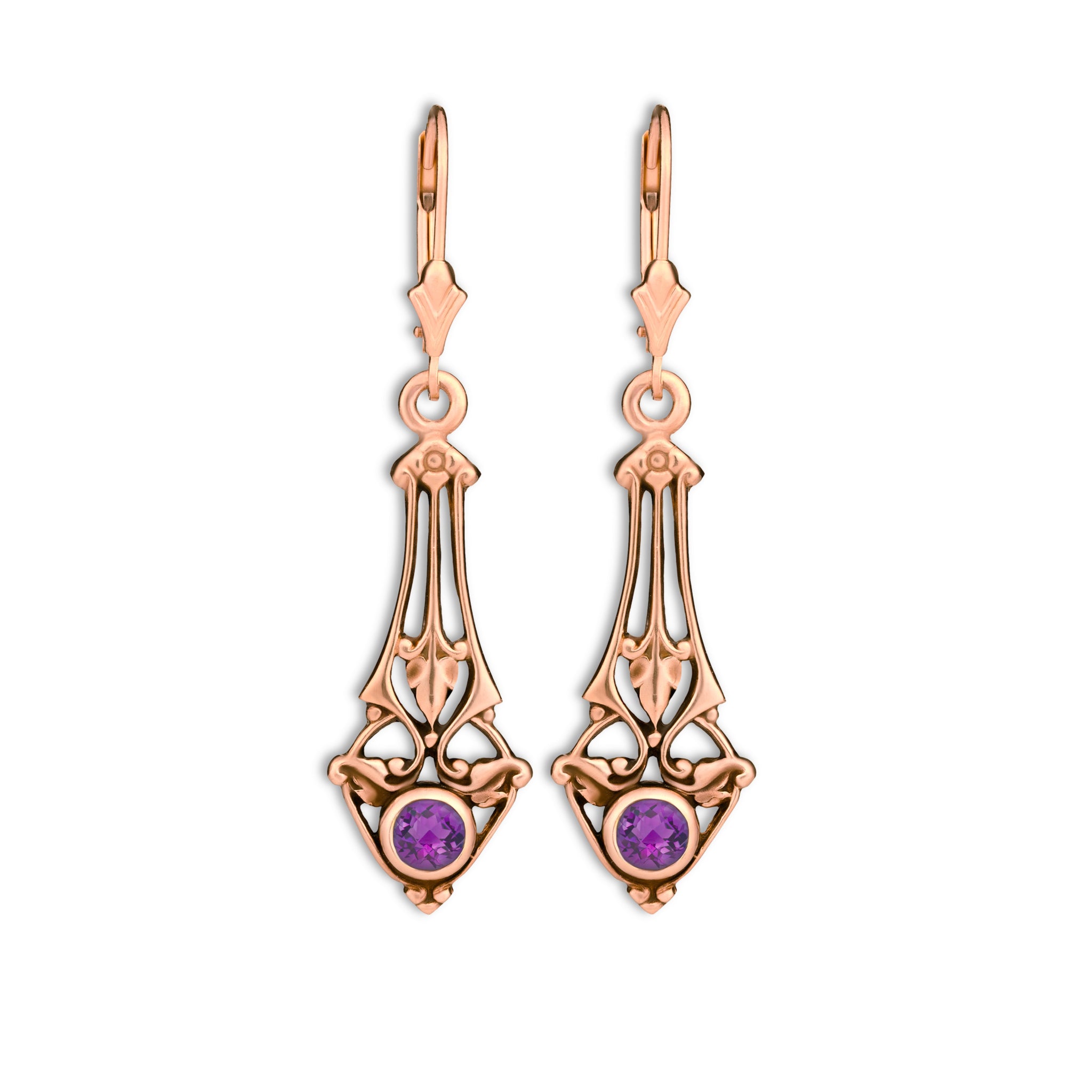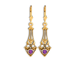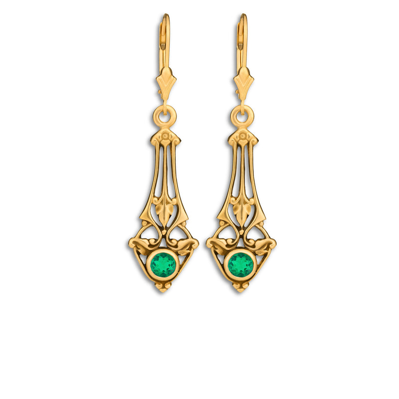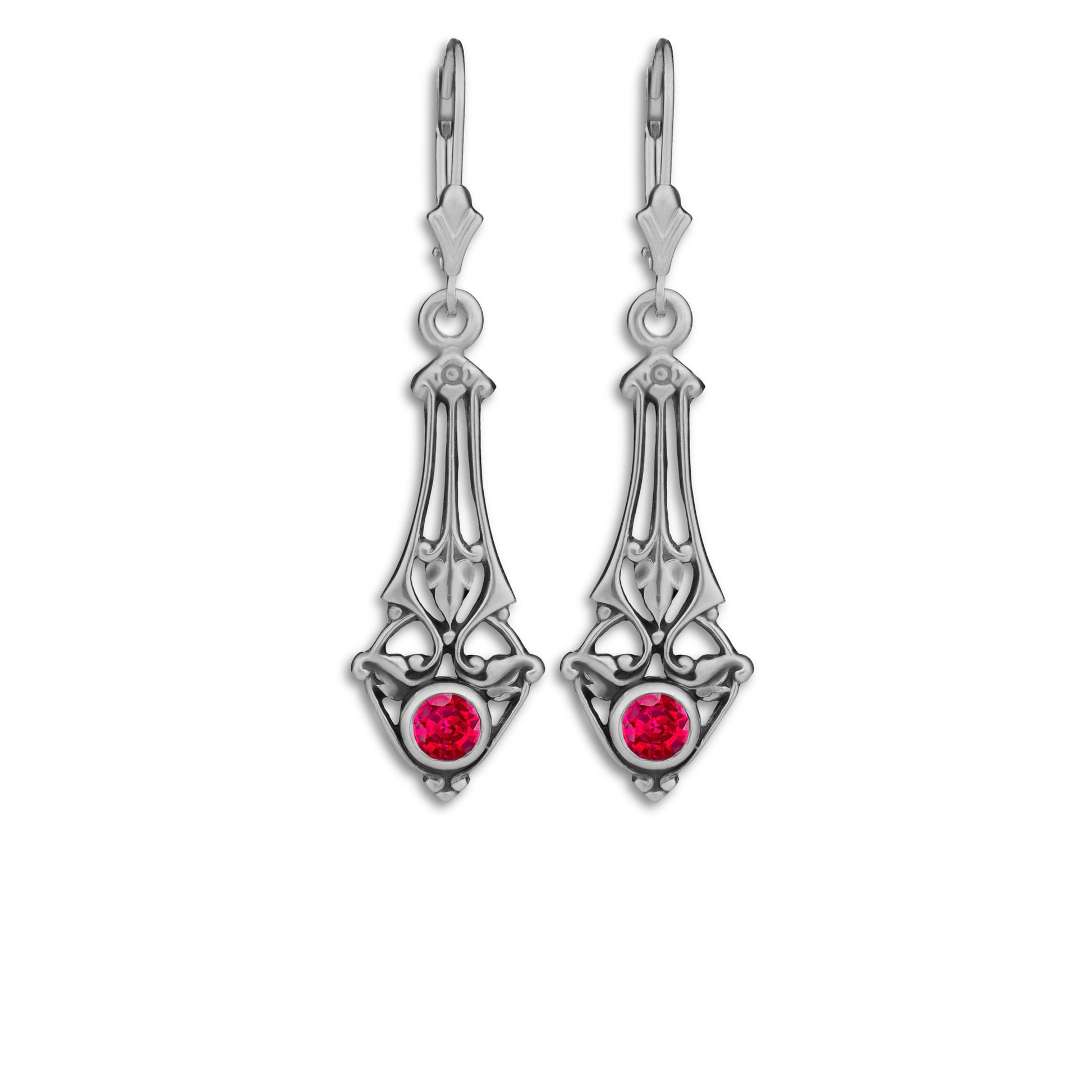Designed with simple veronica blossoms, sinuous art nouveau lines and flowing leaves of ivy, these dangling earrings represent the never-ending bond and devotion of friendship and marriage. They are bezel set with your choice of a 4.5mm round diamond or gemstone.