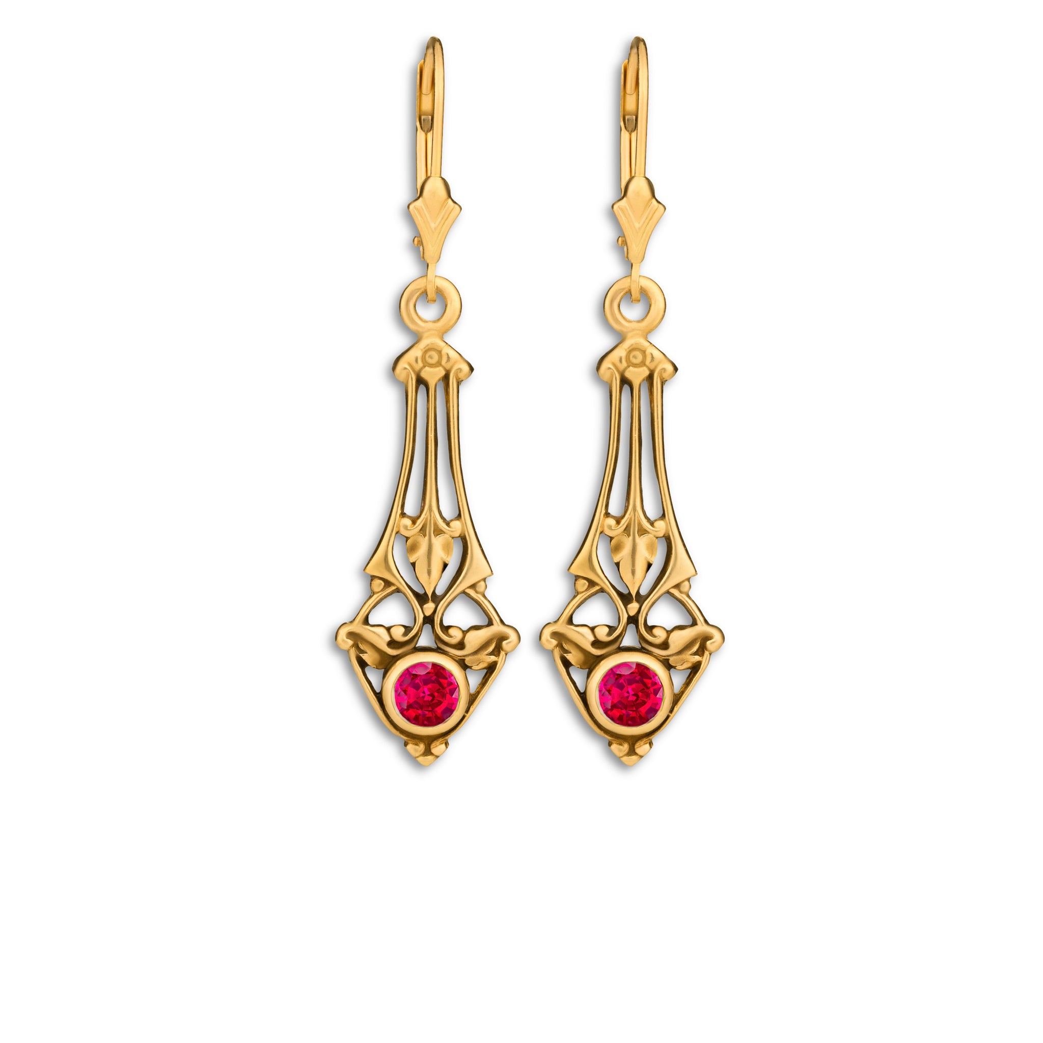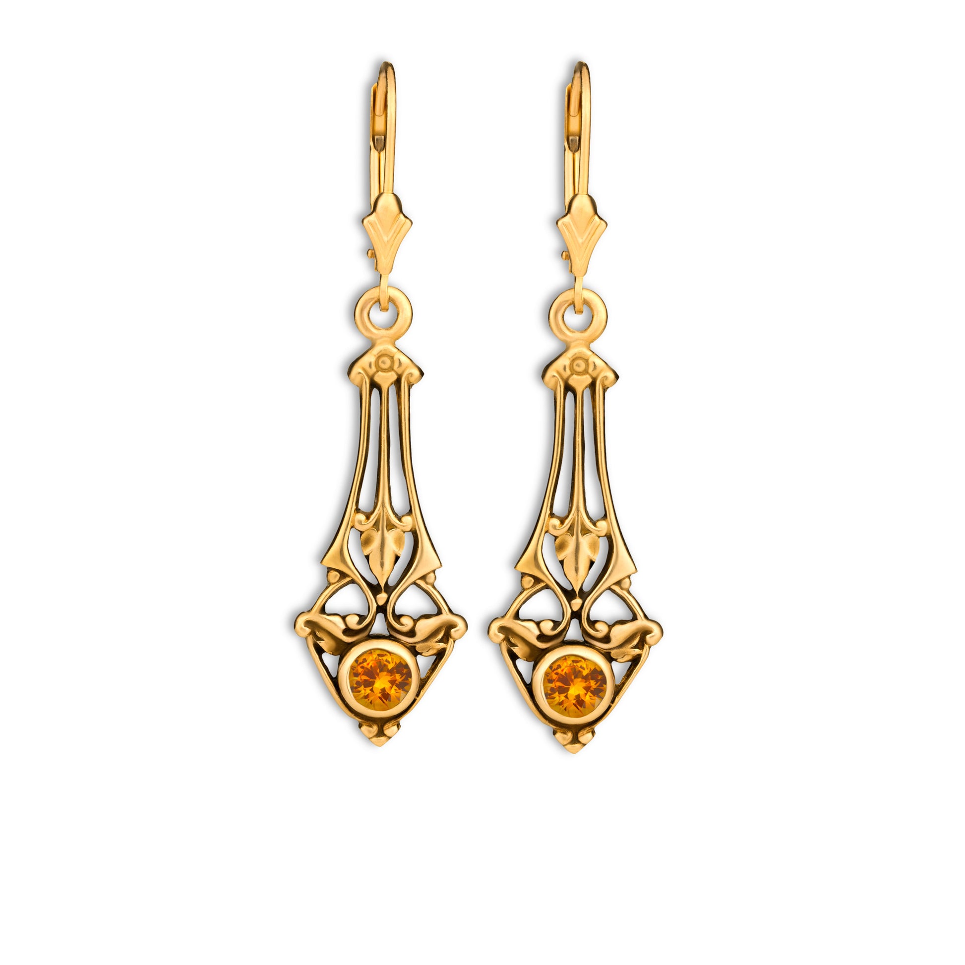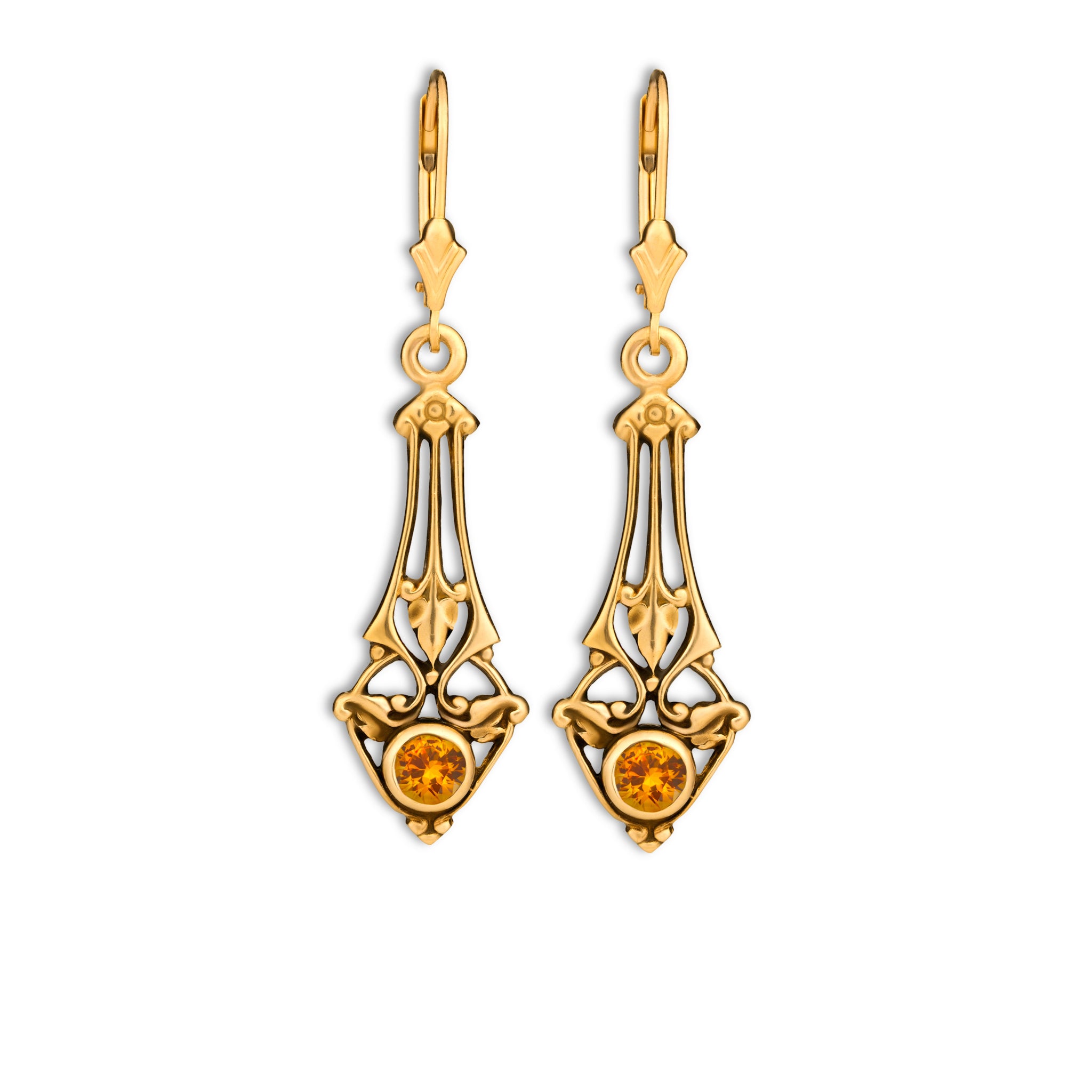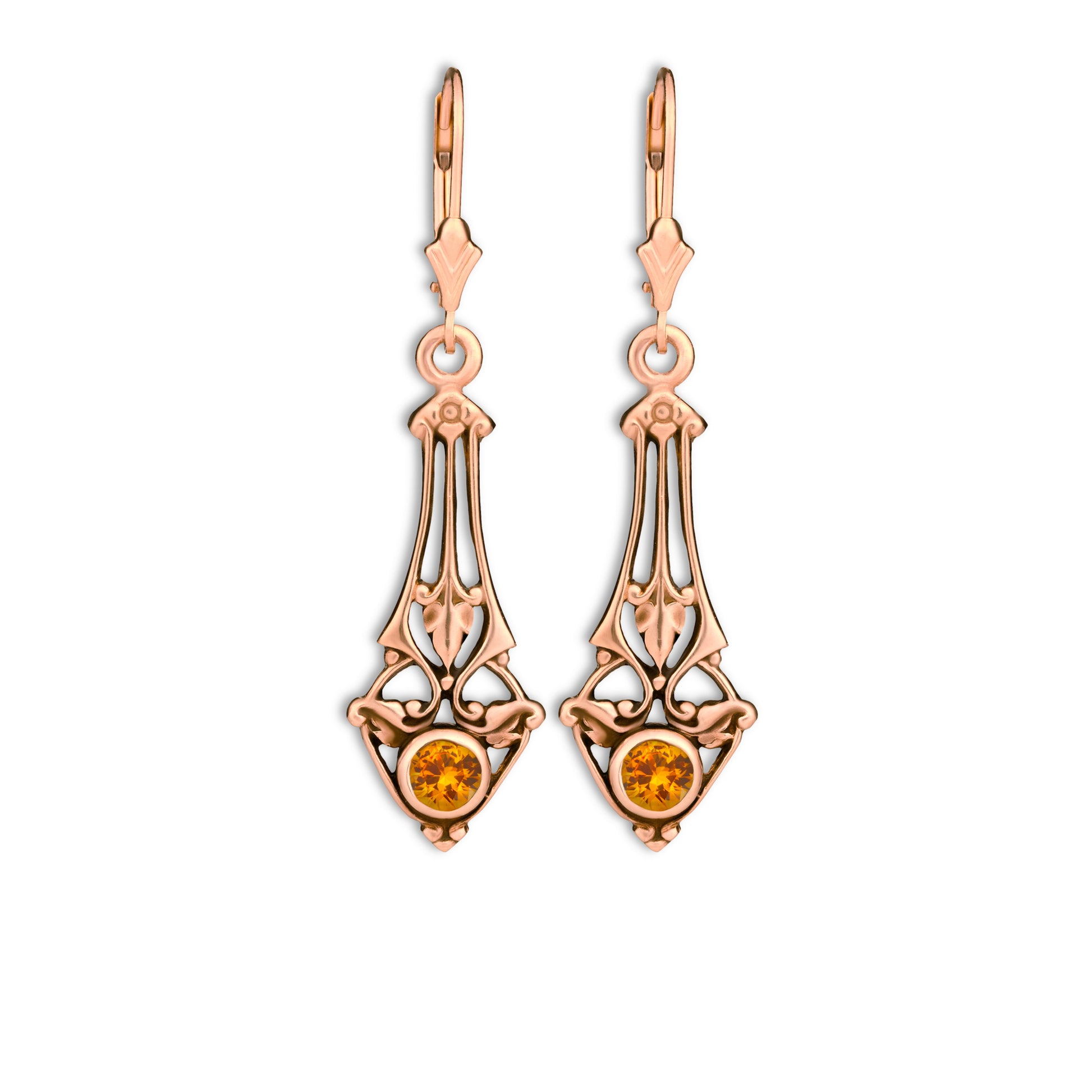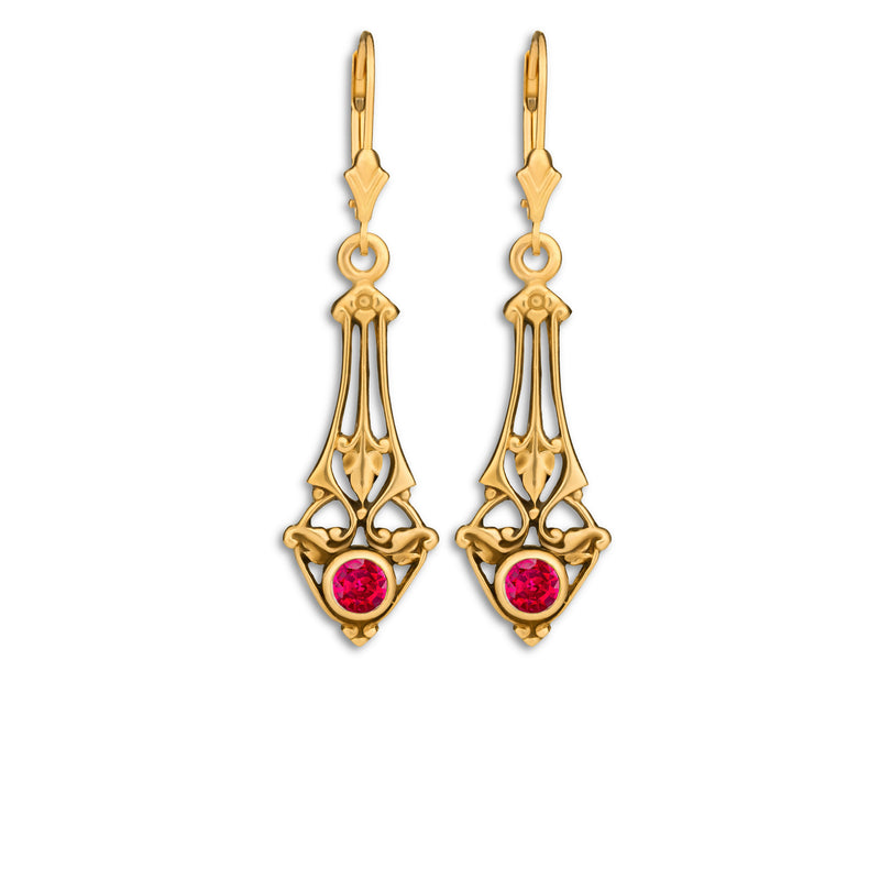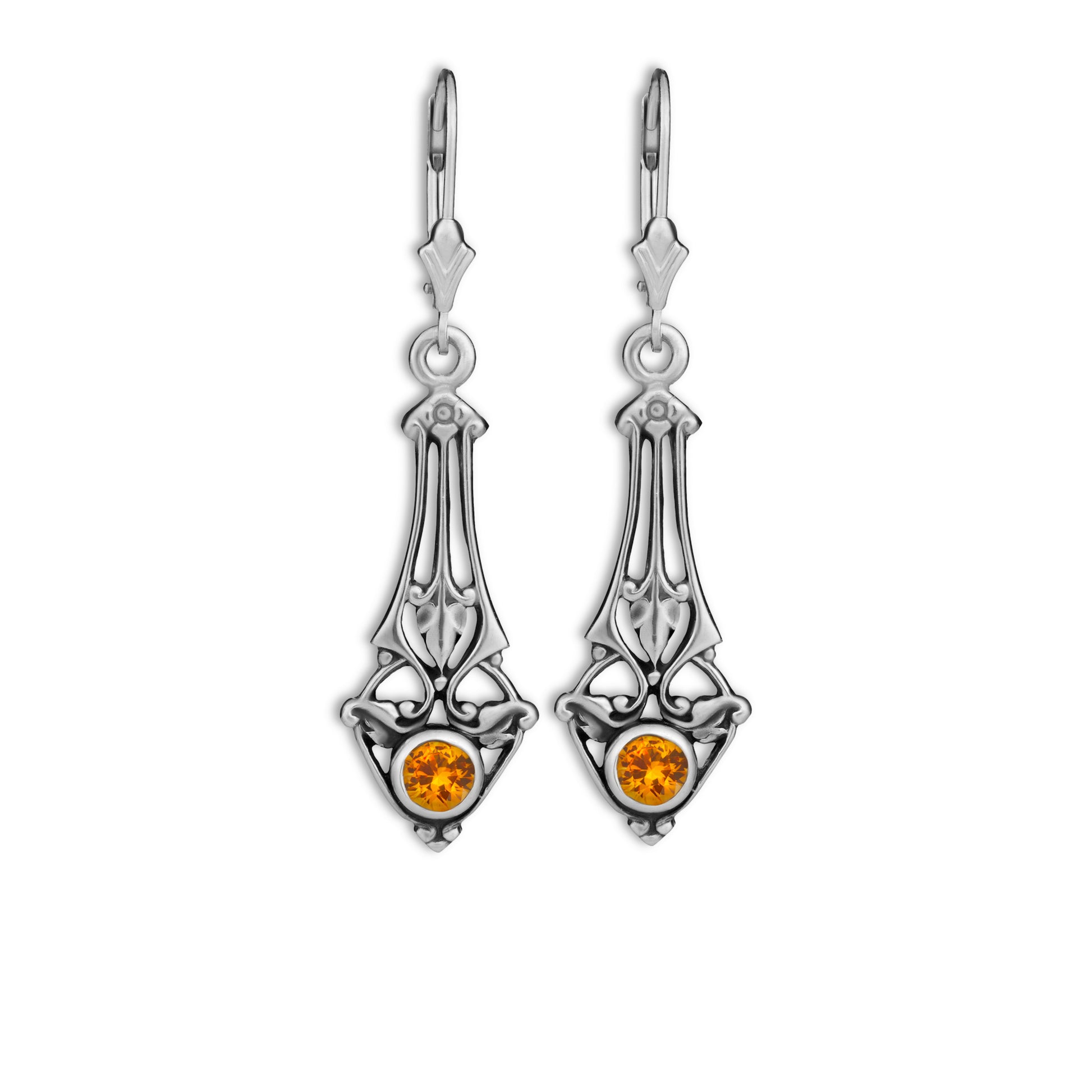 Designed with simple veronica blossoms, sinuous art nouveau lines and flowing leaves of ivy, these dangling earrings represent the never-ending bond and devotion of friendship and marriage. They are bezel set with your choice of a 4.5mm round diamond or gemstone.