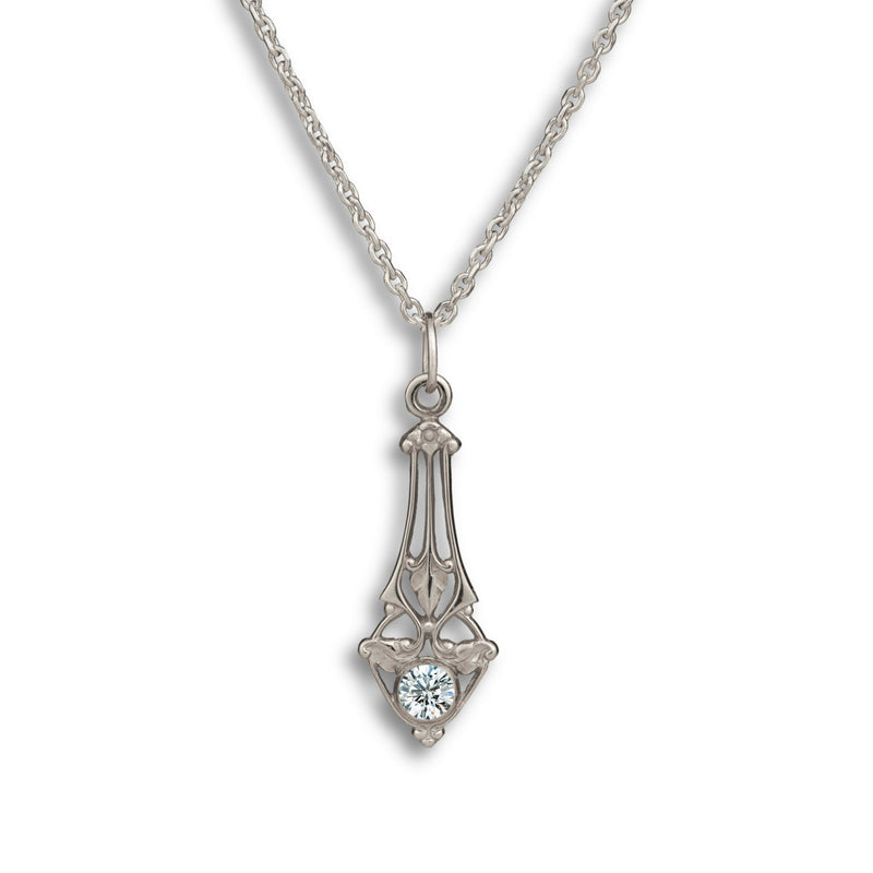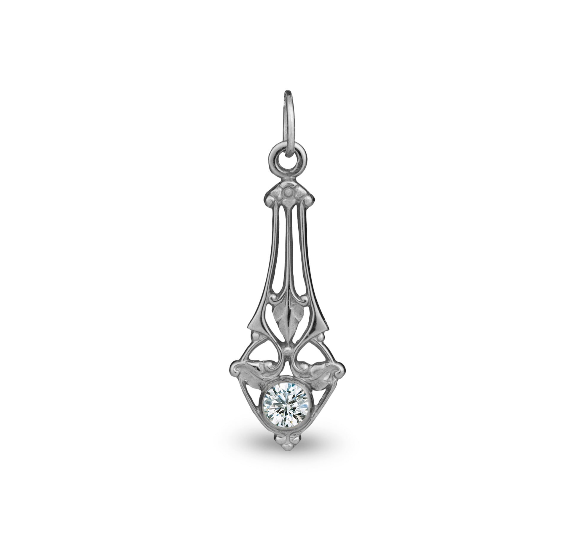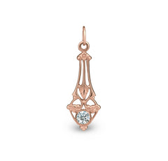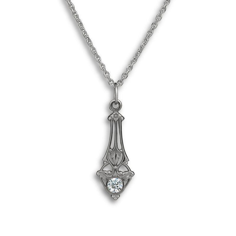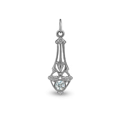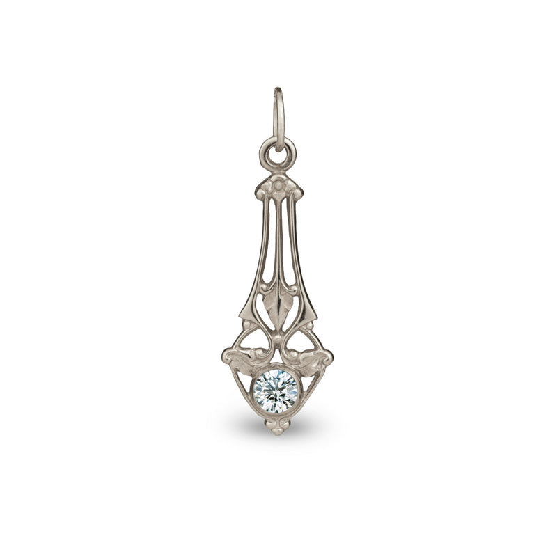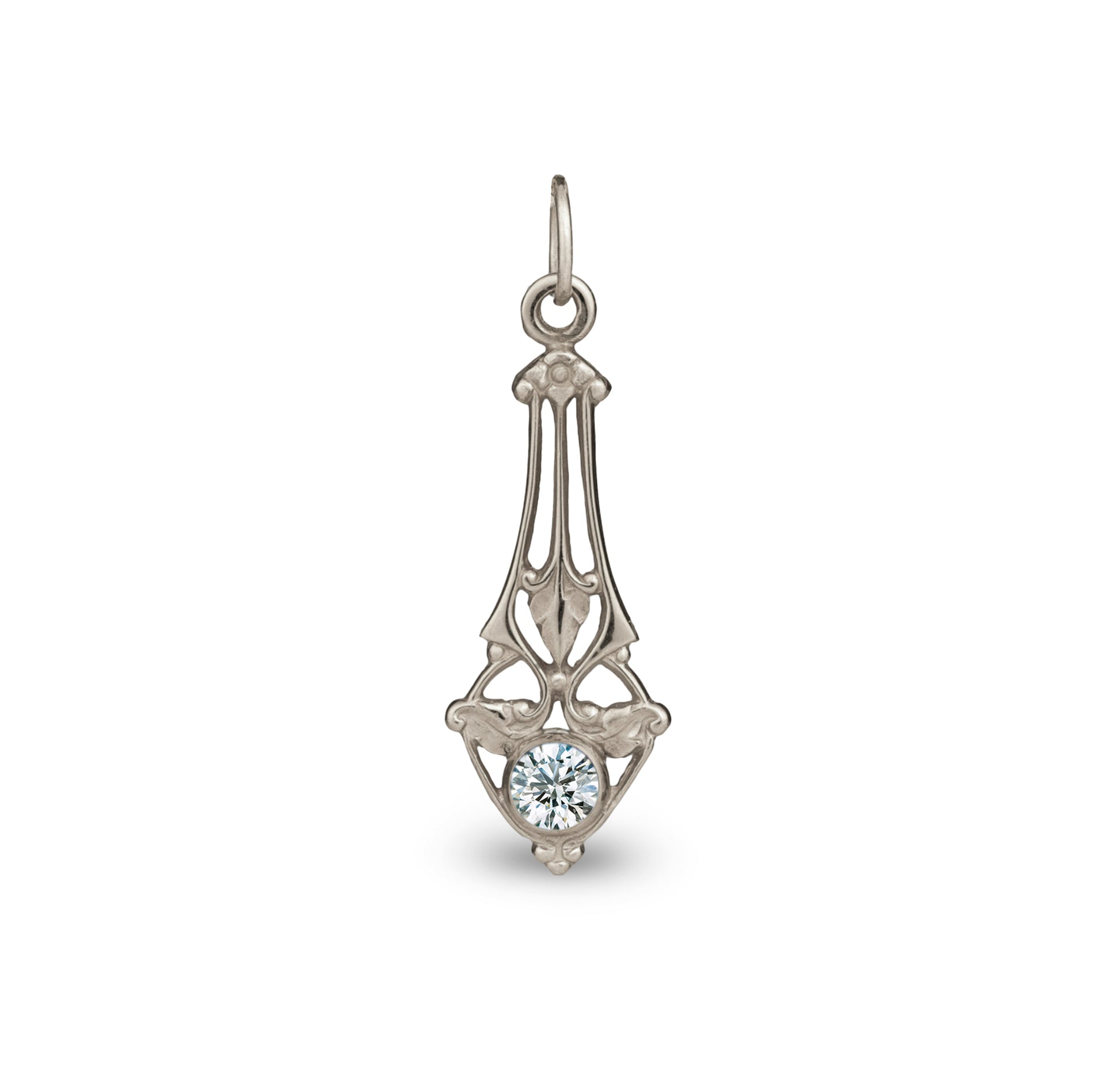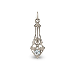 Designed with simple veronica blossoms, sinuous art nouveau lines, and flowing leaves of ivy, these dangling earrings represent the never-ending bond and devotion of friendship and marriage. They are bezel set with your choice of a 4.5mm round diamond or gemstone.