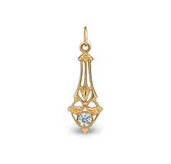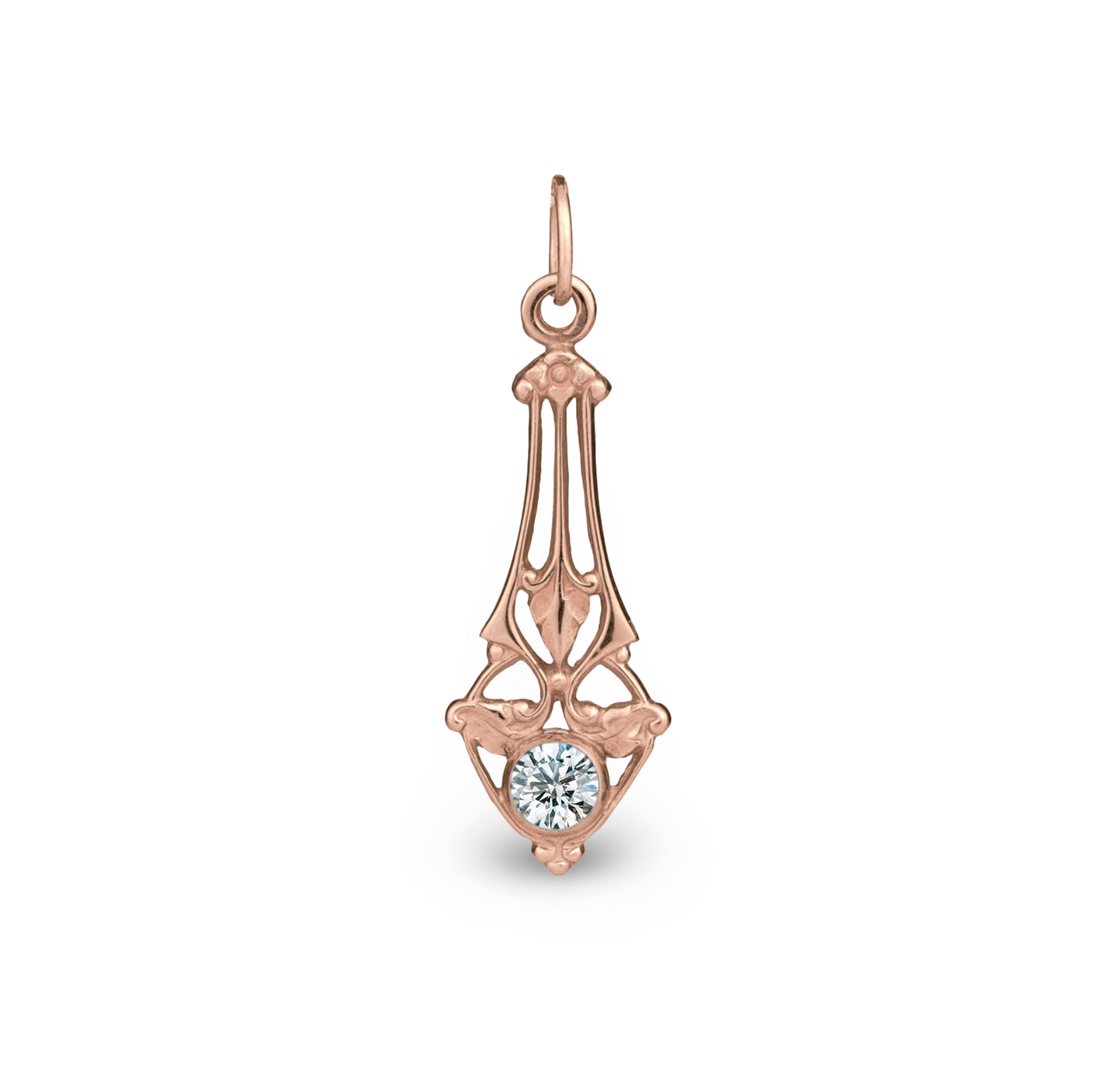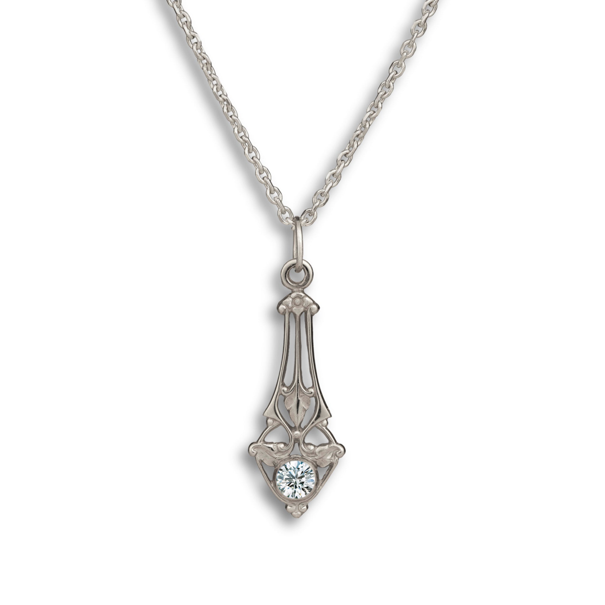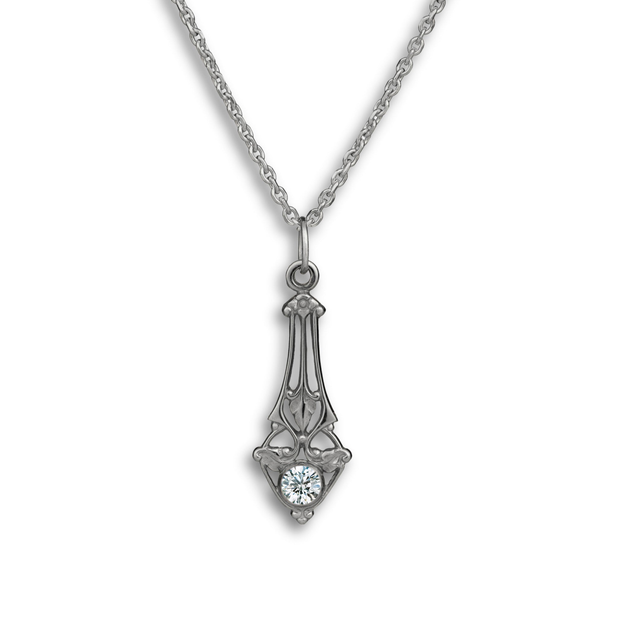 Designed with simple veronica blossoms, sinuous art nouveau lines, and flowing leaves of ivy, these dangling earrings represent the never-ending bond and devotion of friendship and marriage. They are bezel set with your choice of a 4.5mm round diamond or gemstone.