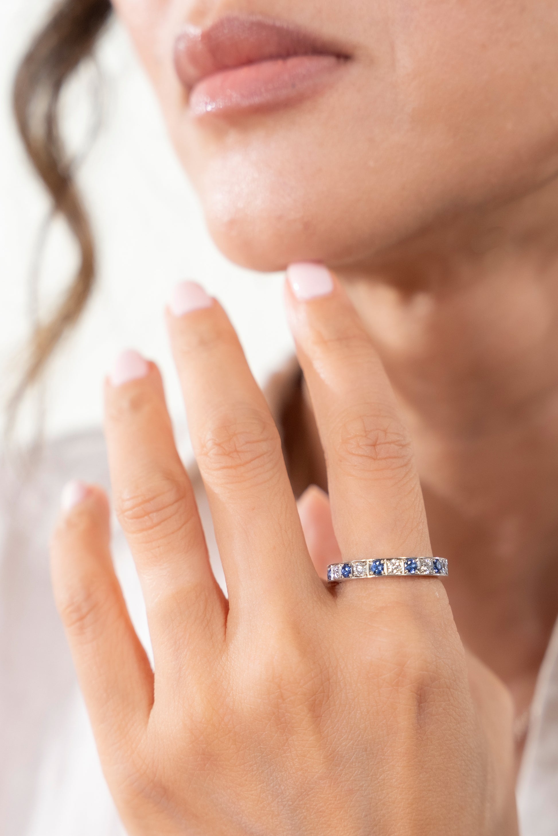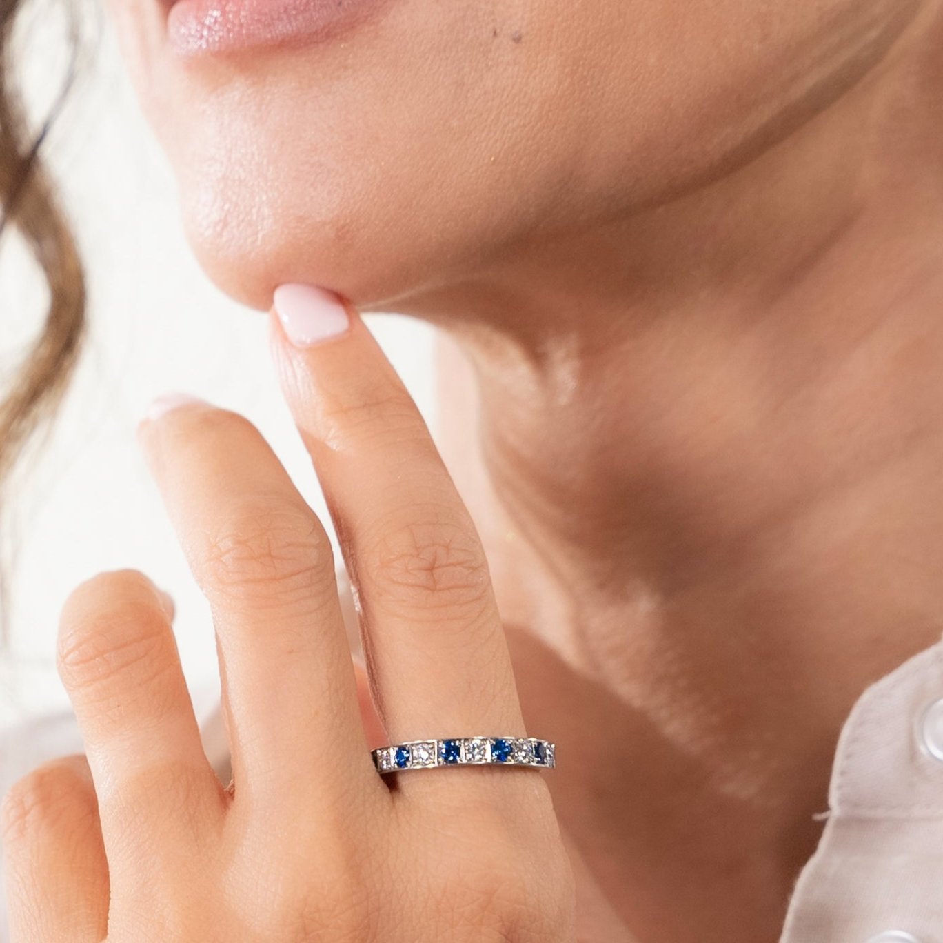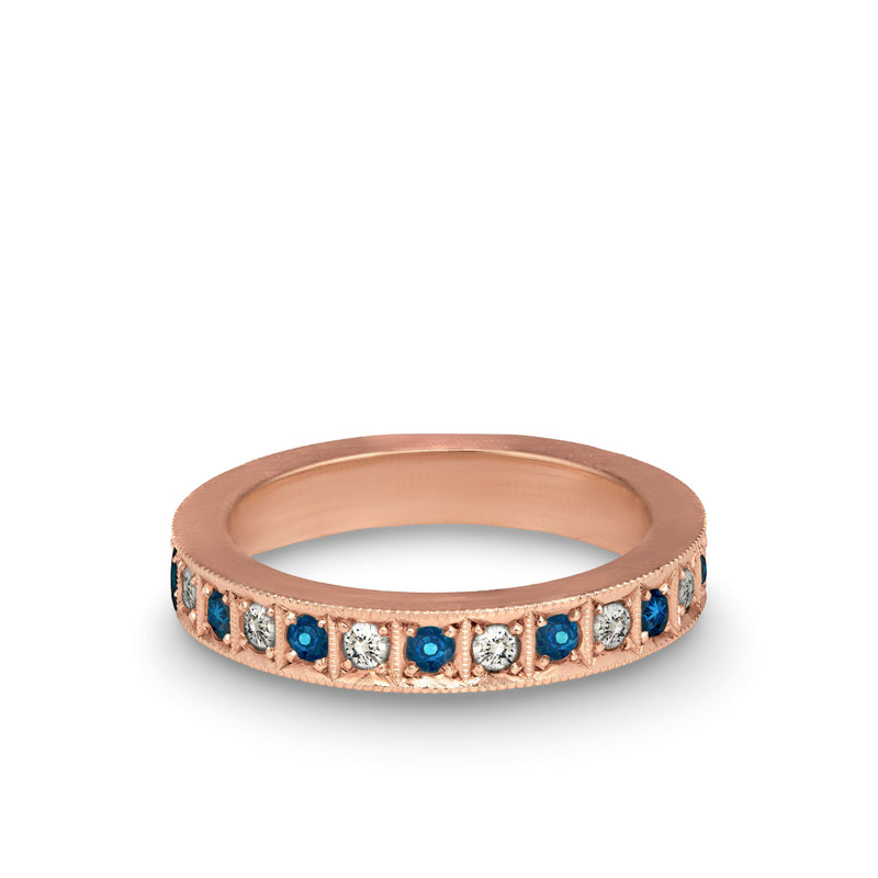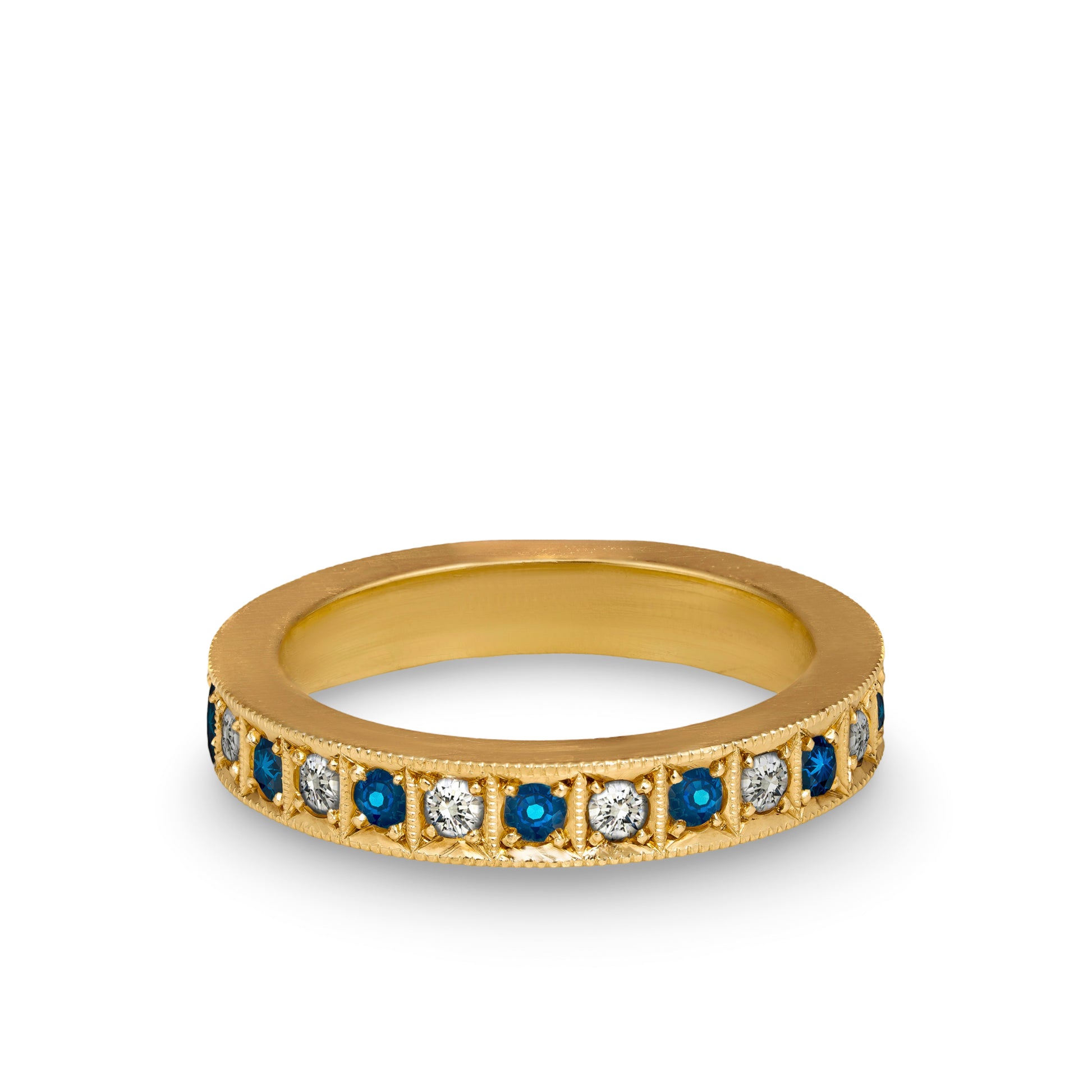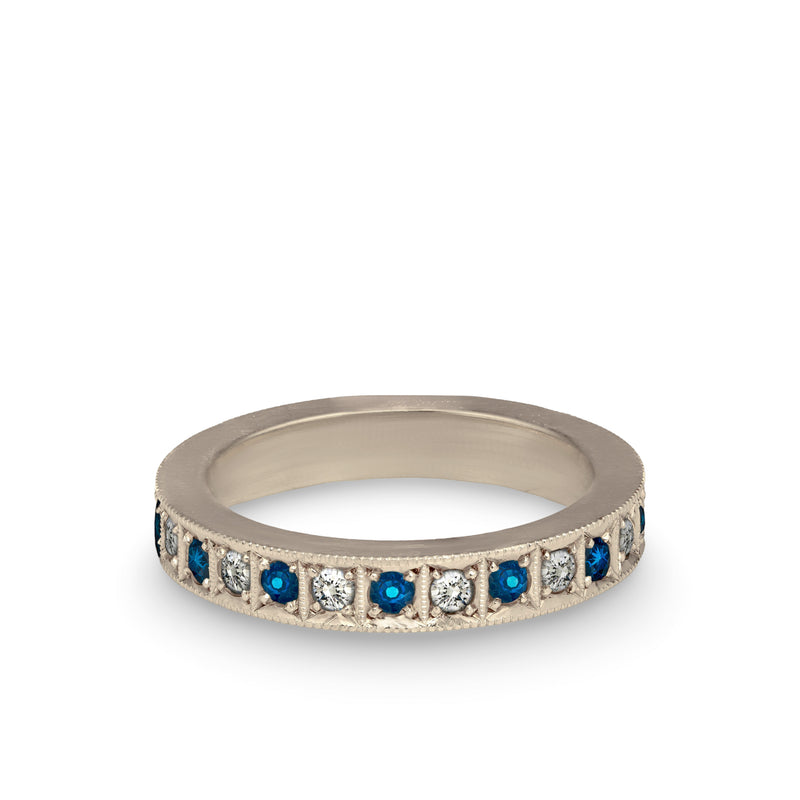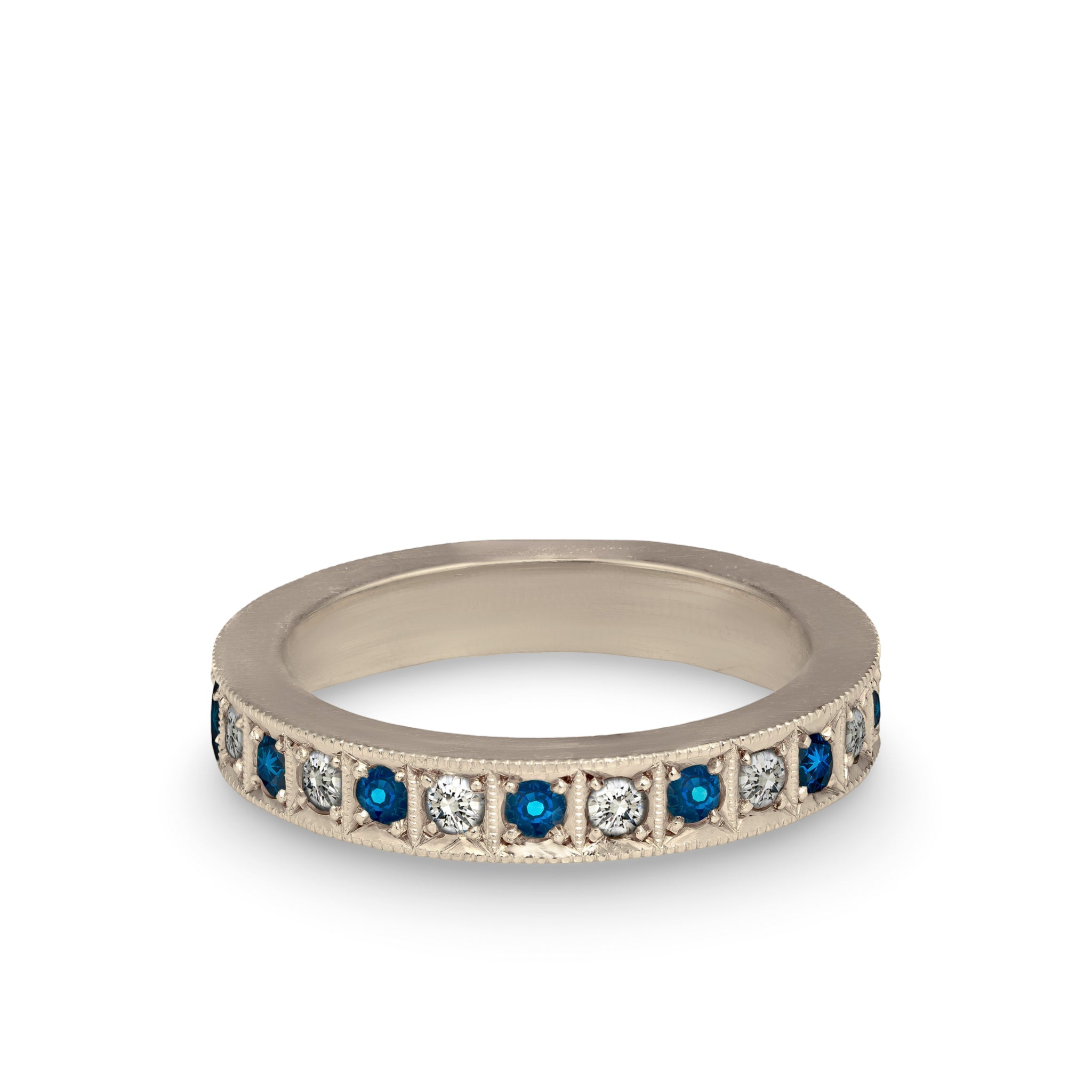 Infinity bands are a symbol of love having no beginning and no end. This ring is the perfect representation of eternal love between a couple. This half-channel band is set with 7 2.5mm sapphires and 6 2.5mm diamonds.