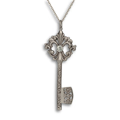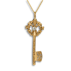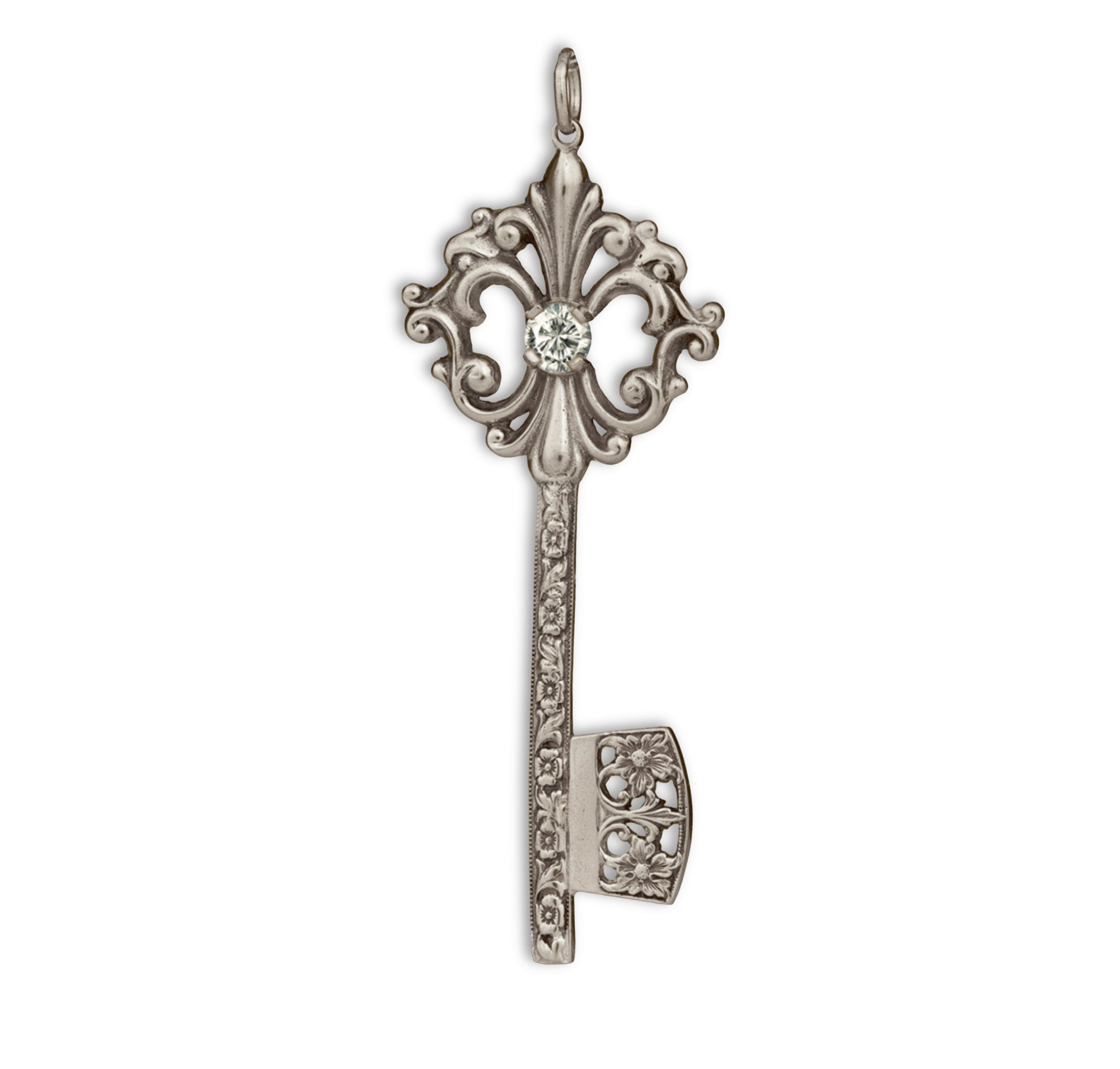 The Fleur-De Llis bos symbolizes purity, sweetness, and elegance. The stem decorated with Dogwood blossoms and Acanthus leaves symbolizes wisdom, health, and eternity. The bit, decorated with Dianthus represents courage and bravery. Complete this pendant with the 5mm gemstone of your choice.