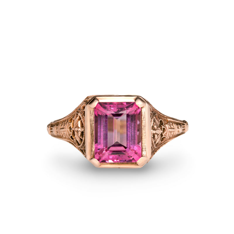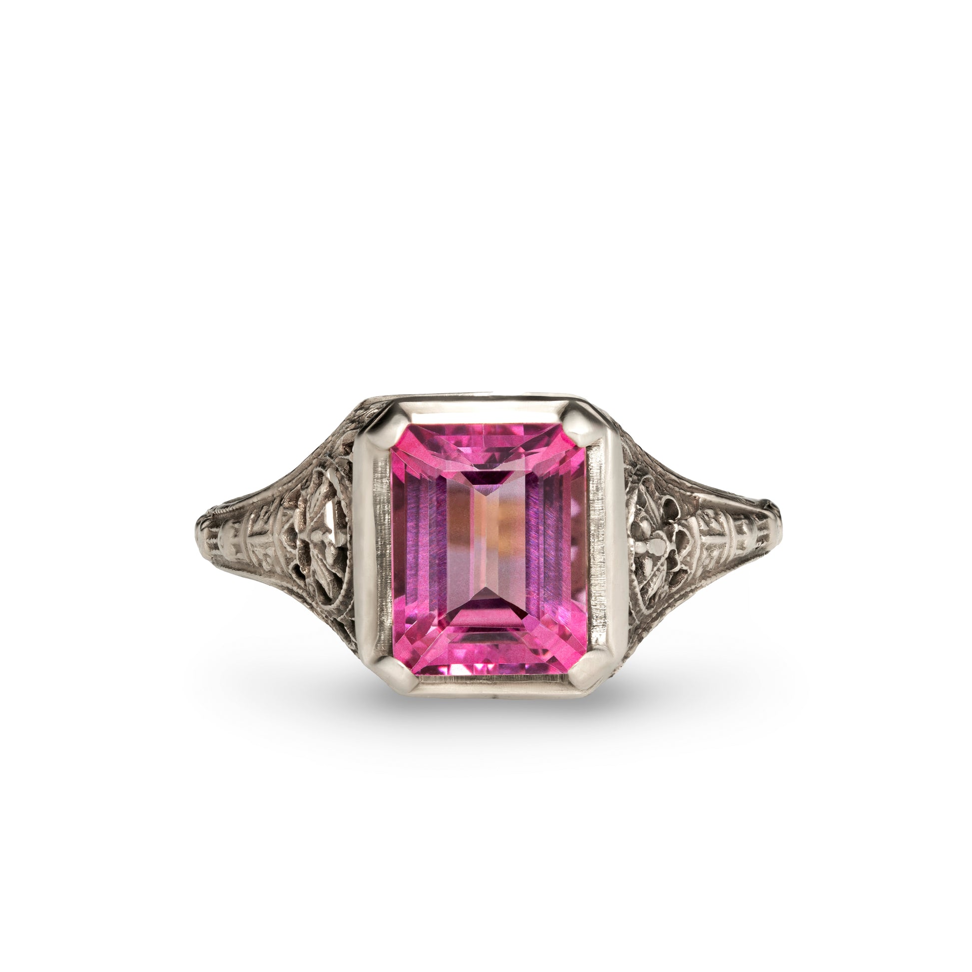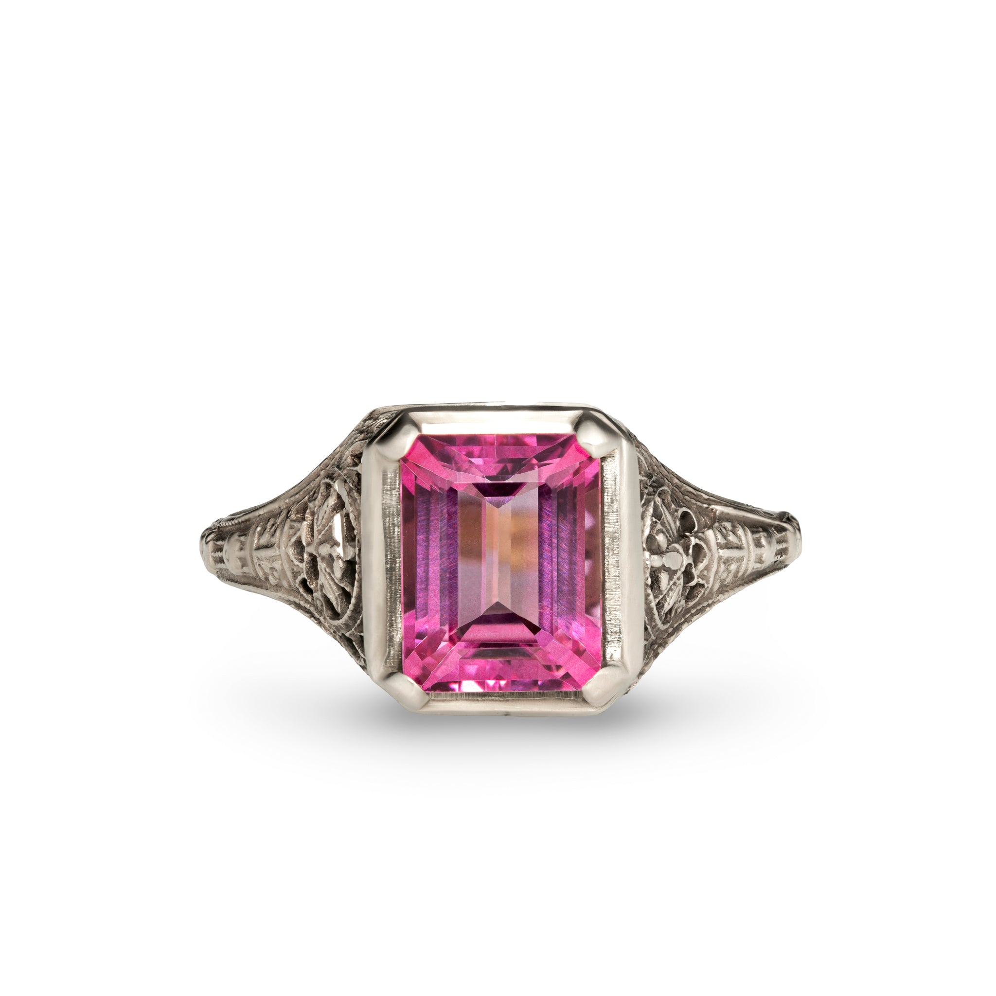 Lilacs represent young love, bluets contentment, and lily of the valley symbolizes a return to happiness. All three flowers and their sentiments come together in this vintage 1920s filigree ring set with a 9x7mm emerald-cut gemstone.