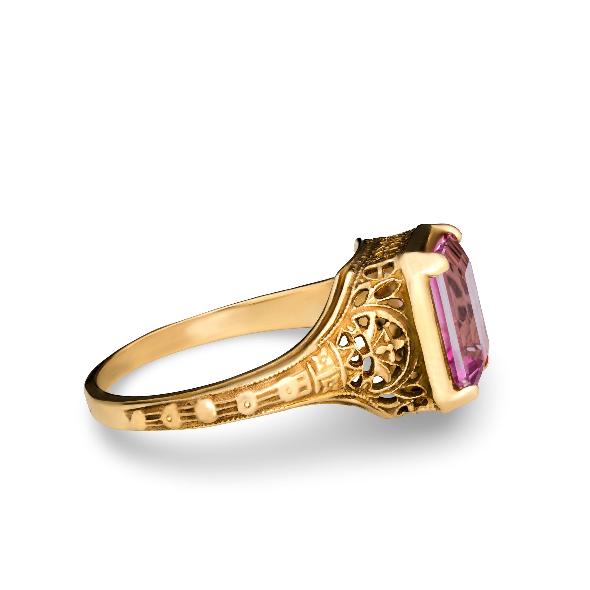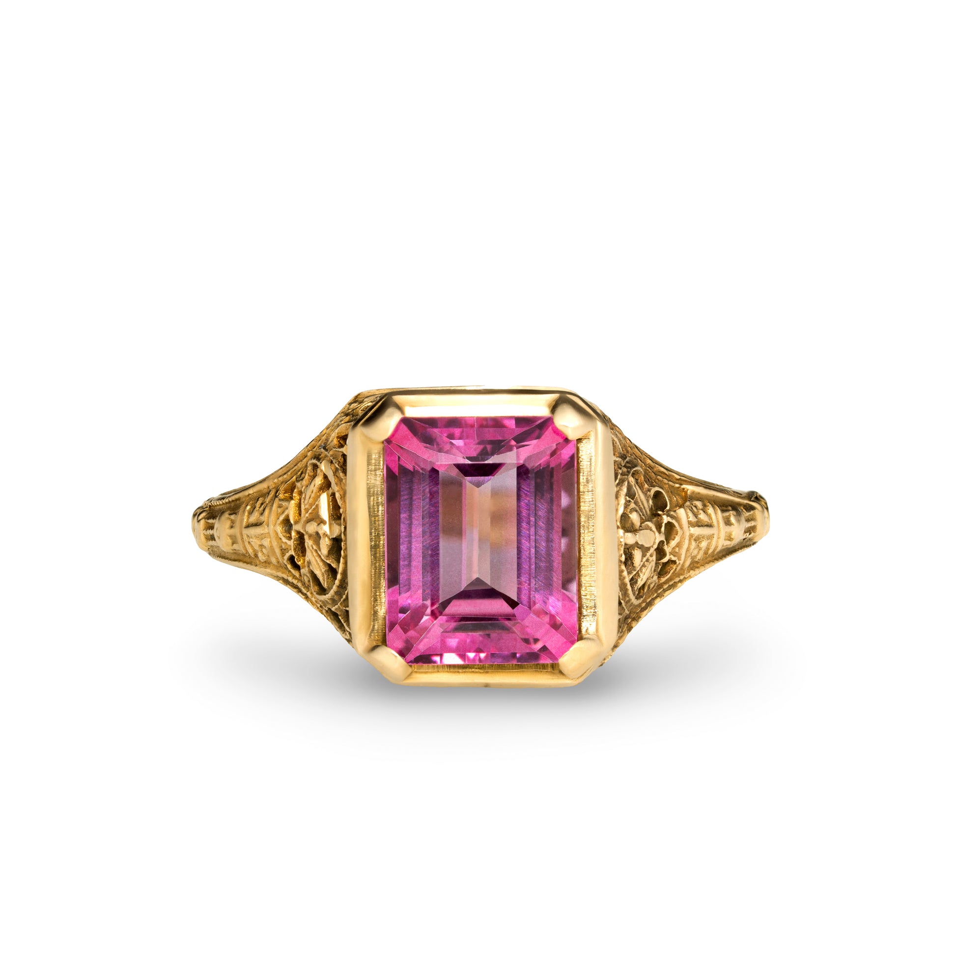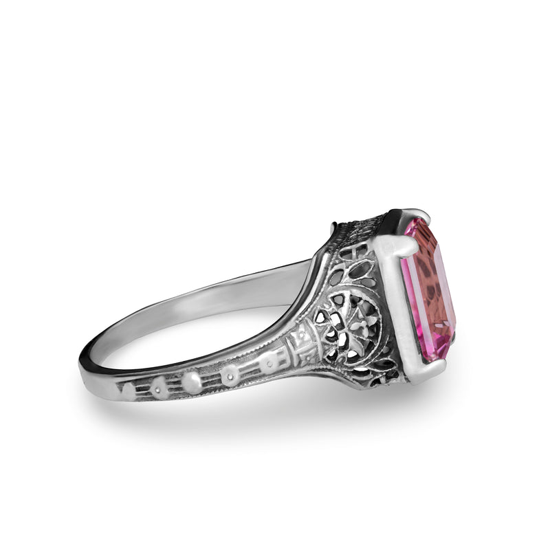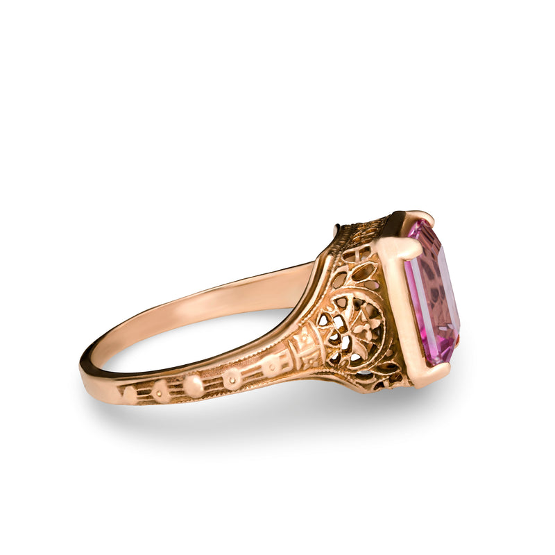 Lilacs represent young love, bluets contentment, and lily of the valley symbolizes a return to happiness. All three flowers and their sentiments come together in this vintage 1920s filigree ring set with a 9x7mm emerald-cut gemstone.