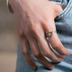 This unique ring holds a 4mm sound gemstone surrounded by intricate filigree work. Its flowing, asymmetrical design evokes the notes of a delicate melody.