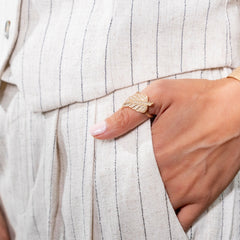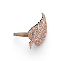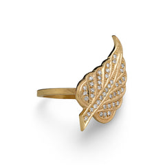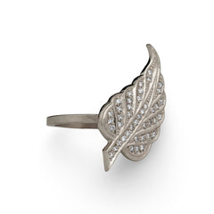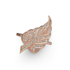 This die-struck leaf ring is set with forty 1mm diamonds. The leaf represents nature as a whole but is also known to symbolize growth and rebirth.