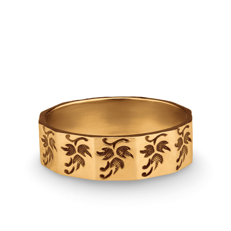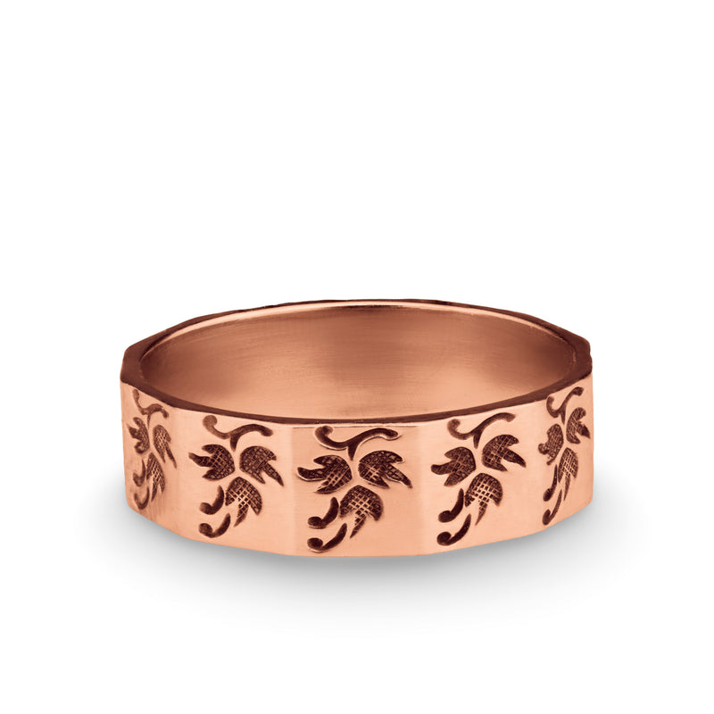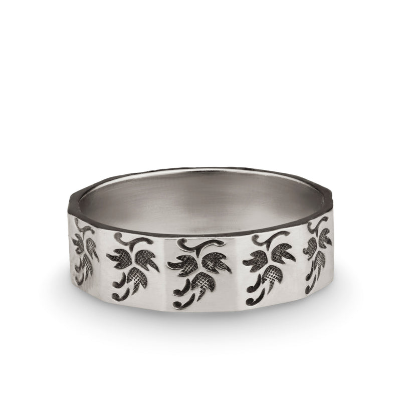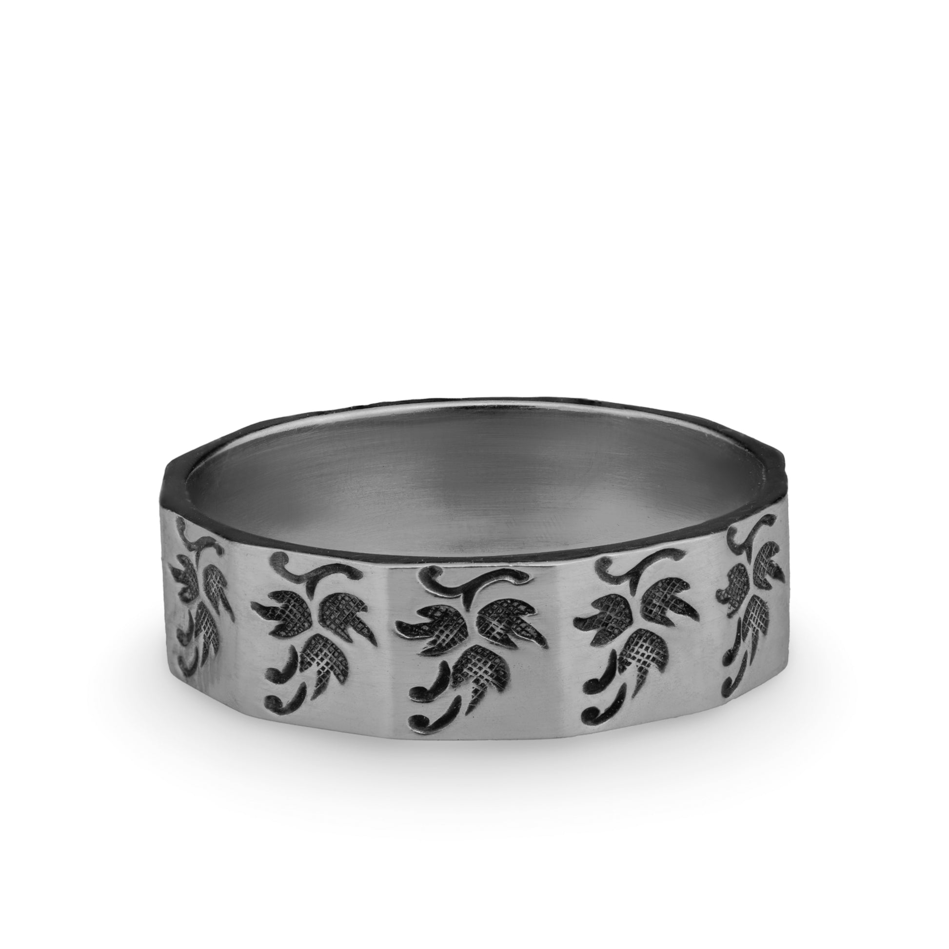 This die-struck, faceted men's vintage band of engraved oak leaves carries with it the symbols of bravery, wisdom, strength and stability.