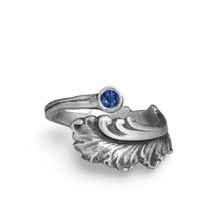 This dramatic sterling silver Victorian spoon ring set with a 3mm Blue Sapphire is defined by a single flourishing plume.