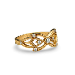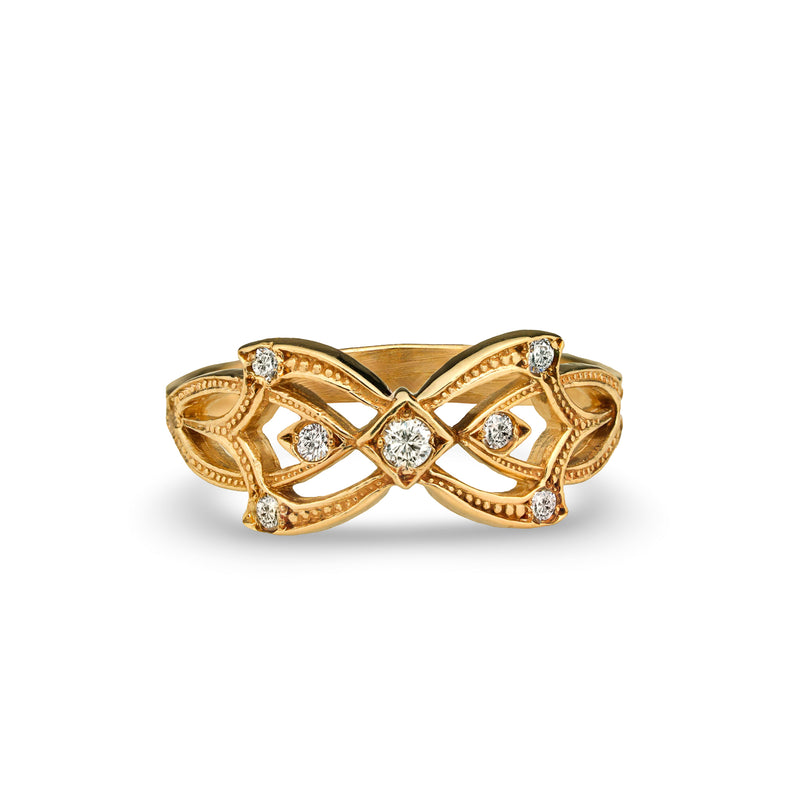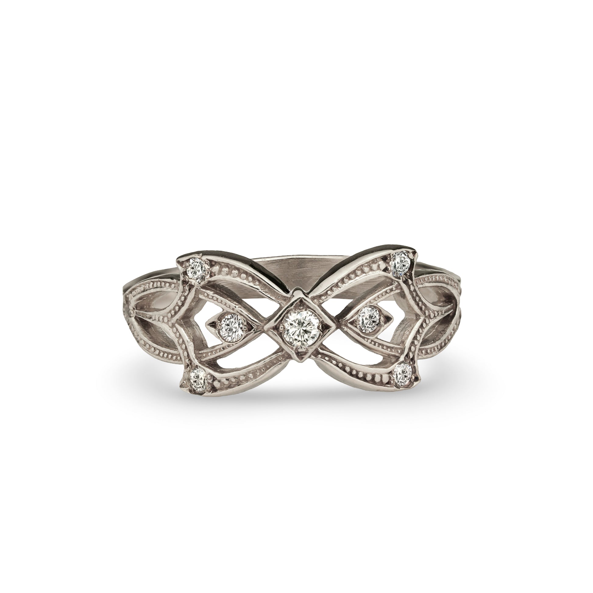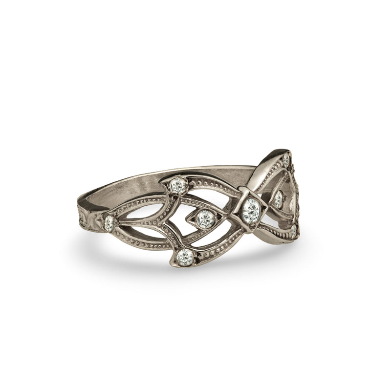 Camille features eight 1.5mm accenting gemstones and a 2mm stone as its centerpiece. Its clean design and open silhouette make this style a versatile, timeless piece for any occasion.