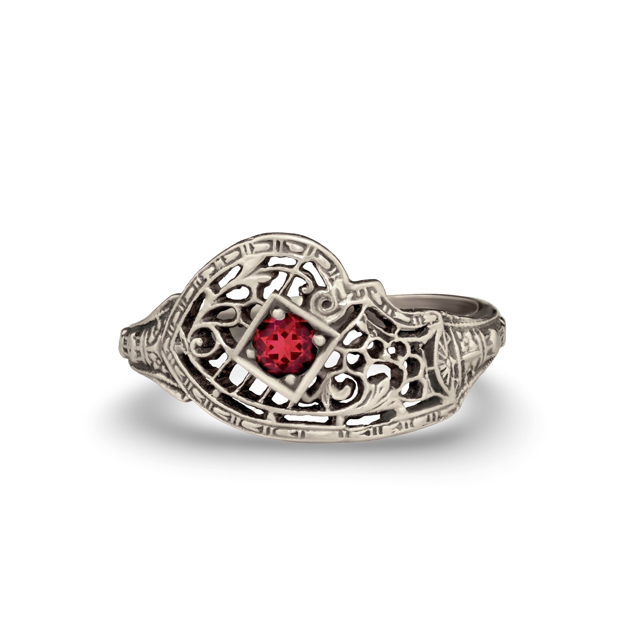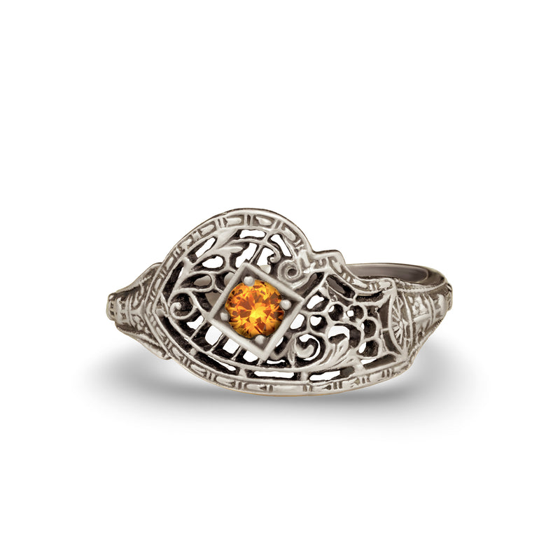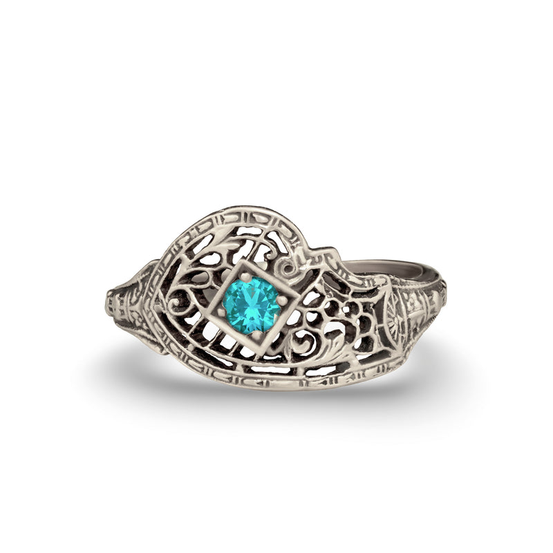 This unique ring holds a 4mm sound gemstone surrounded by intricate filigree work. Its flowing, asymmetrical design evokes the notes of a delicate melody.