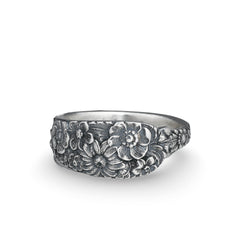 An endless array of enchanting blossoms adorn this sterling silver Victorian spoon ring set.