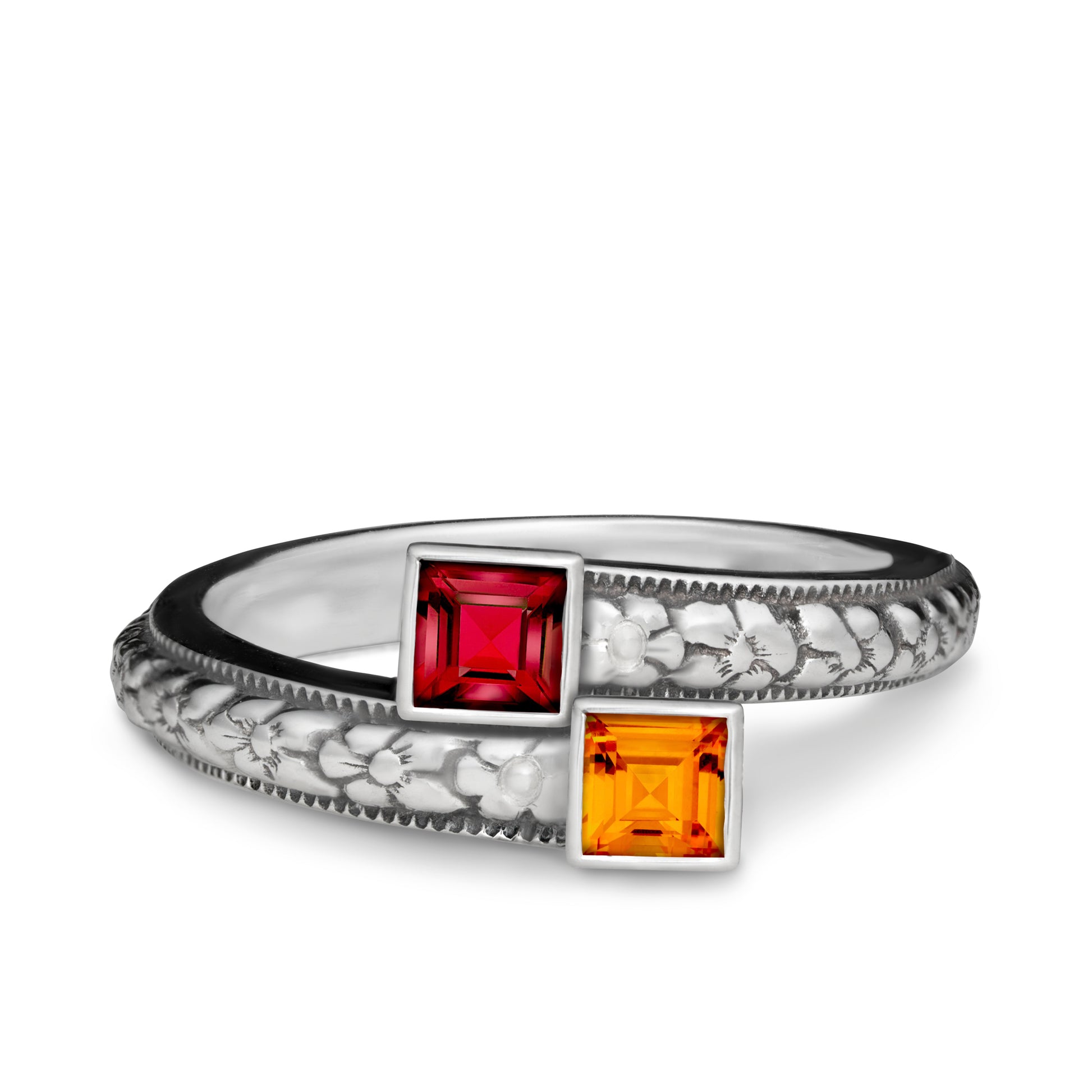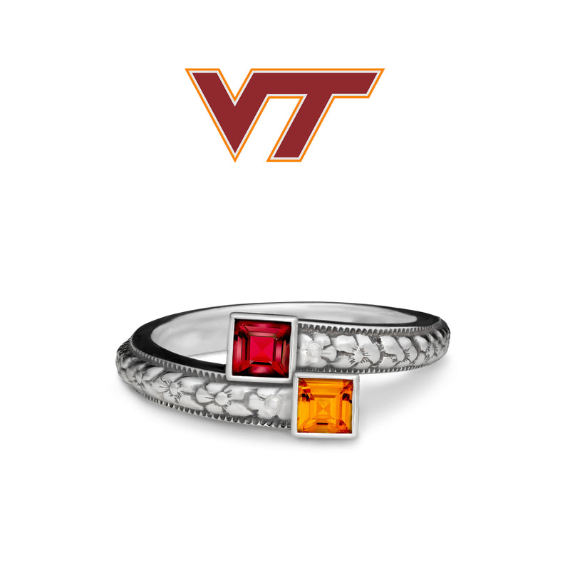 Honor your time at Virginia Tech with The Blacksburg Ring — a handcrafted sterling silver piece designed with meaning and pride. This ring features an ornate floral band and two stunning 4x4mm gemstones: a rich lab-created ruby and a glowing orange citrine, thoughtfully chosen to reflect Tech’s bold school colors.