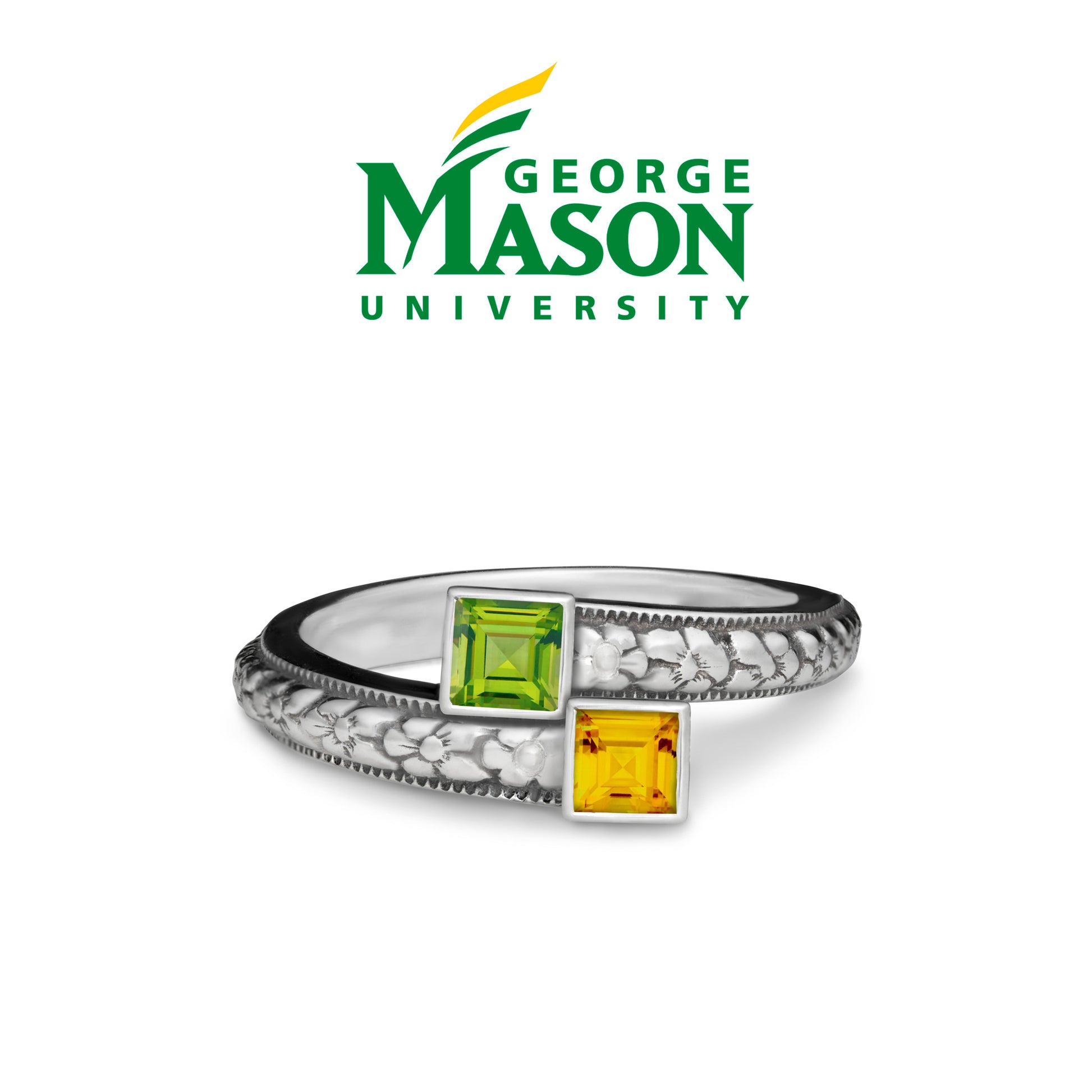 Celebrate your George Mason pride with The Fairfax Ring — a handcrafted sterling silver ring featuring a detailed floral band and two carefully chosen 4x4mm stones: a bright peridot and a golden yellow citrine.