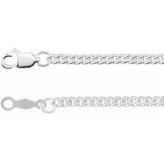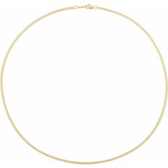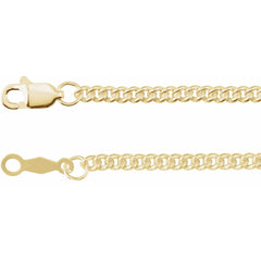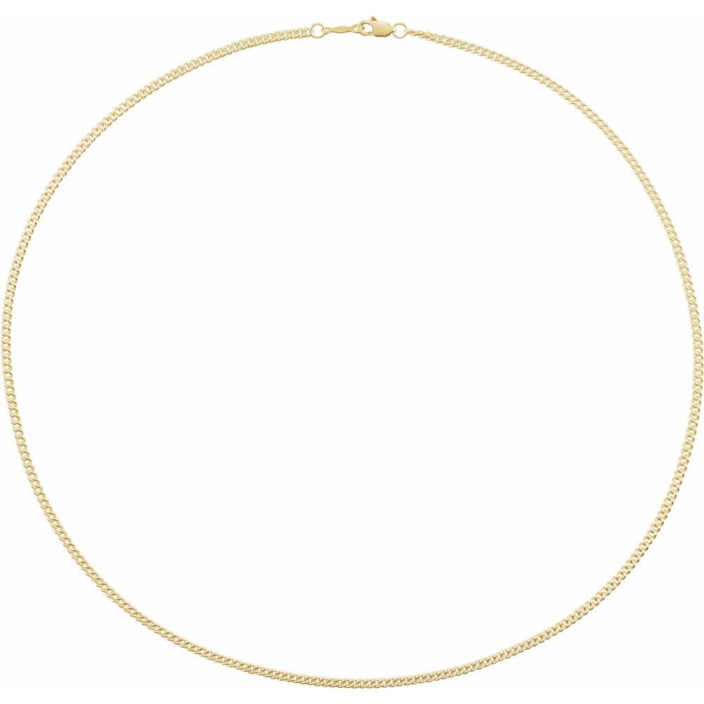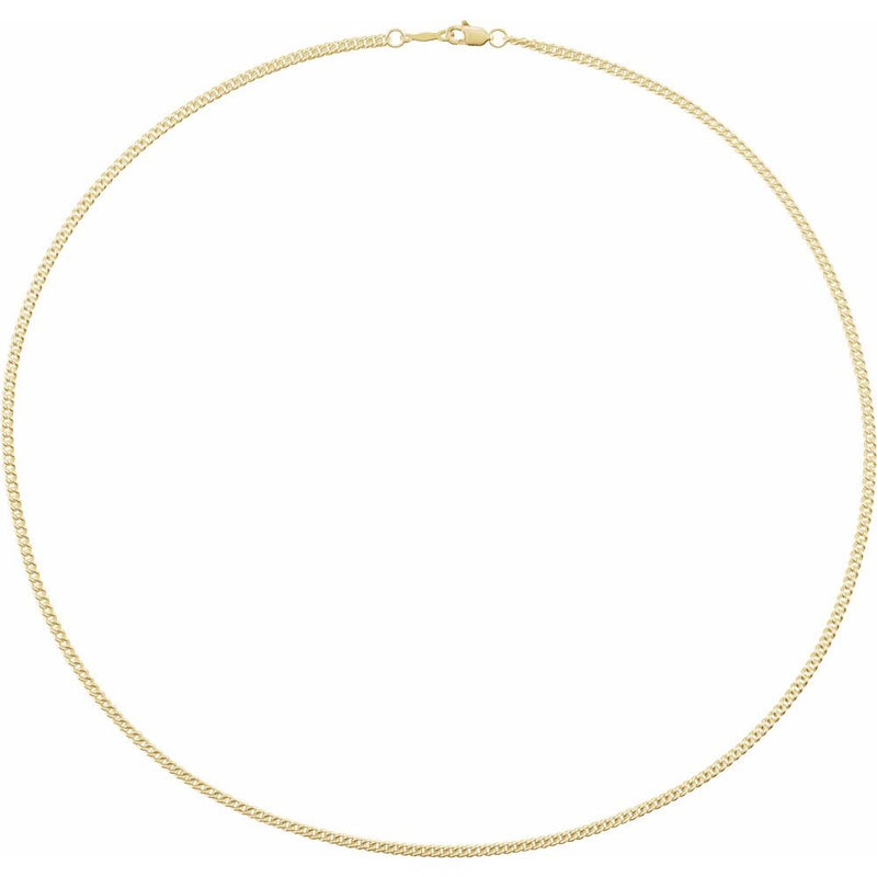 This polished curb chain features flattened, interlocking links that lie smoothly against the skin. With a 2.25mm width, it offers a balanced profile—substantial enough to stand alone yet refined enough for everyday wear