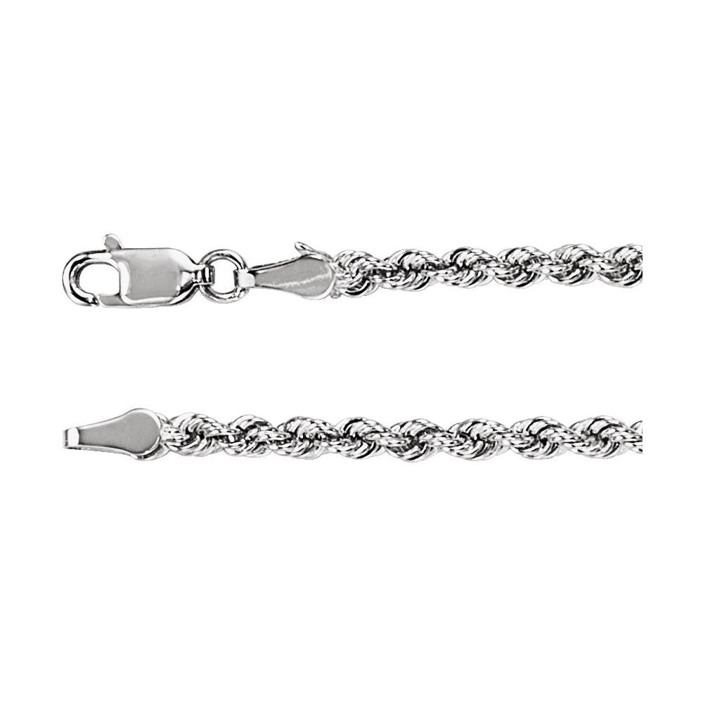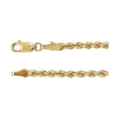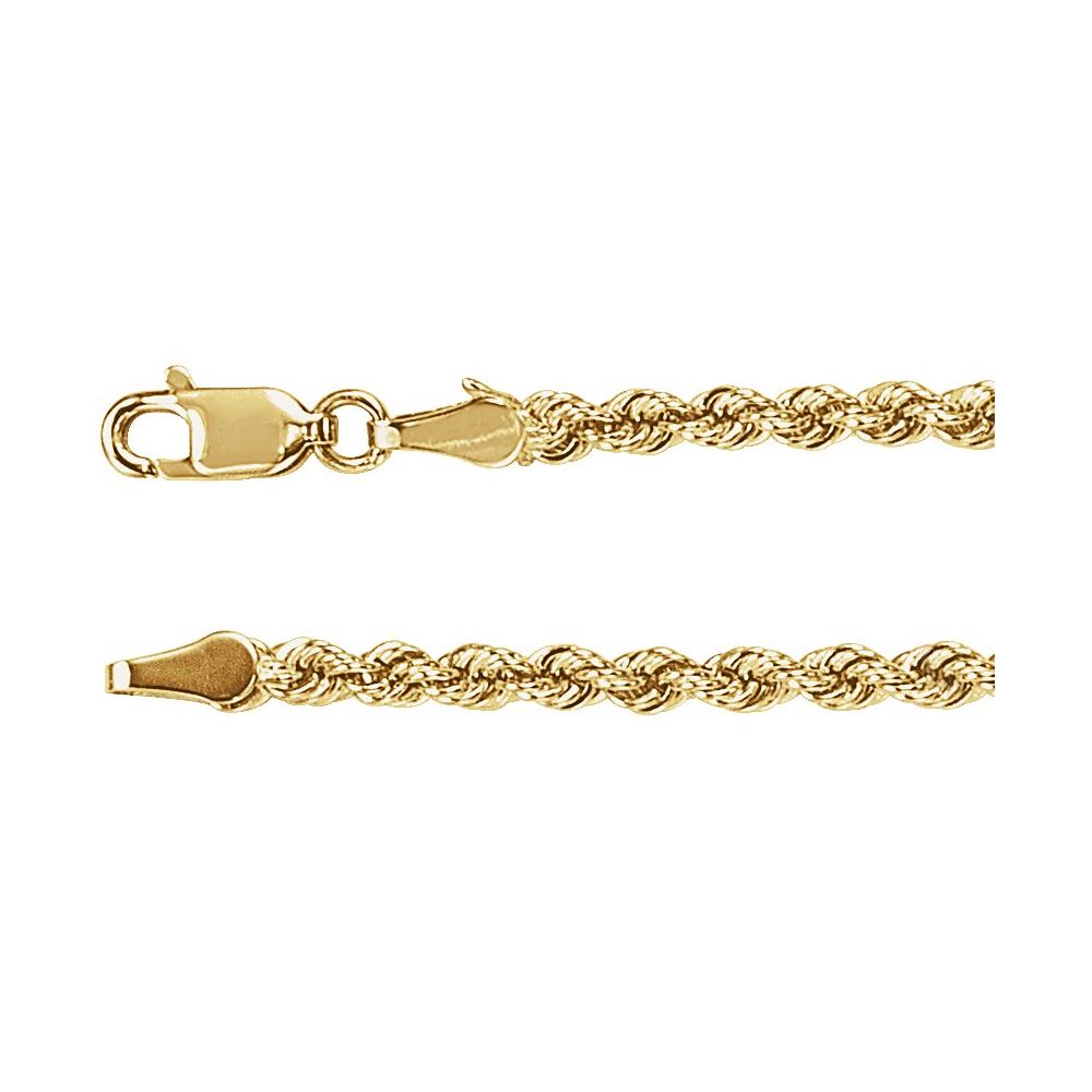 This polished rope chain features tightly twisted links that create depth, texture, and brilliant light reflection. With a bold 3mm width, it offers a substantial presence while remaining refined and comfortable for everyday wear. Finished with a secure lobster clasp, it’s designed to stand alone or anchor a favorite pendant.