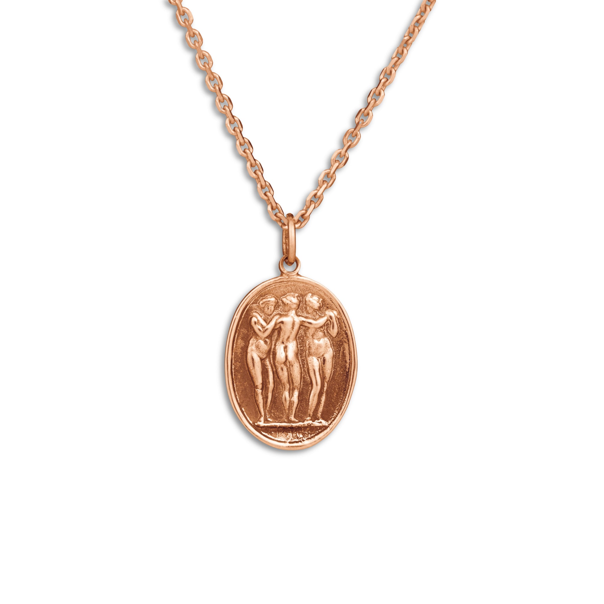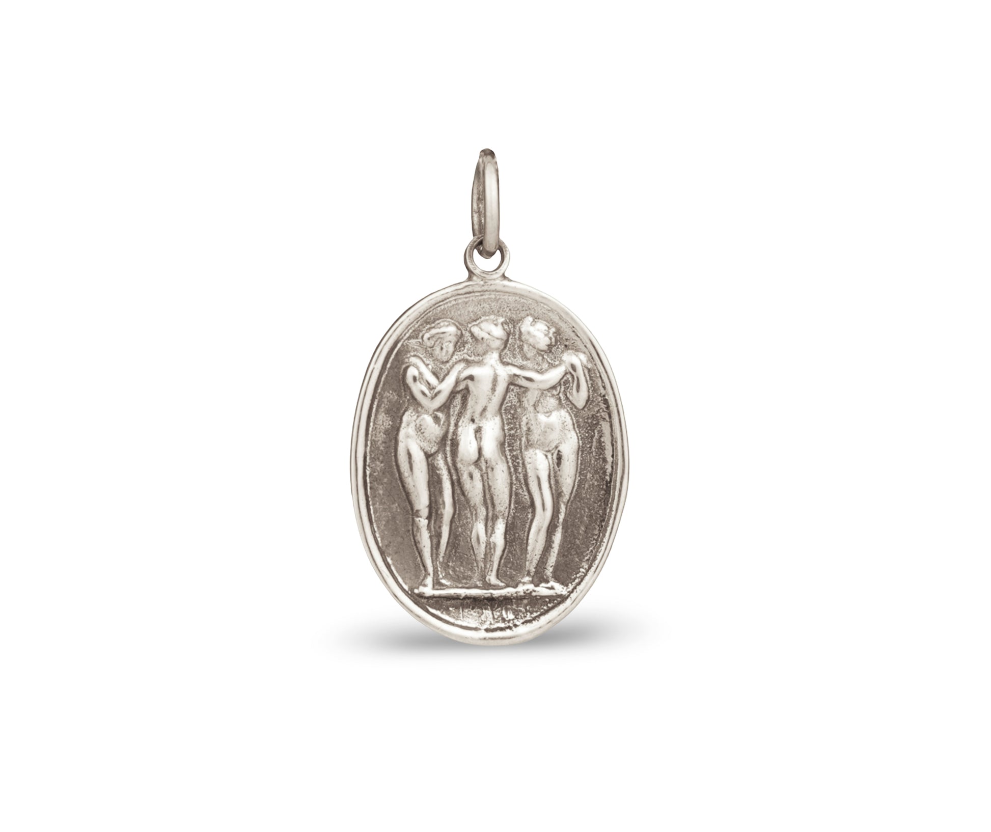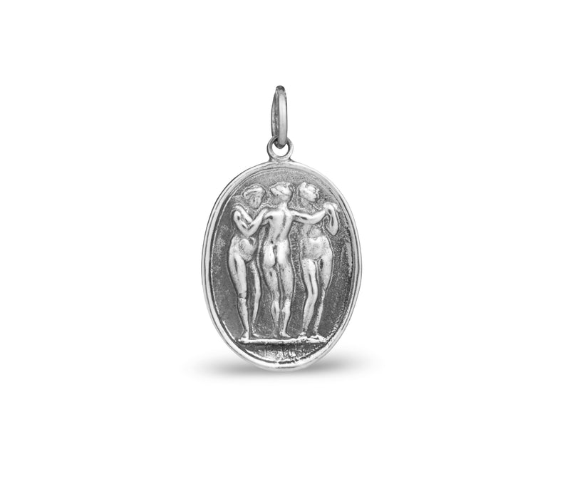 Three Graces of Greek mythology, personify grace, beauty, and joy are carved into this vintage pendant.