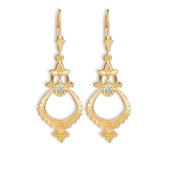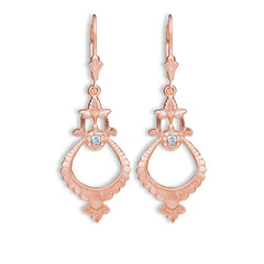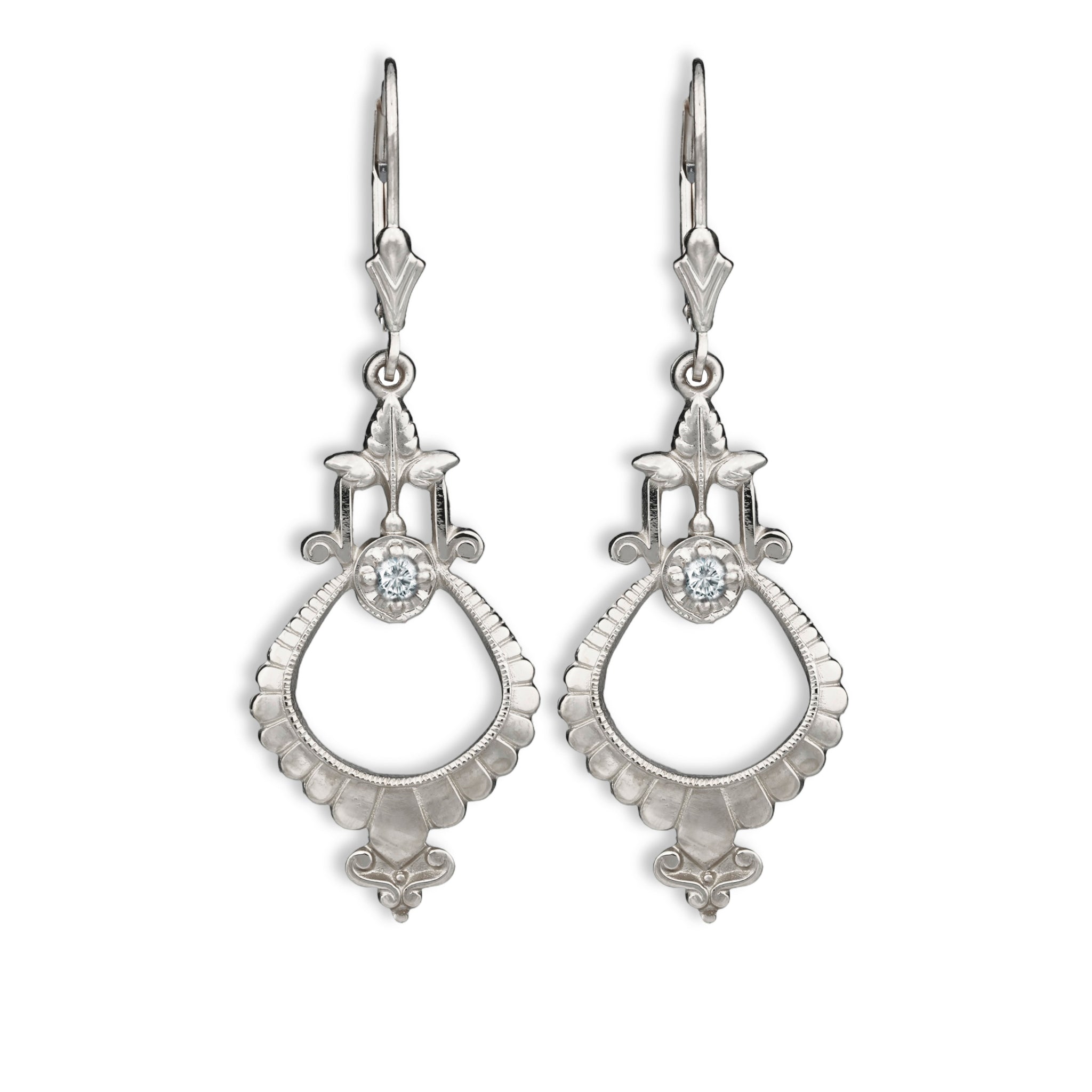 These intricate earrings hold a 1.5mm round gemstone with an open, lightweight design. This design also features birch leaves, which were often associated with Venus, the Roman goddess of love and beauty.